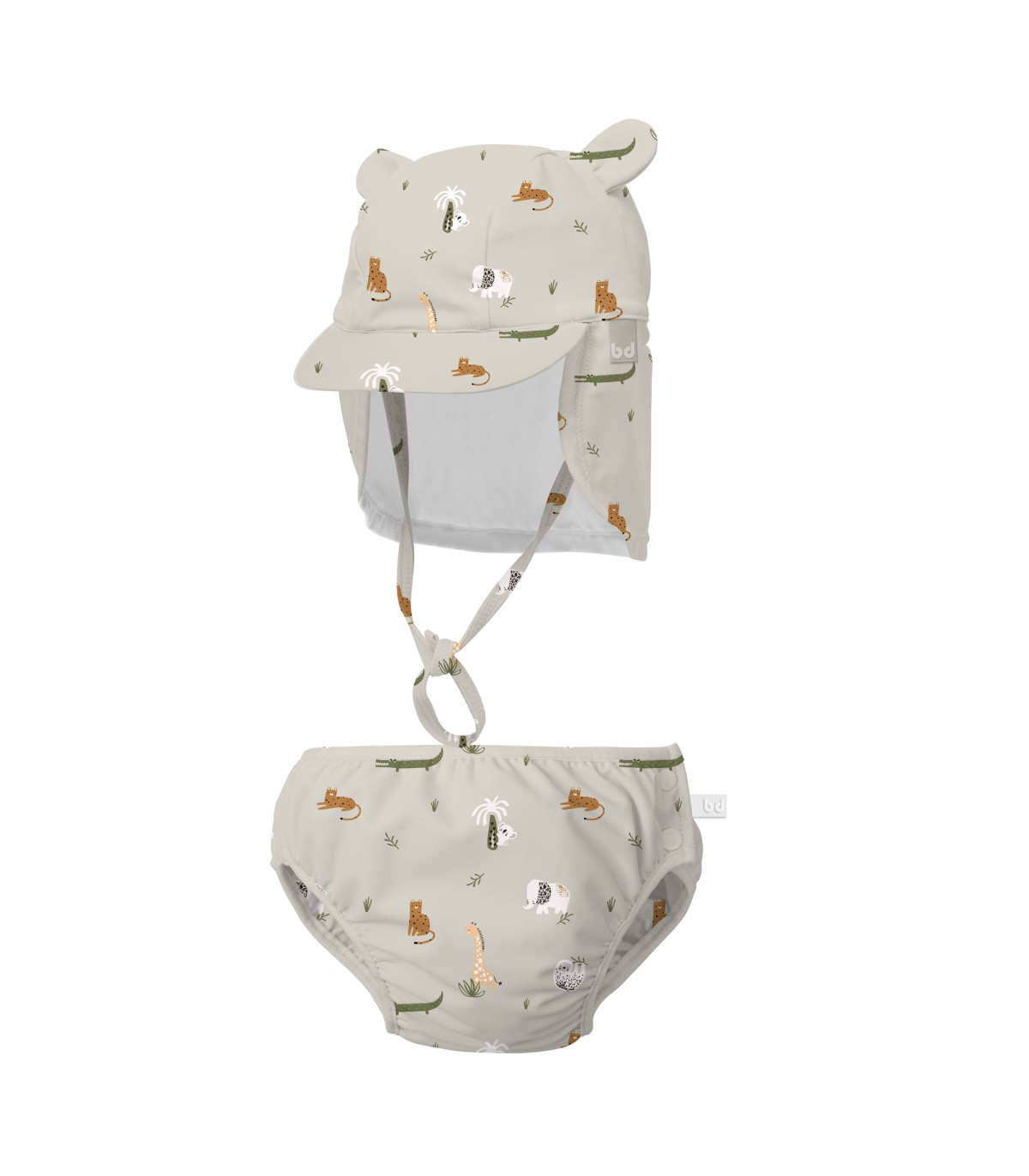 El pack incluye: Bañador pañal + gorra con protección solar a juego.