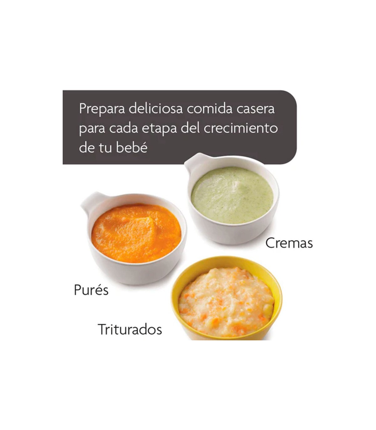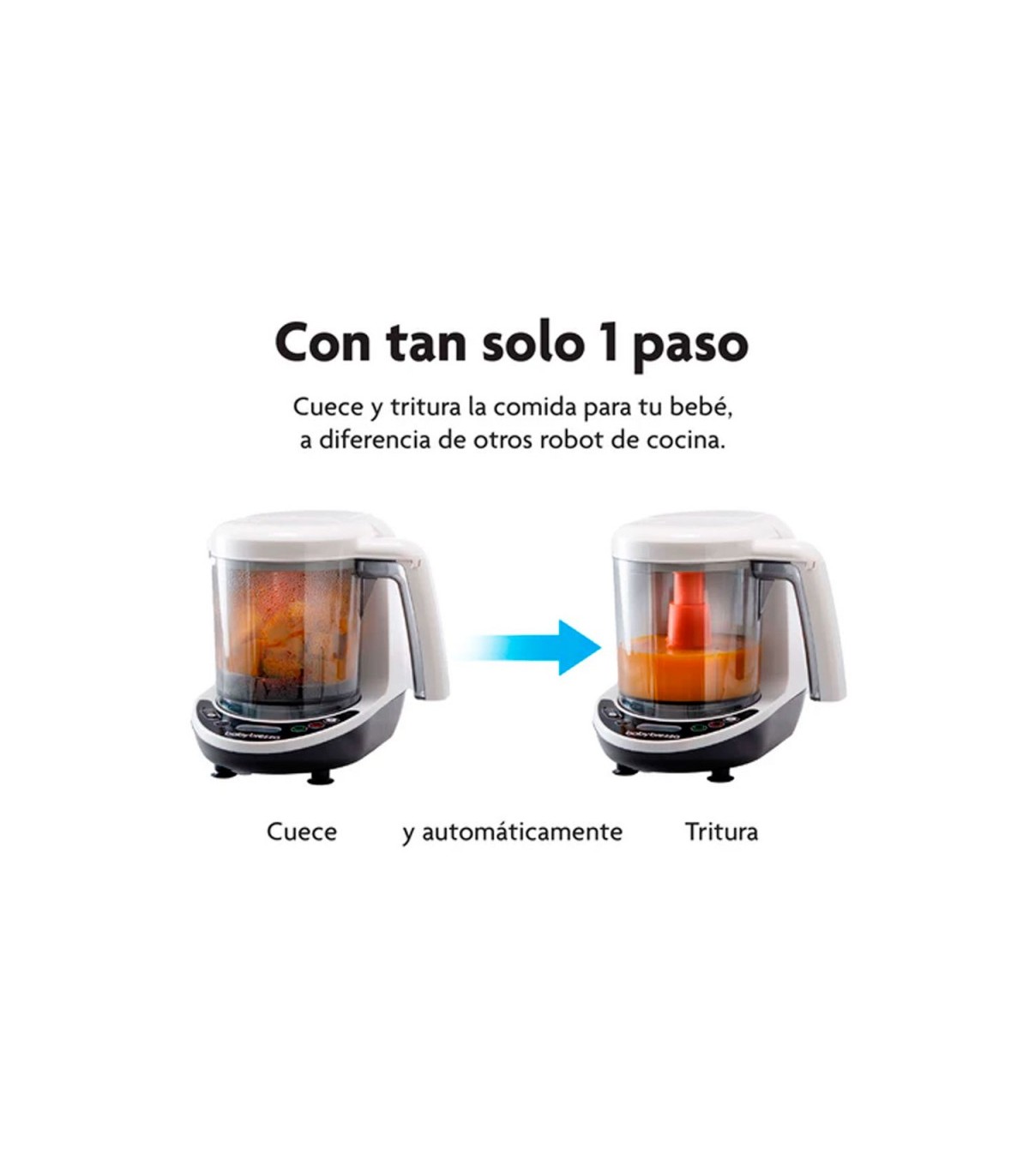 - 4 aspas de acero inoxidable mezclan los alimentos en la textura perfecta para cada fase del desarrollo alimenticio de tu bebé.