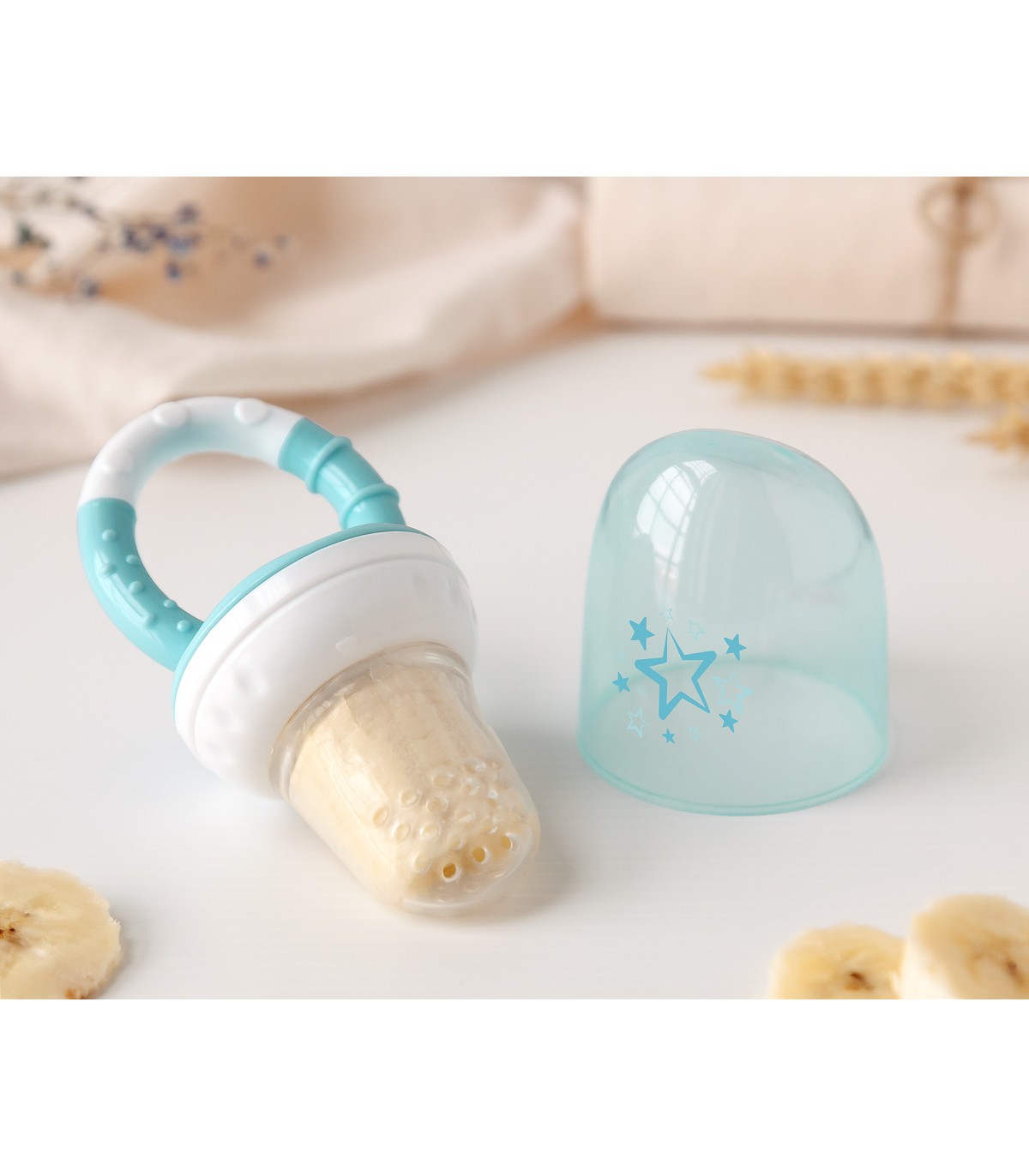La red alimentadora en silicona es ideal para favorecer la transición a los alimentos sólidos y la independencia del bebé. A la base, de fácil agarre para las manitas del niño, ajustaremos el depósito perforado en silicona, en el interior del cual vamos a poder alojar trozos grandes de fruta fresca, verdura, galletas, pan, queso u otros alimentos.