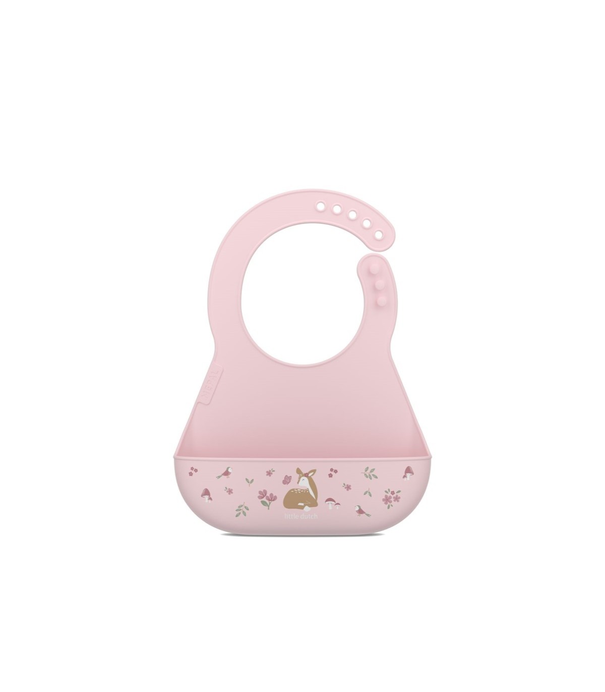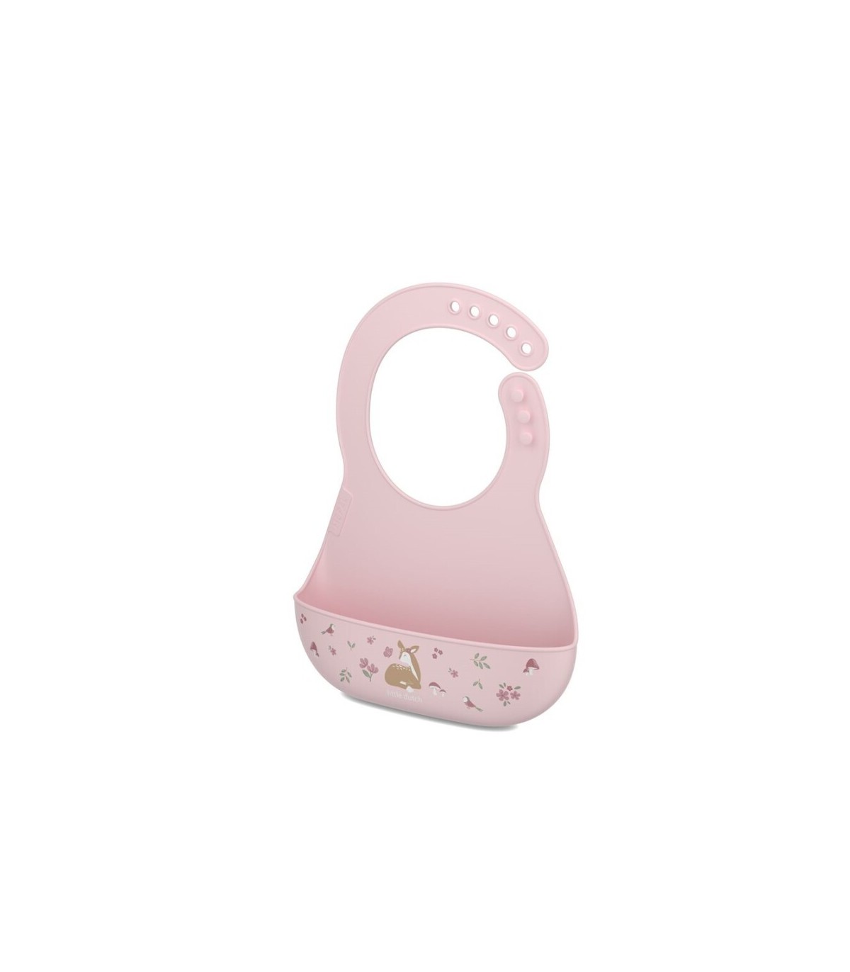 Babero de silicona de la colección MIO con cierre ajustable en el cuello y bolsillo profundo para atrapar la comida. Fácil de limpiar y transportar.