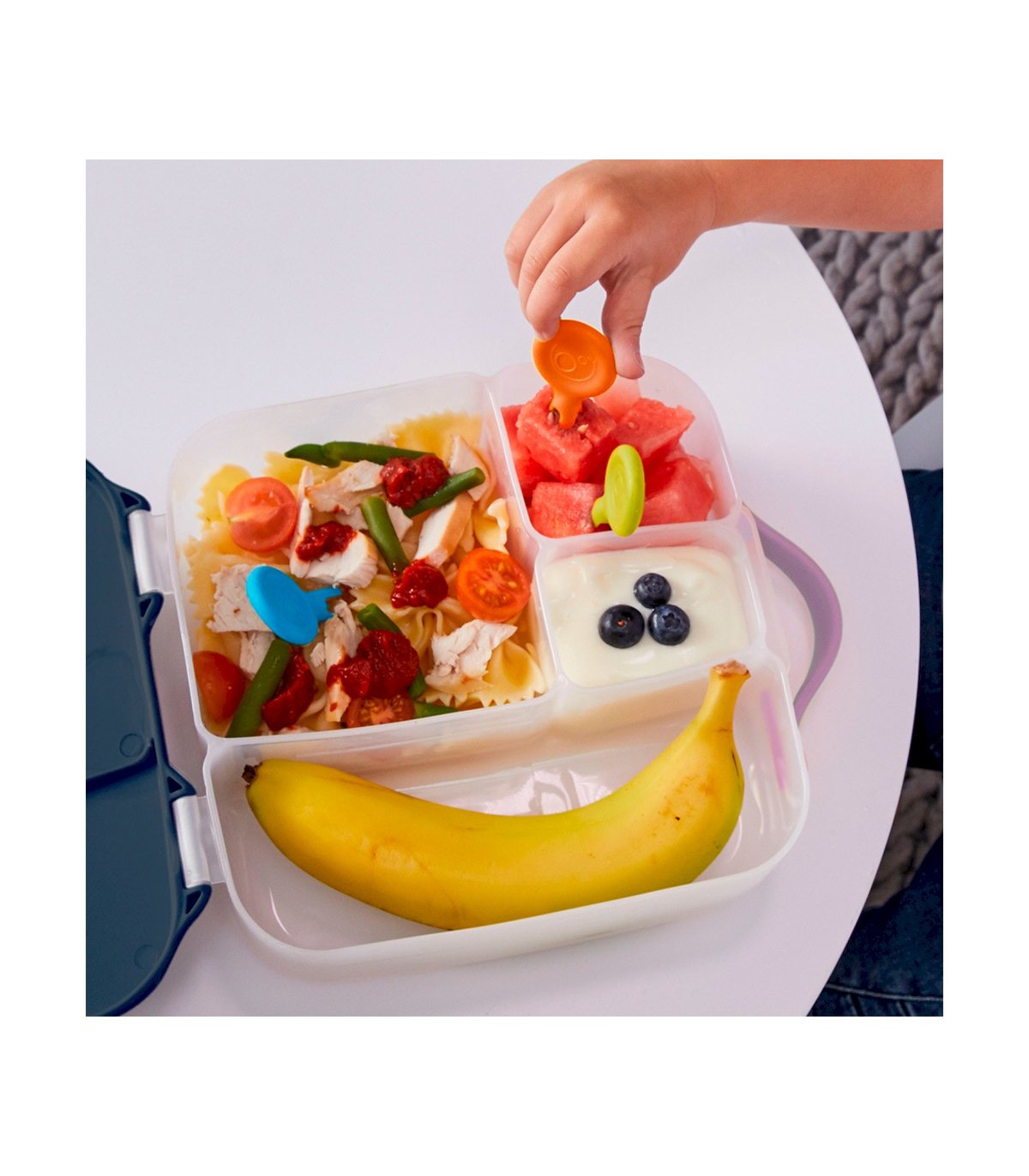 Set de 3 unidades de mini tenedores para disfrutar con frutas, verduras y carne de forma limpia y segura. Sus exclusivas púas redondeadas son ideales para pinchar alimentos y comer de manera segura. El mango grande facilita el agarre y ofrece control al comer. Además, su diseño compacto hace que quepan perfectamente en la mayoría de fiambreras y depósitos B.Box, ya sea para la escuela o para llevar contigo a cualquier lugar.