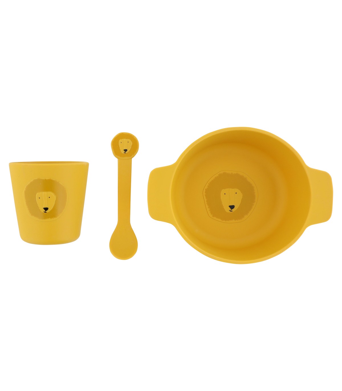 Este juego de comedor de silicona suave al tacto diseñado para los más pequeños es un regalo divertido. Contiene todo lo que necesitan para comer: una cuchara, un bol y una taza con simpáticas caritas de animales.