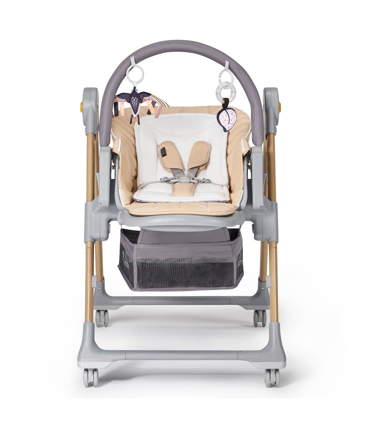 - Tiene un asiento amplio y suave con un inserto de doble cara para el asiento y cinturones de 5 puntos que le brindan al niño la seguridad mientras juega. Gracias a esto el bebé podrá acompañar a los papás no solamente en las comidas, sino también durante las tareas diarias. Para que el niño se sienta más a gusto, el asiento es ajustable en 3 niveles, incluyendo la posición tumbada. La posición tumbada va a ser perfecta para descansar y la semitumbada: para jugar, ya que la hamaca tiene un arco ajustable con juguetes: una hoja de peluche con sonajero y una golondrina con cintas de colores. La hamaca para bebé tiene también un reposapiés ajustable para que los piecitos pequeños tengan el apoyo adecuado.
