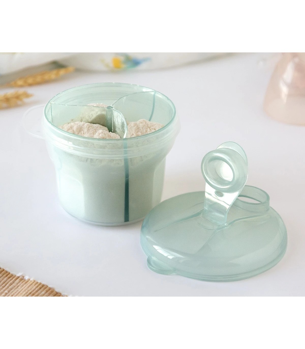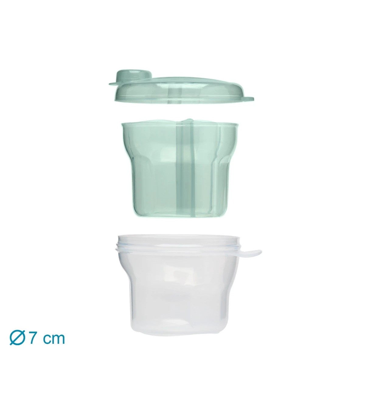 La tapa del recipiente se enrosca e incluye un pequeño tapón que permitirá verter la leche en polvo directamente en el biberón con comodidad y rapidez, simplemente girando la tapa sobre el recipiente a vaciar y volcando en el biberón o taza con el taponcito descubierto.