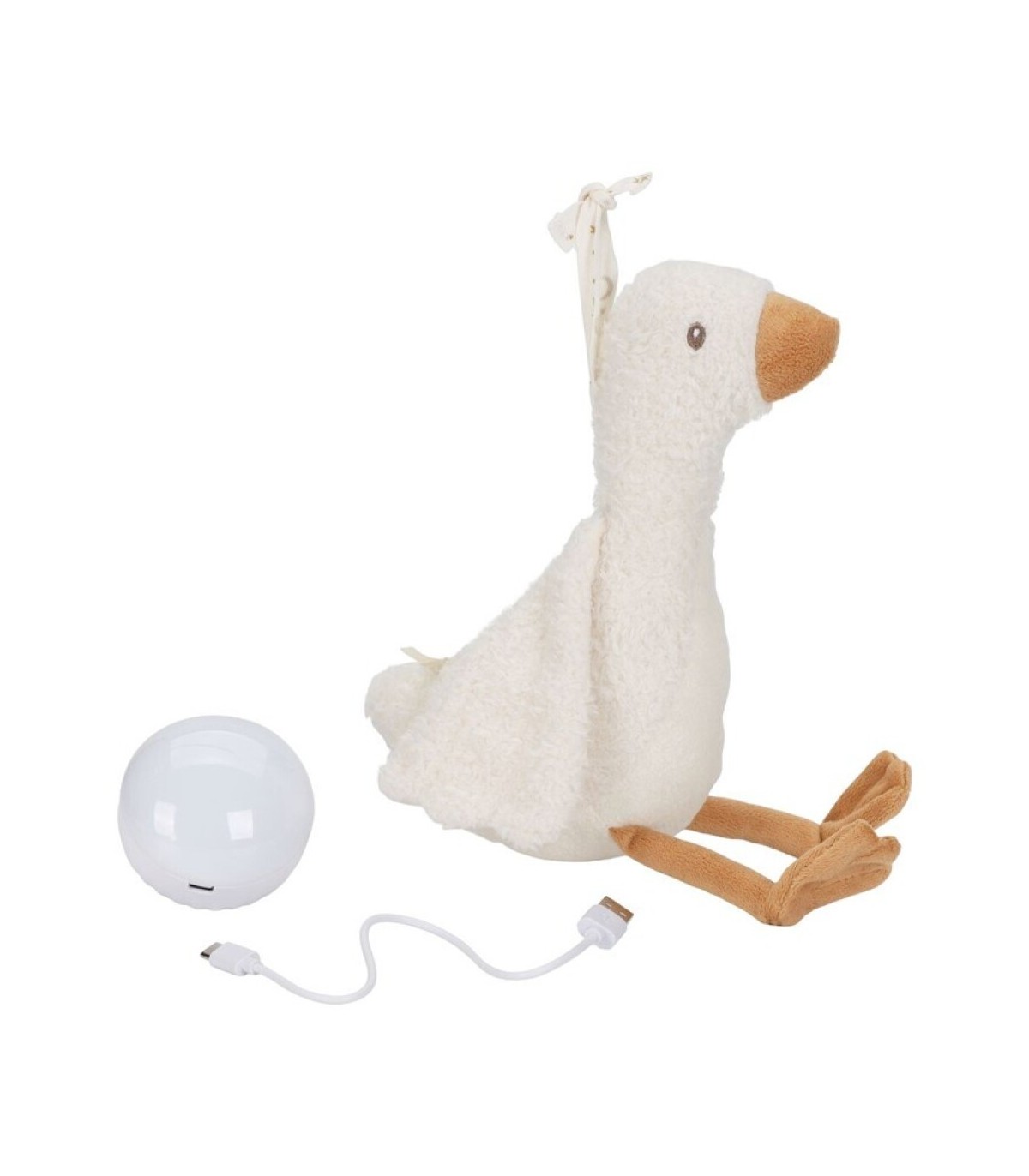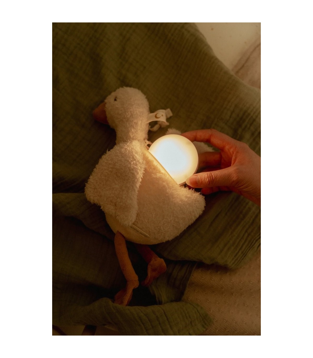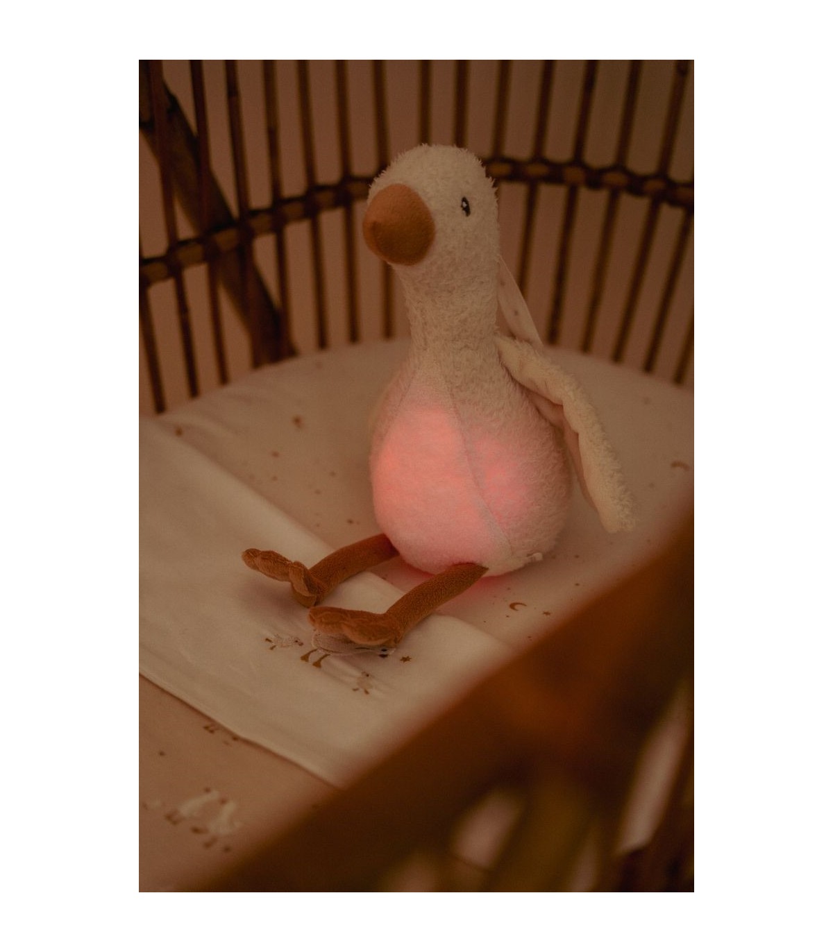 Un amigo para dulces sueños. La Oca con Luz y Sonido ofrece amor, consuelo y seguridad con su suave luz y sonidos relajantes, como una suave melodía, latidos del corazón y sonidos del útero. Esta adorable oca ayuda a tu bebé a relajarse y a conciliar el sueño, y está hecho de tela suave y mimosa. Un compañero reconfortante para el día y la noche.