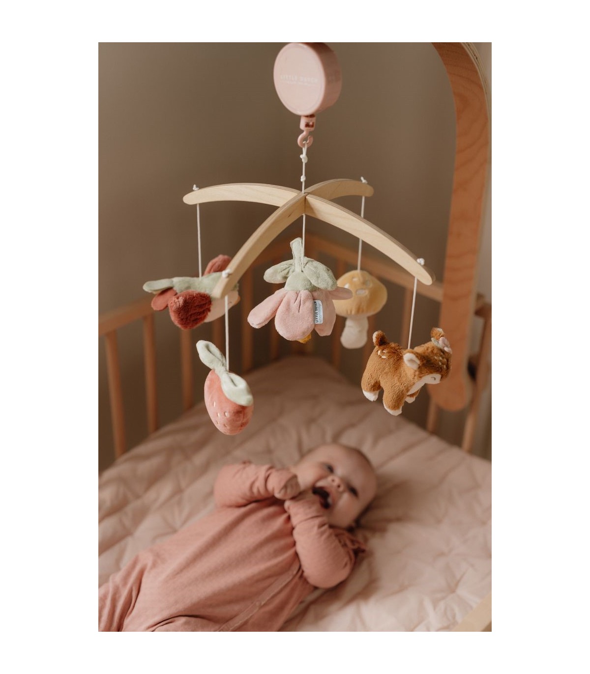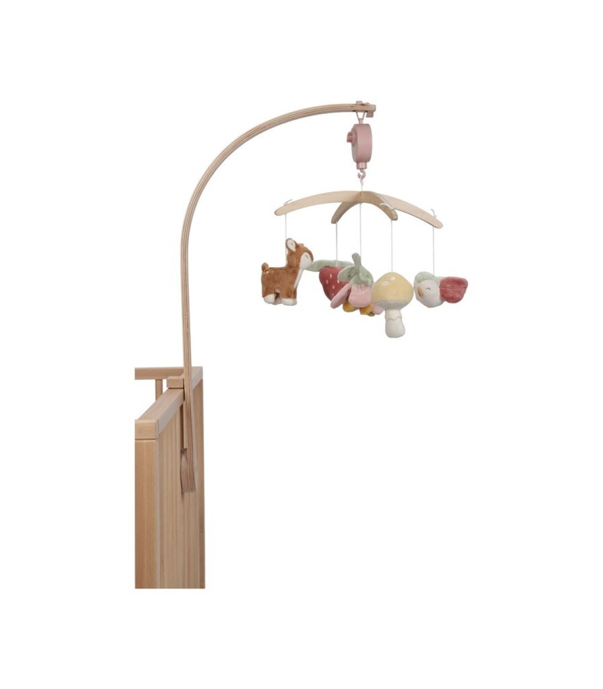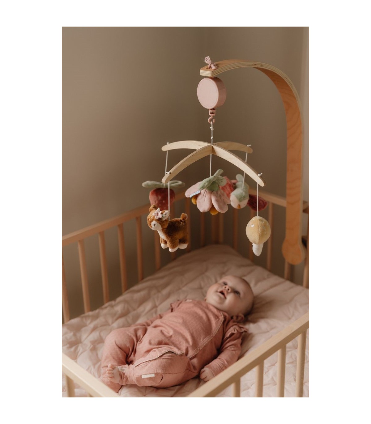 Sigue el sonido y observa cómo giran el cervatillo y el pajarito. Este simpático móvil musical de madera tiene un efecto relajante en los bebés gracias a la dulce canción de cuna. Cuenta con cinco juguetes colgantes diferentes para mirar de la colección Fairy Garden: un cervatillo, una fresa, una flor, una seta y un pájaro. Mientras tu pequeño disfruta del movimiento de cada juguete, el móvil musical estimula el desarrollo visual. El móvil musical es adecuado desde el nacimiento y es fácil de colocar en la cuna o el parque infantil. ¡ADVERTENCIA! Coloca este juguete fuera del alcance del niño. Para evitar posibles lesiones por enredos, retira este juguete cuando el niño empiece a intentar ponerse de rodillas en posición de gateo. Requiere montaje por parte de un adulto.