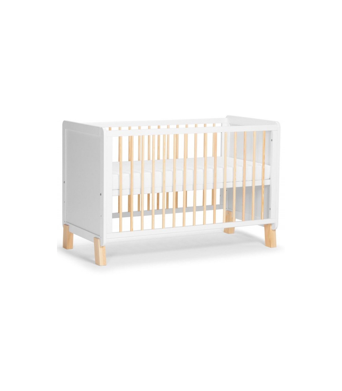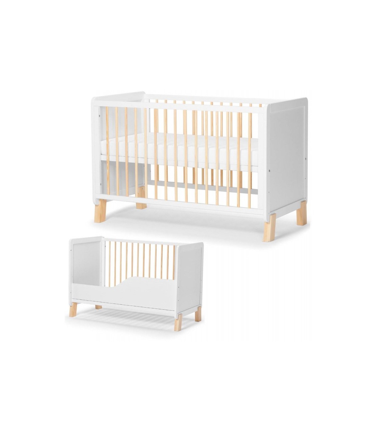 La unión de los laterales completos y los laterales construidos de barrotes le dan un toque ligero a la cuna. Los barrotes están hechos de madera natural de pino y han sido pintados con el esmalte transparente y seguro.