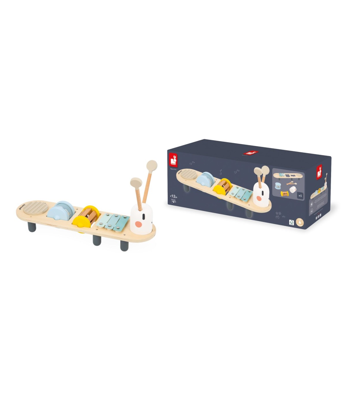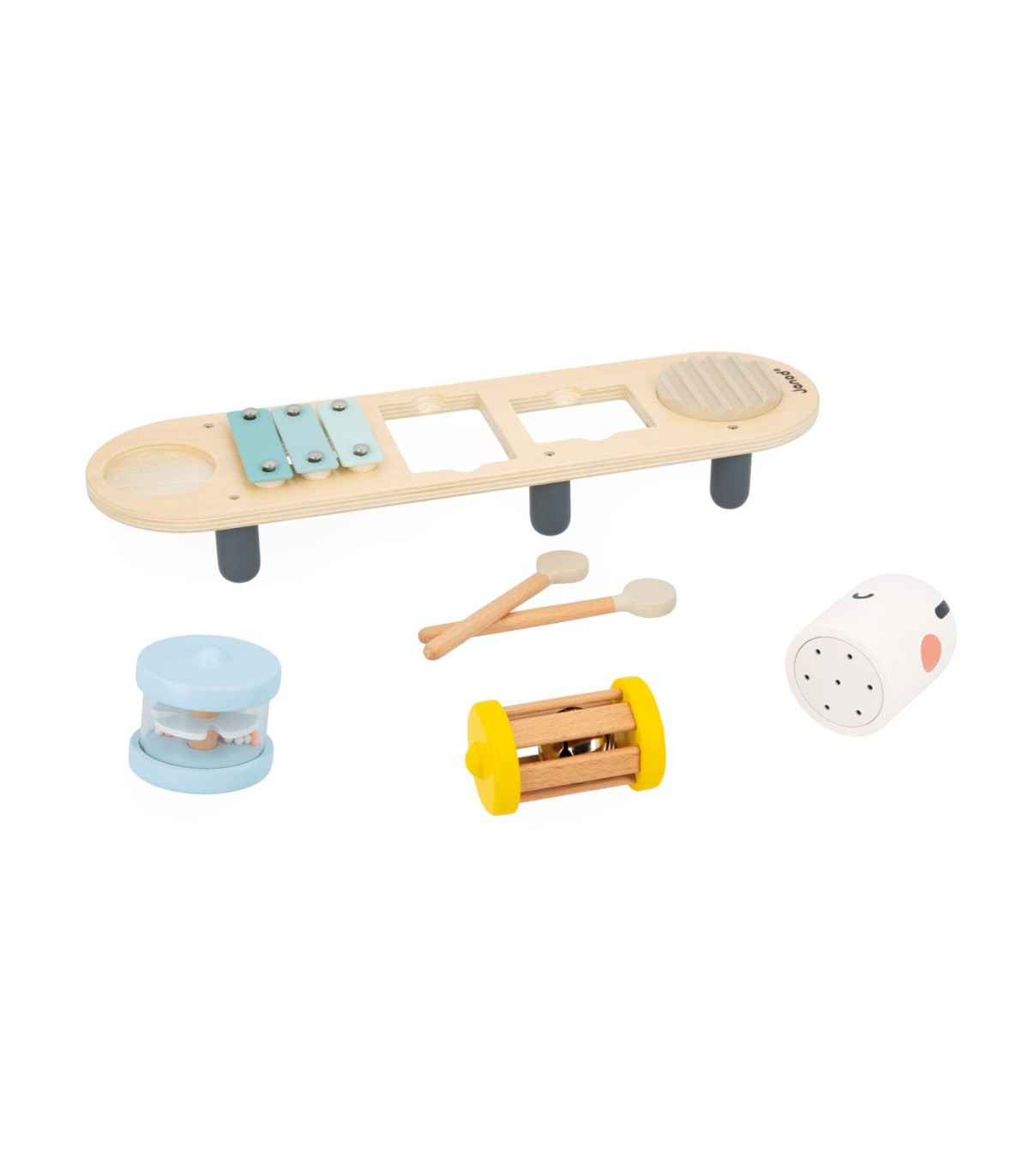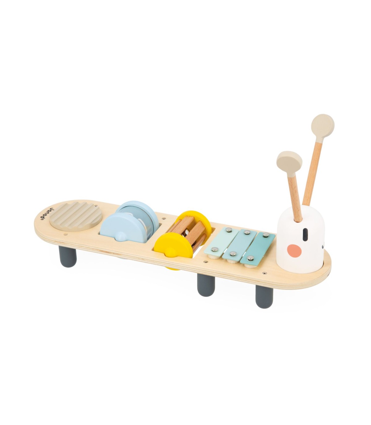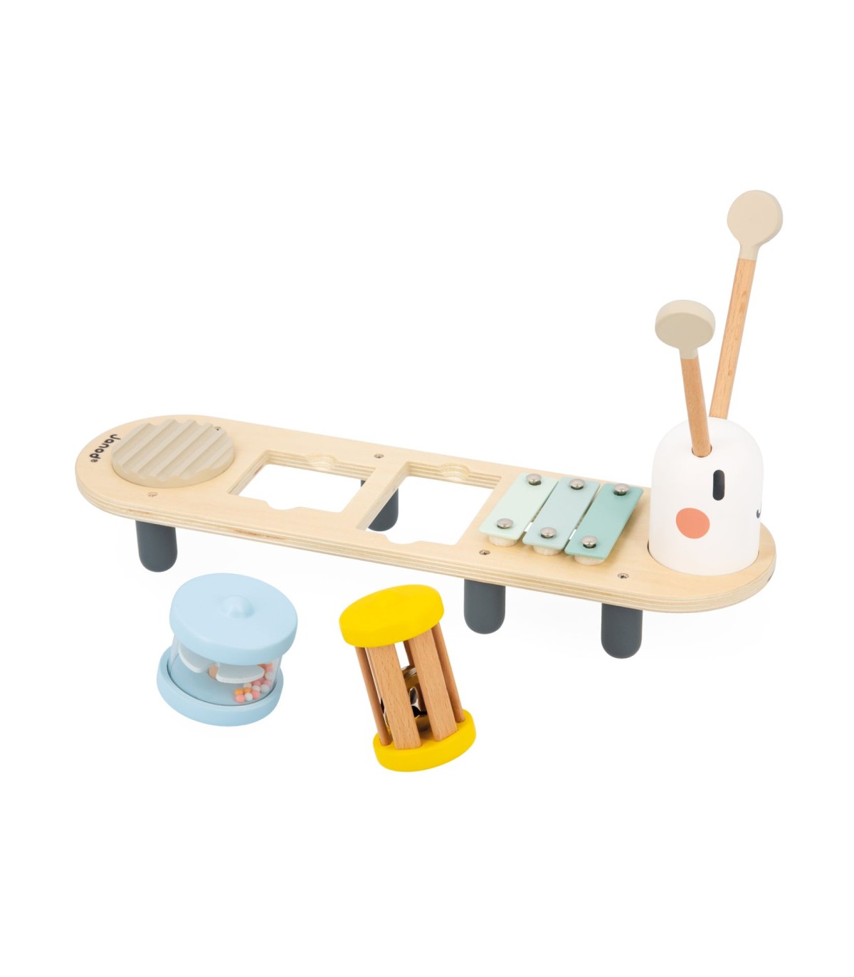 ¡Que se te oiga con esta oruga musical! Descubre nuestra mesa de actividades sonoras con forma de oruga, un juguete de primera infancia diseñado para bebés a partir de 12 meses. ¡Esta colorida oruga no solo es adorable, sino que además es una auténtica orquesta en sí misma! Con las 5 actividades sonoras que incluye, el niño puede explorar y crear su propia sinfonía. Hay unas maracas para marcar el ritmo, un xilófono para tocar melodías, un cascabel para poner un toque de ternura, un palo de lluvia para imitar el relajante sonido de la lluvia y un rascador con una textura sonora única. Las baquetas, prácticas y bien pensadas, se guardan en la cabeza de la oruga para que no se pierdan. Además, los 2 sonajeros y la cabeza son extraíbles, lo que ofrece aún más posibilidades de juego: el bebé puede agarrar el juguete musical que quiera y luego aprender a volver a ponerlo en su sitio del banco de estímulo. Este juguete de primera infancia no solo es divertido, sino que además es educativo y beneficioso para el desarrollo del bebé. Le ayuda a ejercitar la agudeza auditiva, permitiéndole distinguir y comprender diferentes sonidos. Además, le permite trabajar la motricidad manipulando y agitando los pequeños instrumentos. ¡Imagíneselo dirigiendo su propio concierto con su oruga musical! Esta oruga de actividades, perteneciente a nuestra colección Sweet Cocoon, está hecha de madera con certificado FSC™.