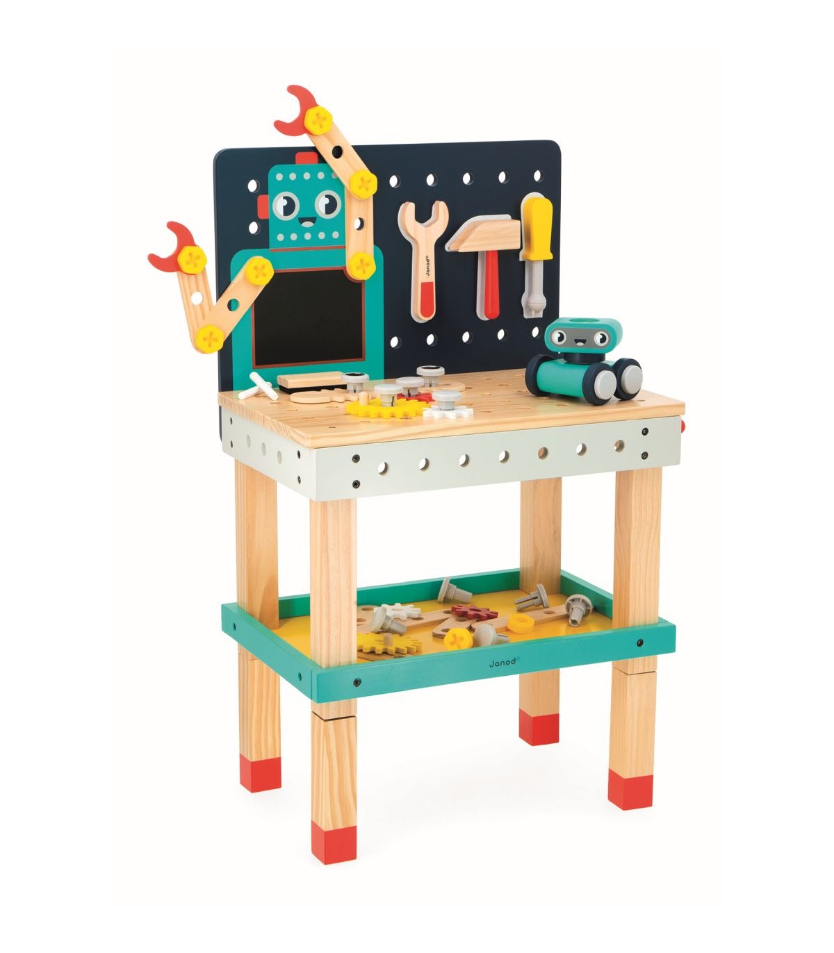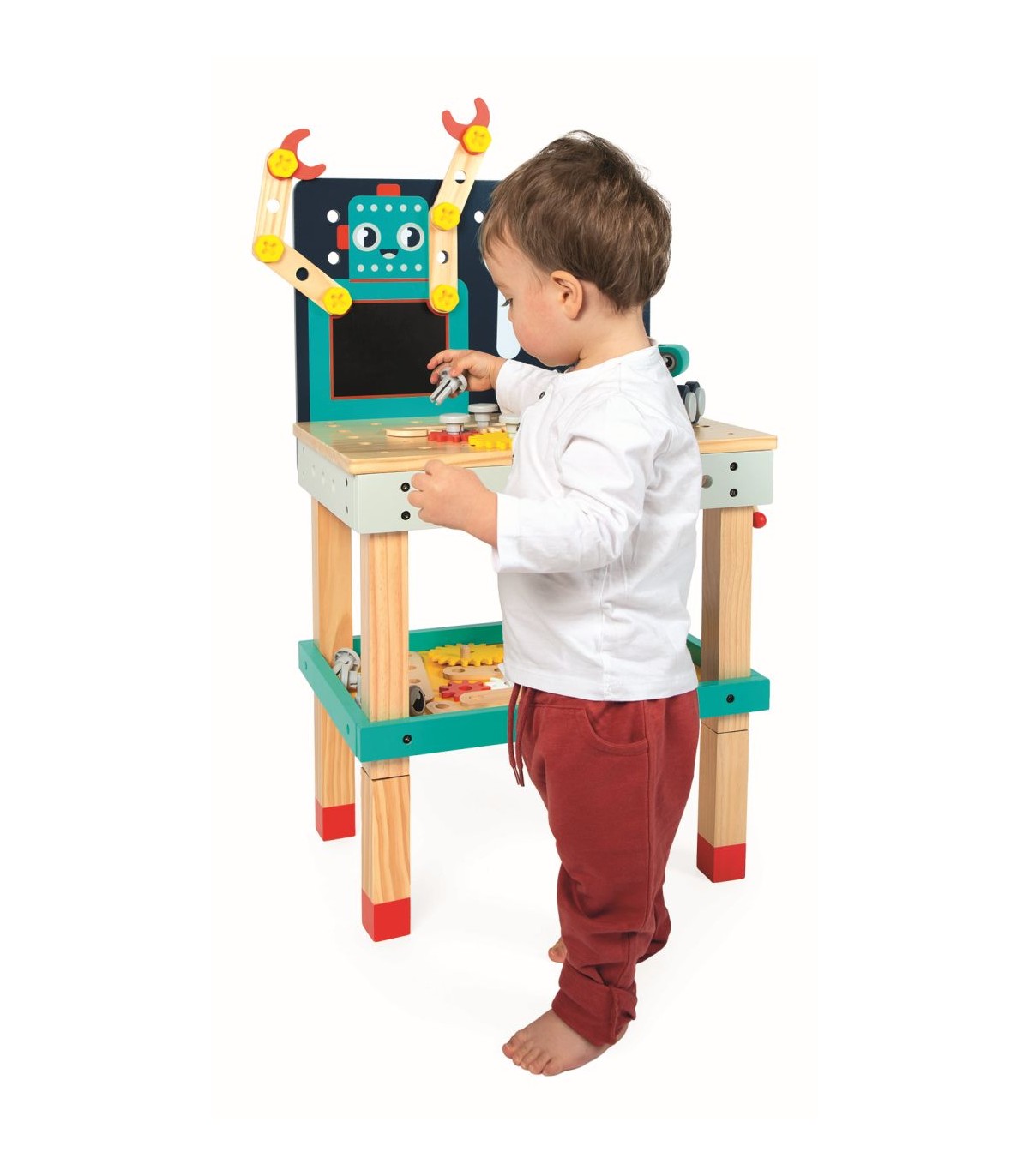¿Y si construimos unos robots? ¡Todos a la mesa de trabajo! A los niños a partir de 3 años les encantará hacer bricolaje y experimentar en este banco de trabajo de madera, con todos sus accesorios. Este banco infantil de altura regulable (superficie de trabajo a 33 o 50 cm de altura) es ideal para trabajar la imaginación, la creatividad y la motricidad fina. También es un fantástico juguete de imitación para quienes quieran hacer bricolaje como los adultos. En total se incluyen más de 50 accesorios de bricolaje: 3 herramientas magnéticas de madera (llave inglesa, martillo y destornillador), 7 engranajes y 9 placas de madera, 1 kit de tornillería de plástico (8 tornillos, 8 tuercas y 12 clavos), 2 tizas y 1 borrador. ¡Se puede dibujar o escribir con tiza en el cuerpo de nuestro amigo el robot! Para mayor realismo, este juego de construcción tiene un tornillo de banco en el lateral y un espacio de almacenamiento en las patas: ¡muy práctico para guardar todas las piezas! Y para tener las herramientas siempre a mano, ¡el lado magnético del banco de trabajo es todo un acierto! La otra ventaja de este banco de trabajo magnético son los brazos del robot que el aprendiz de manitas puede montar y articular para darle vida: divertido asistente o fabricación ambiciosa, ¿qué papel jugará este robot en las historias del niño? Su mejor creación será sin duda el pequeño robot de madera para construir, que rueda, incluido con el banco de trabajo. ¡Es un juguete adicional que construir con 7 piezas y una graciosa carita, que viene con una tarjeta de ejemplo! Pero eso no es todo: ¡para que sean más realistas, los tornillos tienen muescas como los de verdad! Con sus bonitos colores y la madera natural, este juguete de imitación de bricolaje hará las delicias de toda la familia y es un soporte divertido para los niños que fomenta su inventiva. Patas de altura regulable, multitud de accesorios, herramientas magnéticas y robots: ¡es el banco de trabajo ideal tanto para los pequeños curiosos como para los manitas en ciernes! Este banco de trabajo grande está hecho de madera con certificado FSC™. Forma parte de nuestra colección de juguetes de imitación de bricolaje: Brico'Kids.