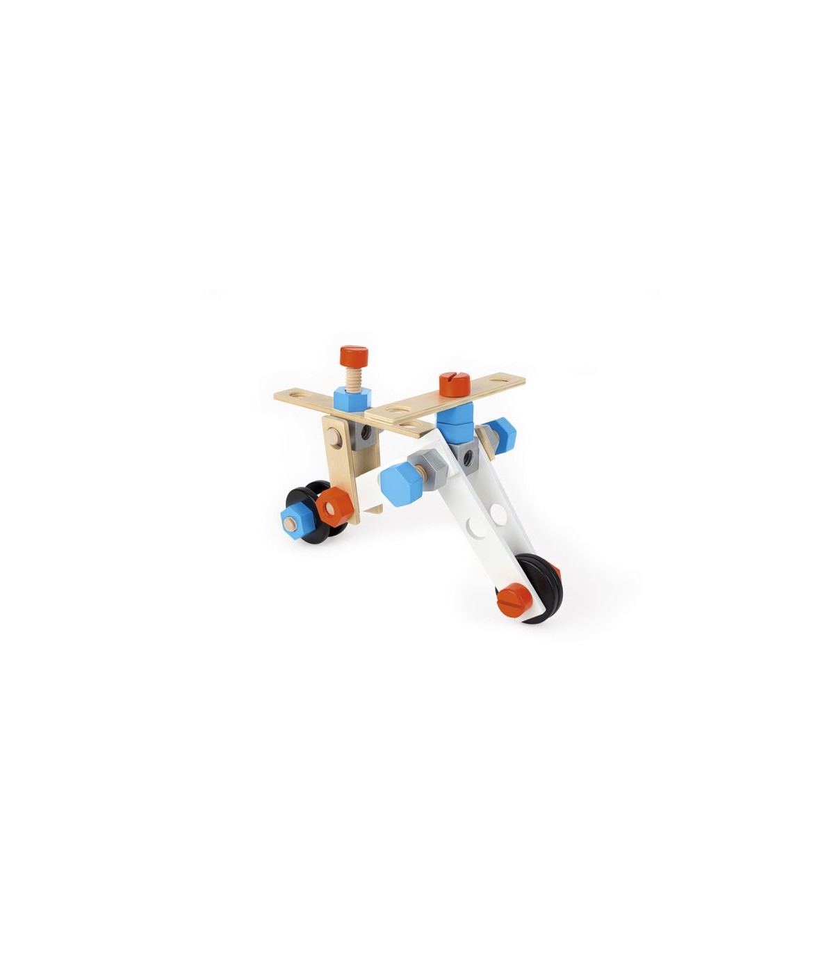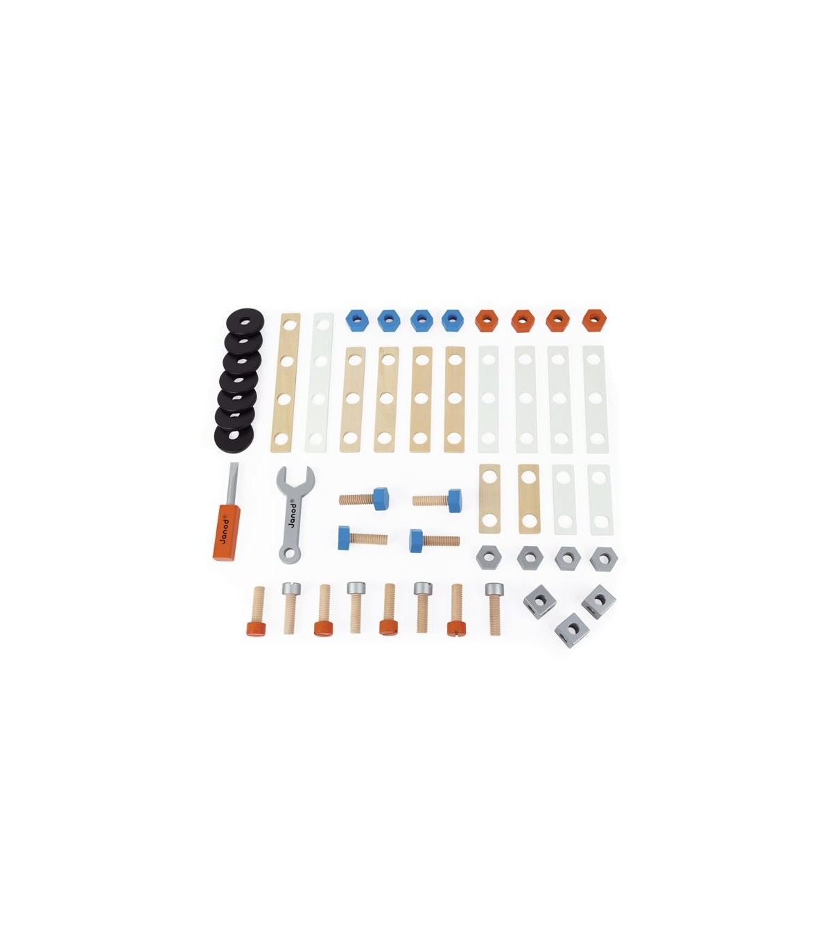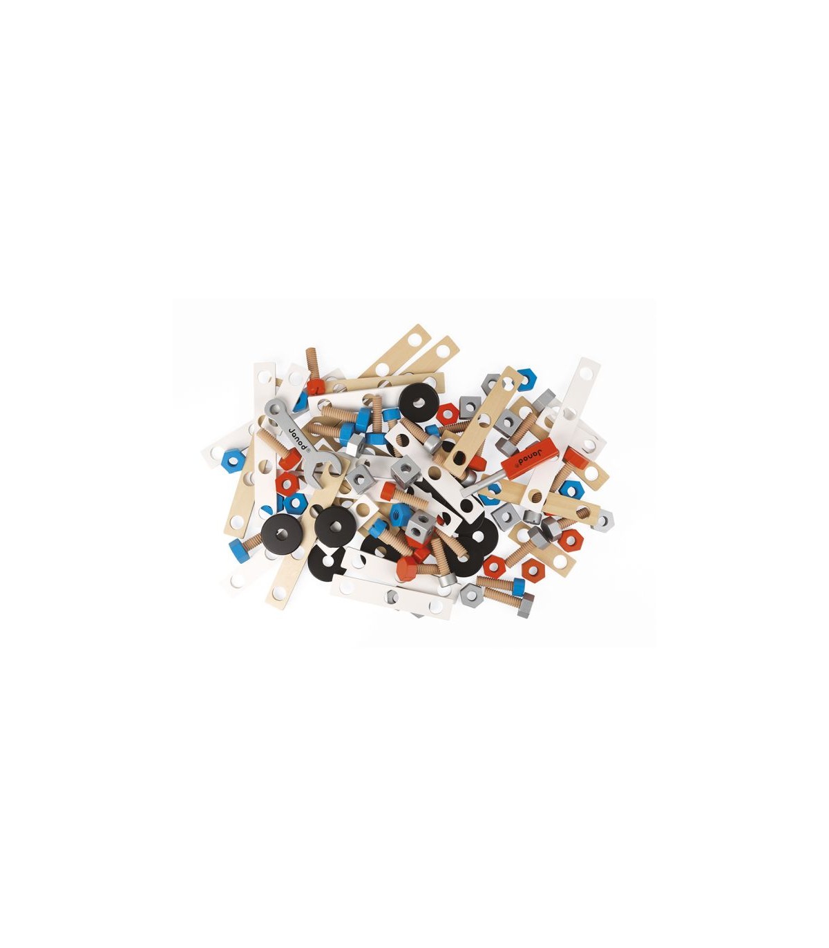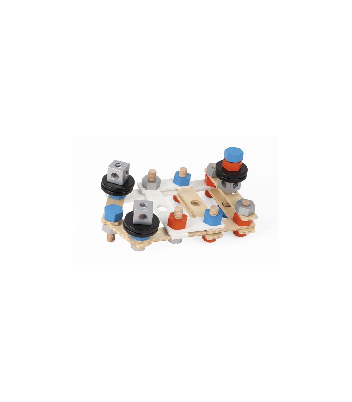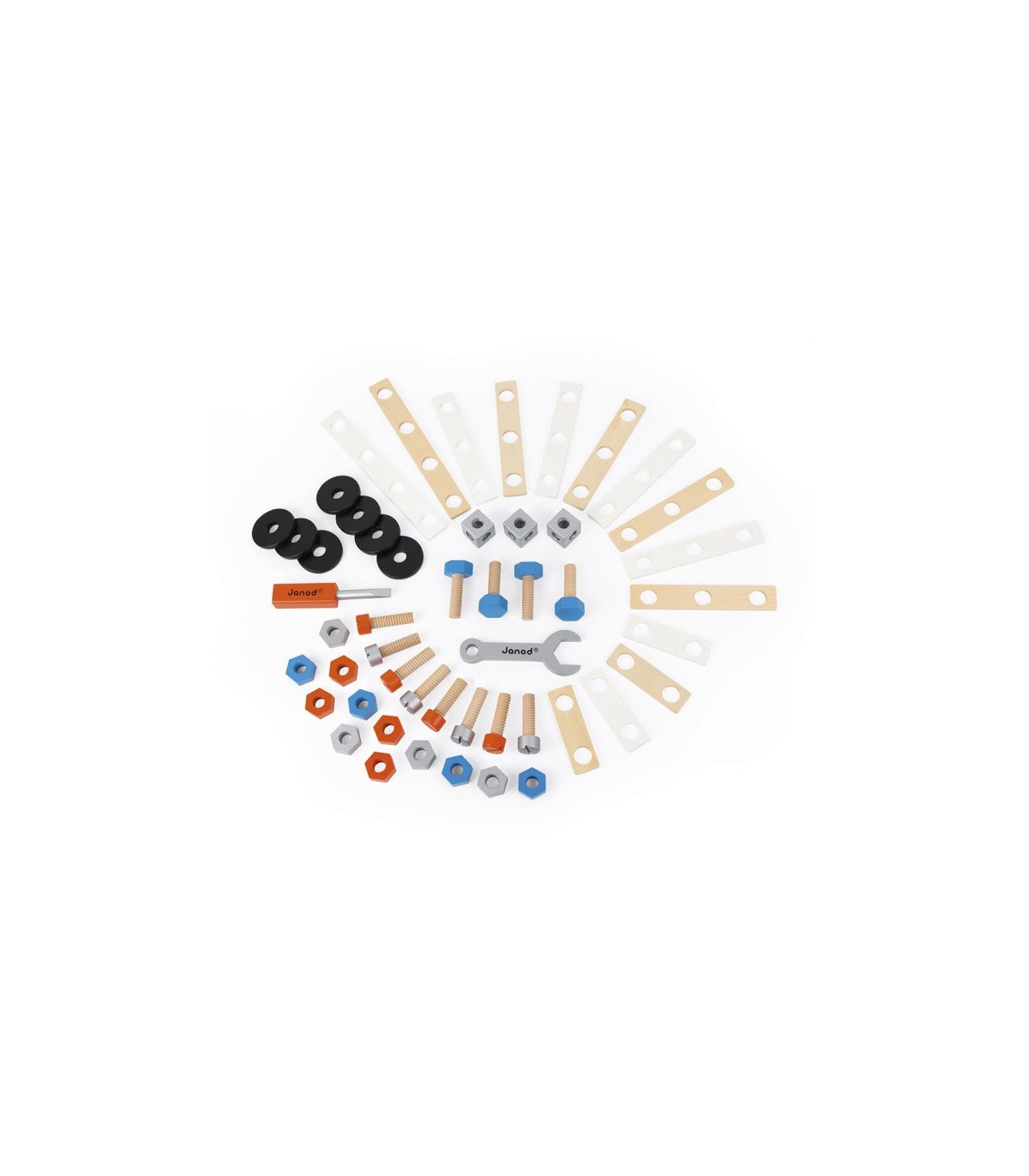 ¡A imaginar el invento del siglo! ¡Los pequeños inventores y aficionados al bricolaje, a partir de 3 años, estarán encantados de dar rienda suelta a su imaginación al máximo con este barril de accesorios de madera! Los niños podrán construir los artilugios más locos, las herramientas más extravagantes y, por qué no, ¡encontrar su vocación! En solitario o con amigos, ¡todo se puede inventar! Podrán dar vida a múltiples construcciones: aviones, motos… Este juego contiene 50 accesorios: 7 arandelas Ø58x8 mm + 2 placas con 4 agujeros 230x30x6 mm + 8 placas con 3 agujeros 170x30x6 mm + 4 placas con 2 agujeros 100x30x6 mm + 12 tuercas hexagonales 34x30x15 mm + 3 tuercas cúbicas 30x30x30 mm + 4 tornillos 34x65 mm + 8 tornillos Ø24x65 mm + 1 destornillador 140x20x26 mm + 1 llave 155x50x10 mm.