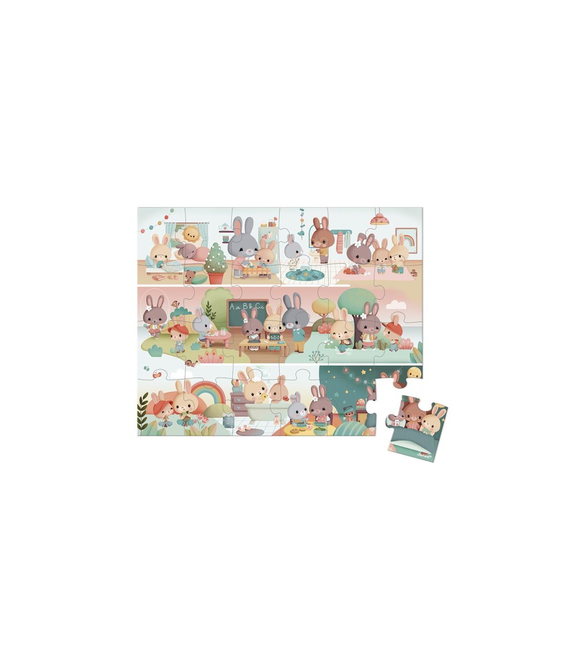 ¡Sigue las aventuras de esta adorable familia de conejos en su quehacer diario! Este hermoso puzle de cartón de 24 piezas ayudará a tu hijo a orientarse...