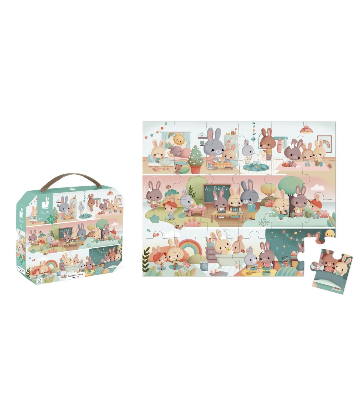 ¡Sigue las aventuras de esta adorable familia de conejos en su quehacer diario! Este hermoso puzle de cartón de 24 piezas ayudará a tu hijo a orientarse en el tiempo e identificar los pequeños rituales de la vida cotidiana: levantarse, vestirse, luego ir a la escuela y así, hasta la hora de acostarse. Un muy buen apoyo para aprender, compartir y desarrollar la motricidad de los pequeños. Este puzle de cartón se transporta y guarda fácilmente gracias a su maletín con asa. Viene con un póster que sirve de plantilla para montar el puzle a su propio ritmo. Este puzle de colores suaves es ideal para niños de a partir de 3 años, con sus 24 piezas aptas para manos pequeñas. Es un puzle hecho en Francia y está decorado con tintas vegetales. El material de base forestal en este producto es reciclado.