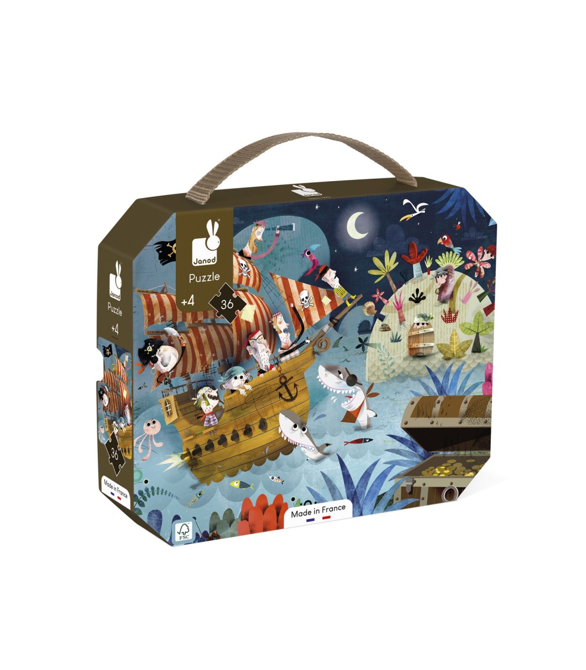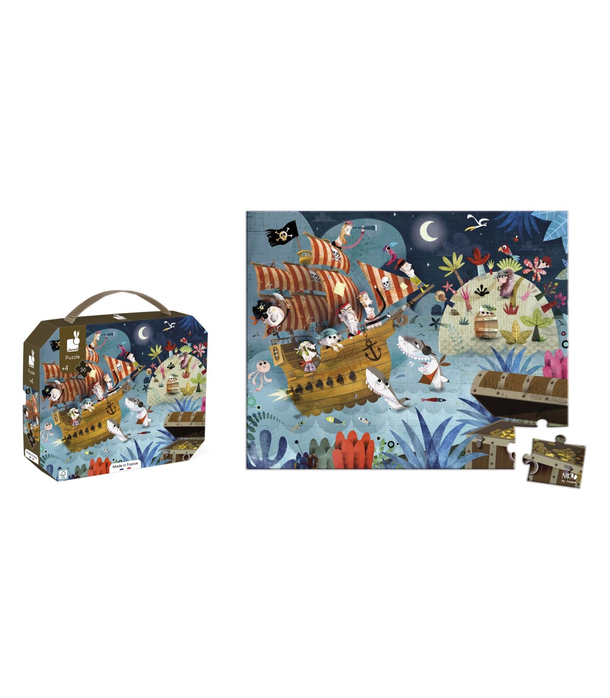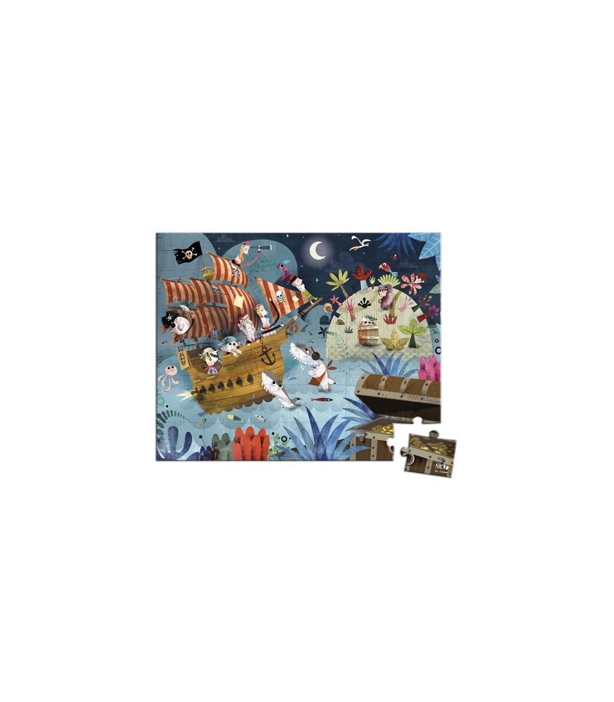 Ambiente nocturno y misterioso para este puzle de piratas en busca de oro y plata. ¡Pero la tarea es ardua y el camino hasta el cofre está sembrado de trampas! Los pequeños adorarán estas ilustraciones y les encantará realizar los puzles. Este está adaptado para niños de 4 a 7 años. Contiene un póster para ayudar al niño. Número de piezas: 36. Fabricado en Francia. El material de base forestal en este producto es reciclado.
