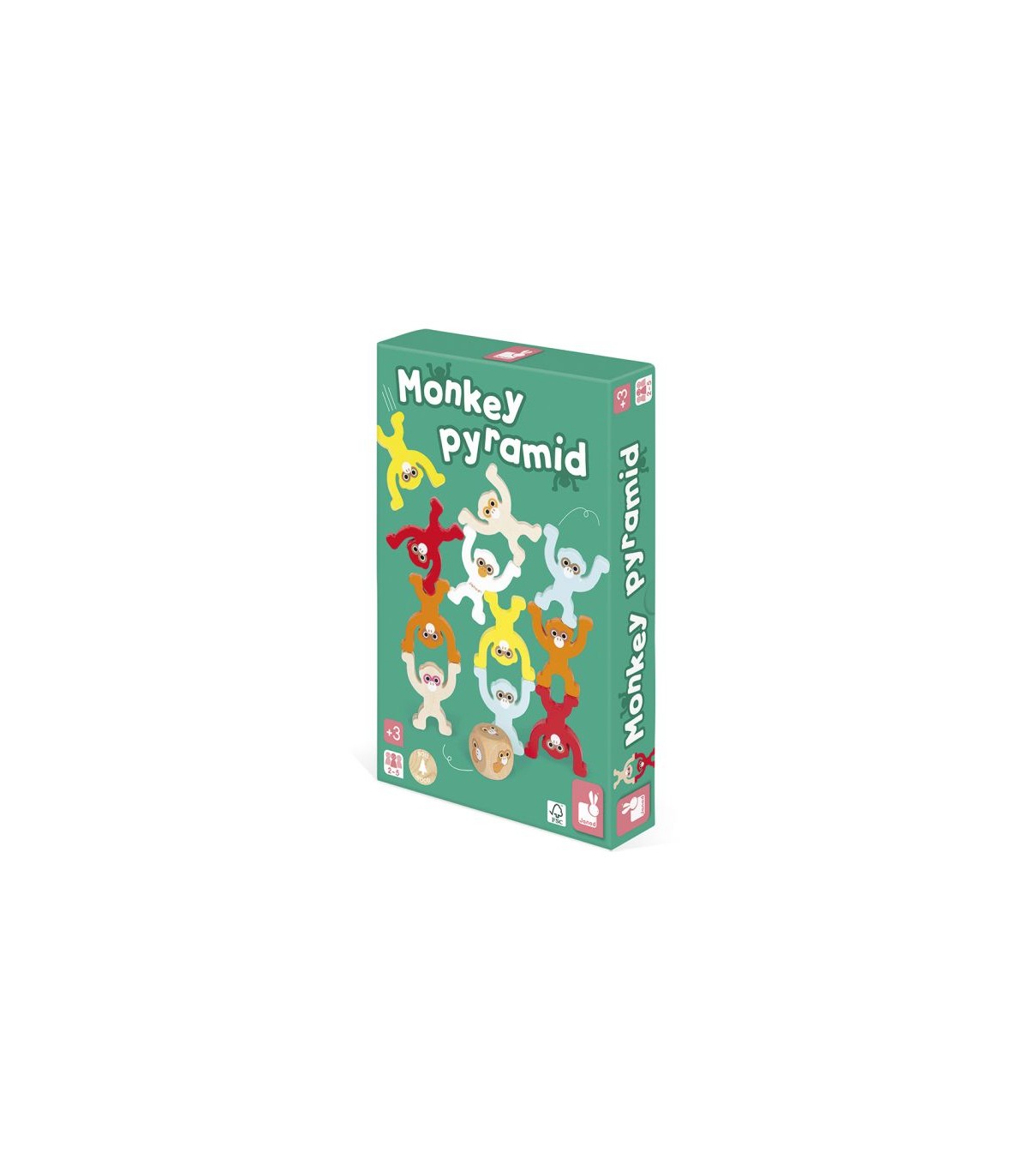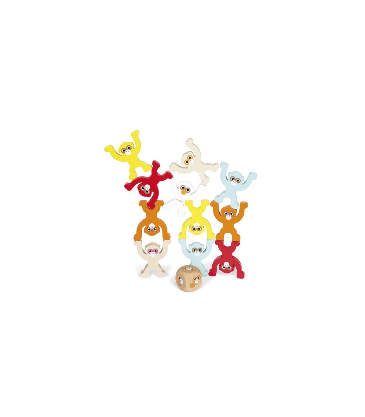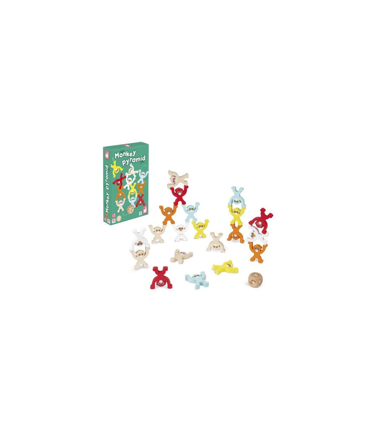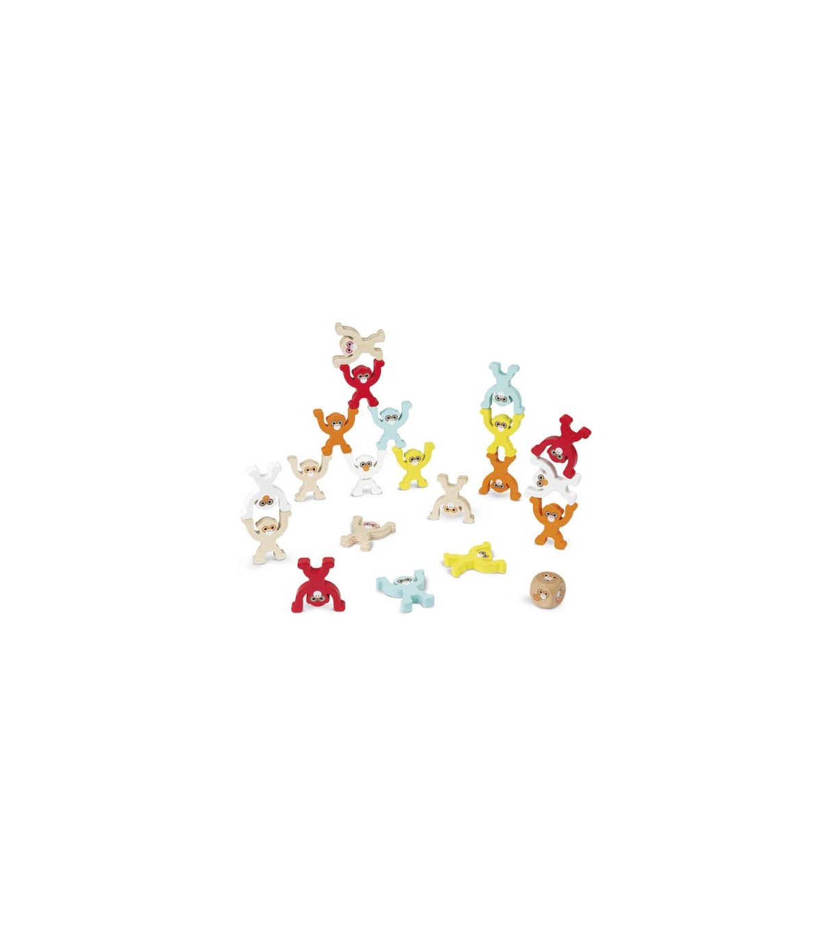 ¡Nuestros amiguitos los acróbatas quieren hacer la pirámide más alta posible! Pero no será fácil mantener el equilibrio haciendo el mono… Este juego de habilidad de madera para niños a partir de 3 años permite competir con la familia o los amigos poniendo a prueba su destreza y su lógica. ¿Quién conseguirá poner el último mono, cabeza abajo o cabeza arriba, en lo alto de la estructura sin que se desplome todo? Para complicarlo un poco más, el dado indicará al jugador de qué forma tendrá que poner el mono: guiñando el ojo, haciendo una mueca… Este juego contiene 20 monos de madera de colores y 1 dado de madera. Los monos miden 7 x 1,2 x 7,5 cm. Este juego tiene el certificado FSC® (madera de bosques gestionados de forma sostenible) y está adornado con pintura al agua.