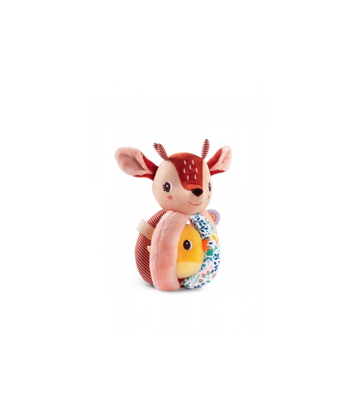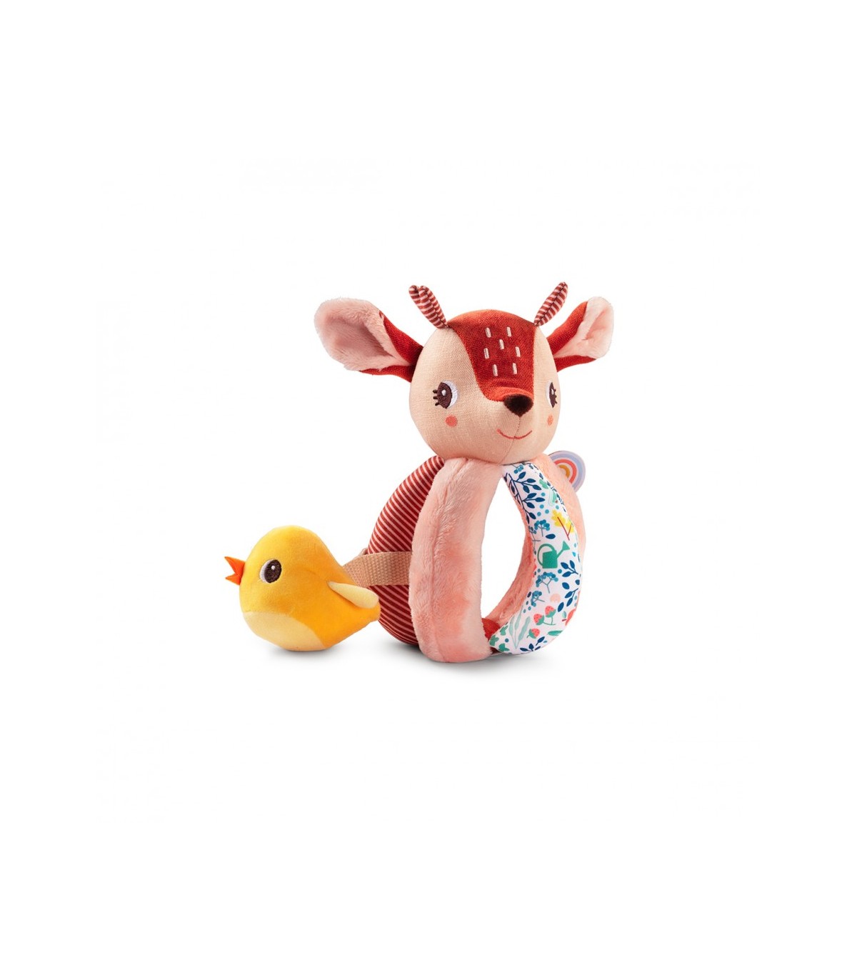 Un original sonajero, para que las manitas puedan agarrarlo fácilmente. Entre las asas se esconde un amiguito.