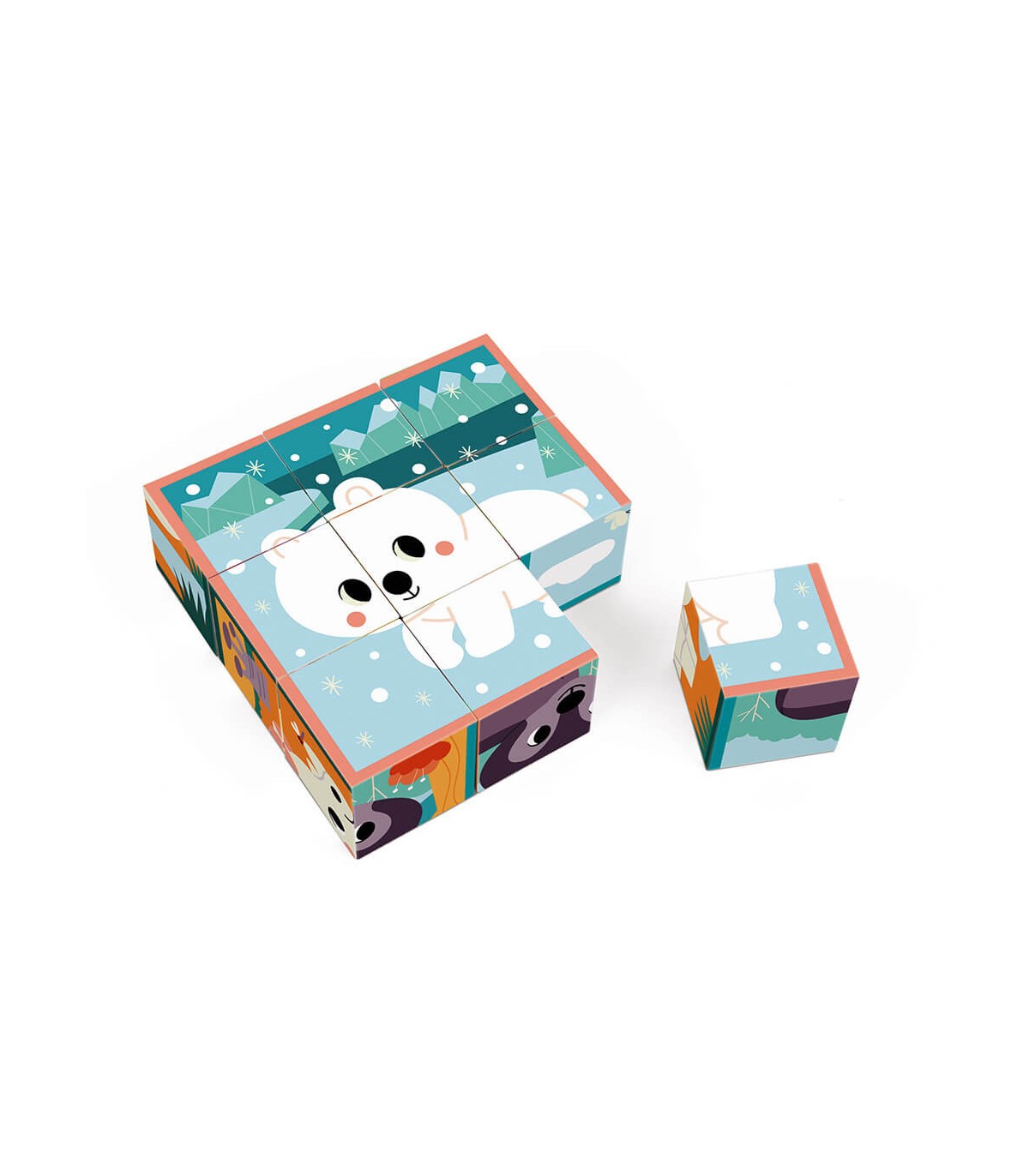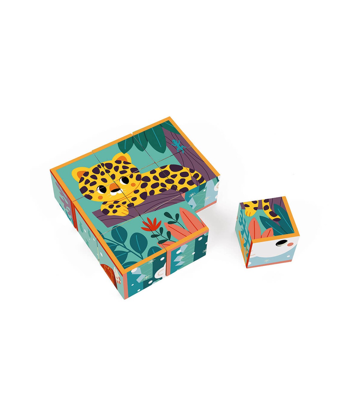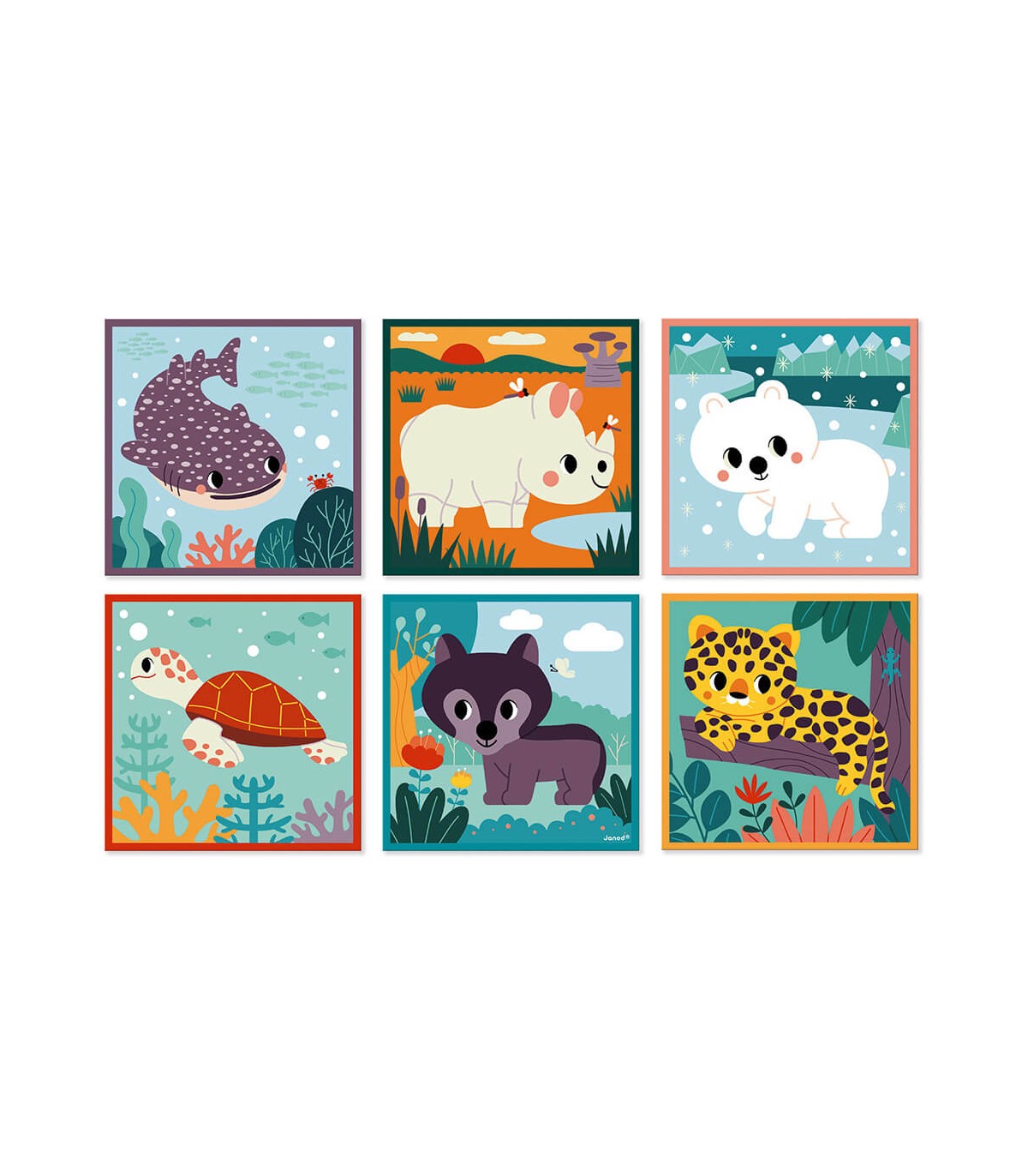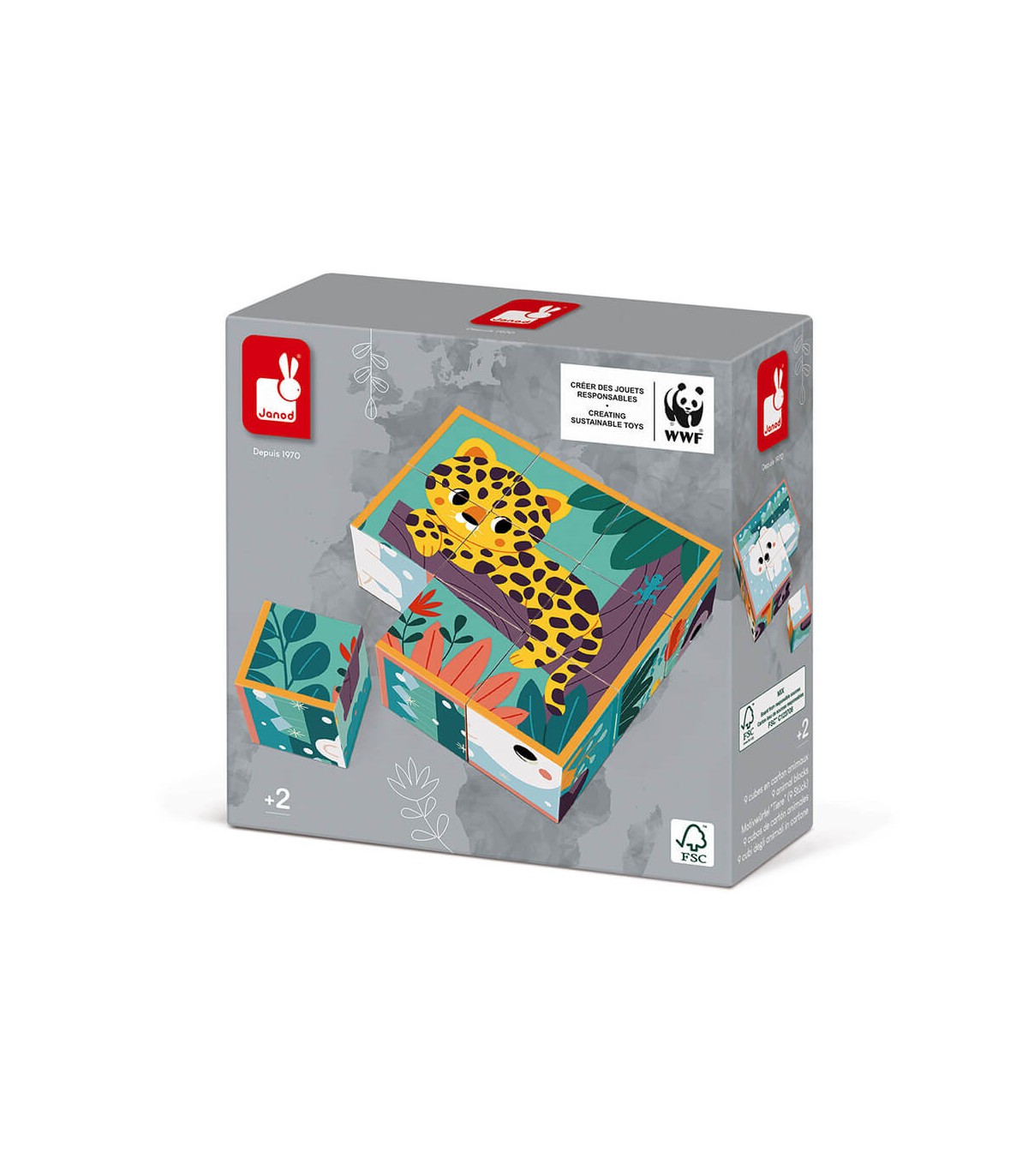 Los animales de este bonito juego para niños pequeños tienen unas preciosas caritas redondeadas que conquistarán al bebé y a toda la familia. Este juego de 9 cubos de cartón ligero tiene 6 ilustraciones de animales en su entorno. Los niños a partir de 2 años deben reproducir cada escena para recomponer los siguientes animales: rinoceronte, jaguar, tiburón ballena, oso polar, lobo y tortuga. Para facilitar las cosas, cada ilustración tiene el contorno de un color distinto para ayudar al niño a elegir las piezas. Esta actividad es ideal para desarrollar la observación y la coordinación. Este producto está hecho de material certificado FSC® y otro material controlado. Juguete desarrollado en colaboración con WWF®. Janod apoya los esfuerzos de WWF® para preservar el medio ambiente y la biodiversidad con una nueva gama de juguetes hechos con materiales más sostenibles. Con esta gama, nuestro objetivo es inspirar y concienciar a las nuevas generaciones para que trabajen en la defensa de la fauna y la naturaleza.