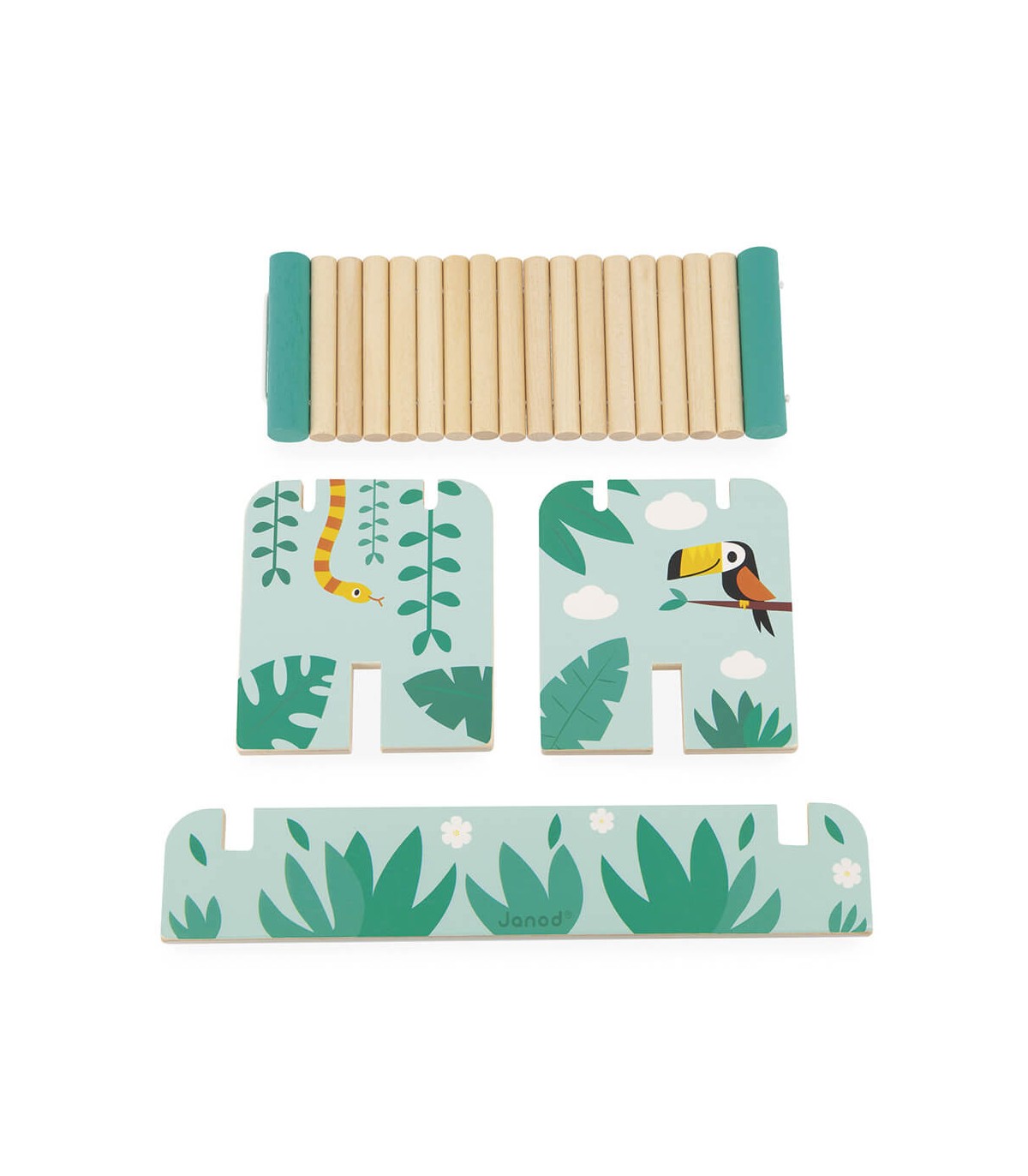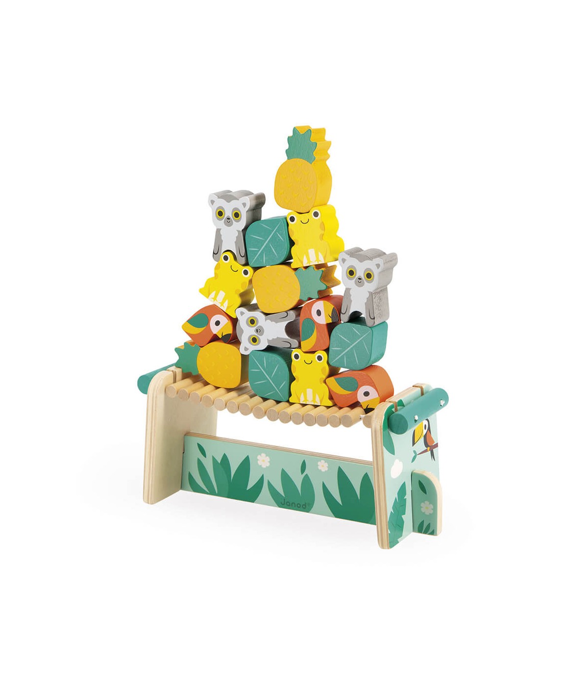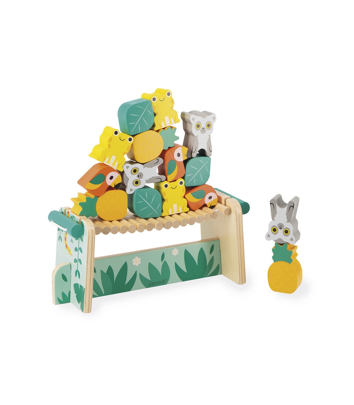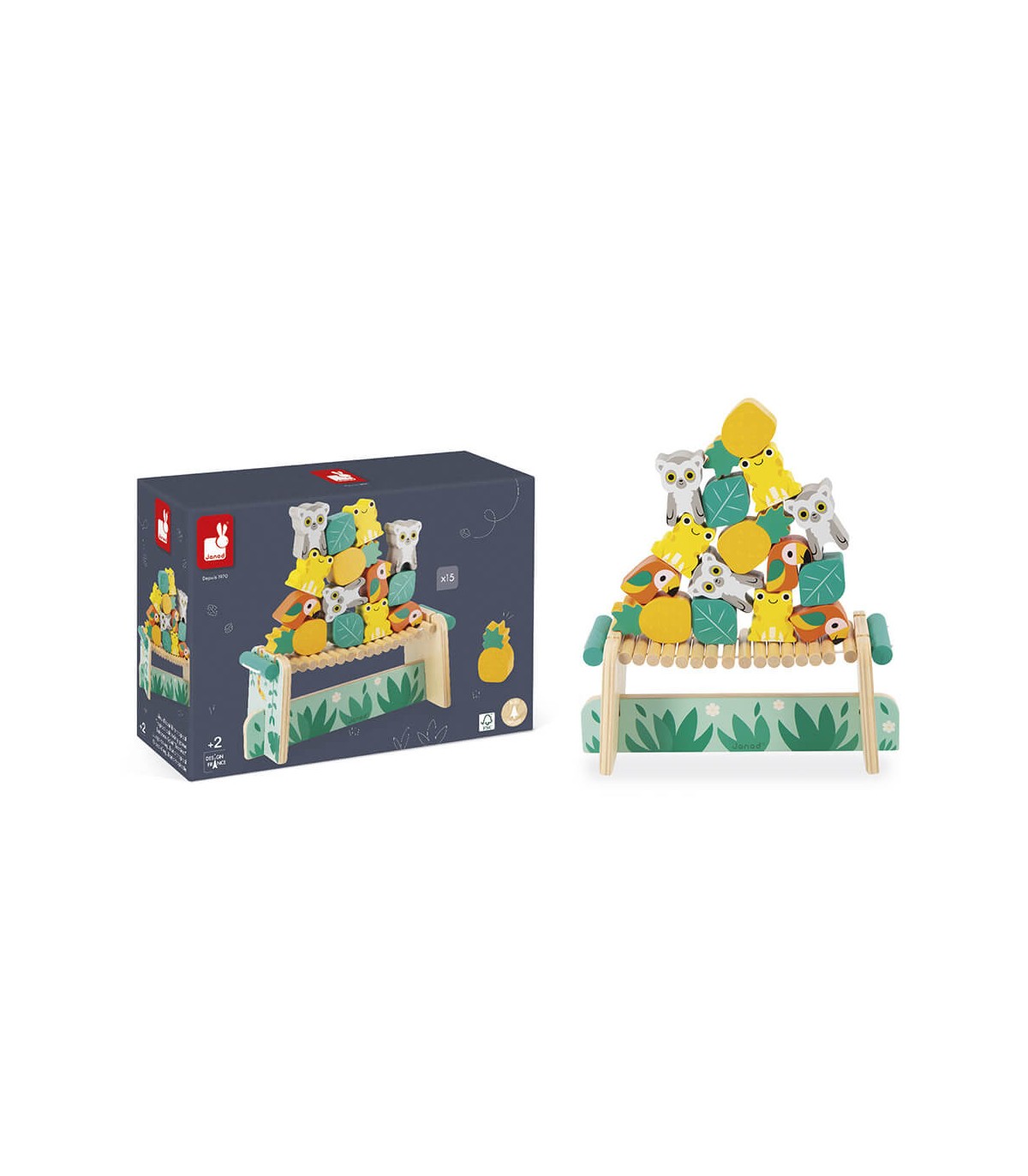 ¿Habrá espacio para todos en el puente colgante? ¡Este puente de madera para monos en el corazón de la selva tropical está listo para recibir a una gran cantidad de animales que quieren cruzarlo! Ranas, lémures y loros, pero también hojas y piñas, tendrán que encontrar el equilibrio en este colorido juego de habilidad. Primero se montan las 3 partes del puente y ¡ya puedes divertirte por tu cuenta o con otros para apilar los elementos sin que se te caiga nada! Un juego de equilibrio de madera que entretendrá a los niños de a partir de 2 años. Hay que apilar 15 piezas en total, lo que ayudará al bebé a desarrollar su destreza y concentración: ¡deberá ser meticuloso y paciente para conseguir que todos estos divertidos animales se sostengan en el puente! Este juguete de estímulo está hecho de madera de bosques gestionados de forma sostenible, con certificado FSC®. Pintura al agua.