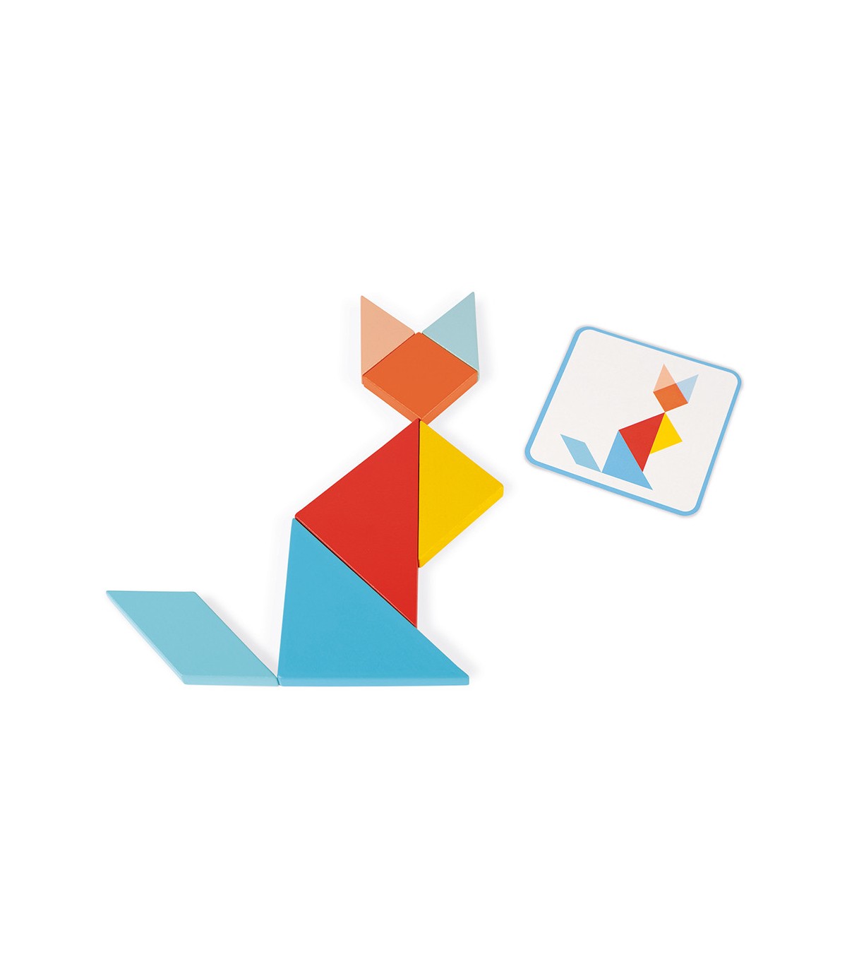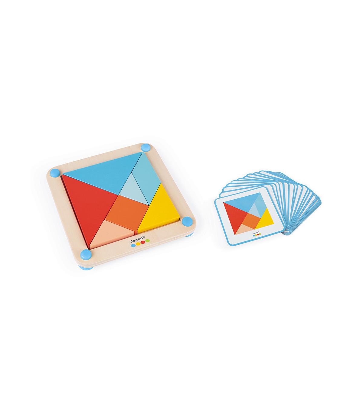 ¡Hay que pensar para formar un objeto o un animal con las piezas de distintas formas! En eso consiste el tangram, un juego de manipulación que se inspira en la lógica de los puzles. Un cuadrado cortado en 7 piezas de diferentes tamaños, formas y colores se convierte en un divertido rompecabezas en el que hay que dar con la combinación adecuada para reproducir los ejemplos incluidos. Este emocionante juego de madera hará las delicias de los niños a partir de 2 años. El tangram tiene dos niveles de dificultad: los niños más pequeños podrán hacer los dibujos del lado de color de las tarjetas de ejemplo y los más experimentados se atreverán con el lado negro. Hace falta mucha paciencia y concentración para reproducir todas las figuras de este juego de tangram. Así el niño descubrirá formas y colores y trabajará su concentración. El ingenioso tablero tiene unas patas antideslizantes de silicona para mayor estabilidad. Este juego contiene 25 tarjetas y 7 piezas de madera. Las piezas están pintadas con pintura al agua.