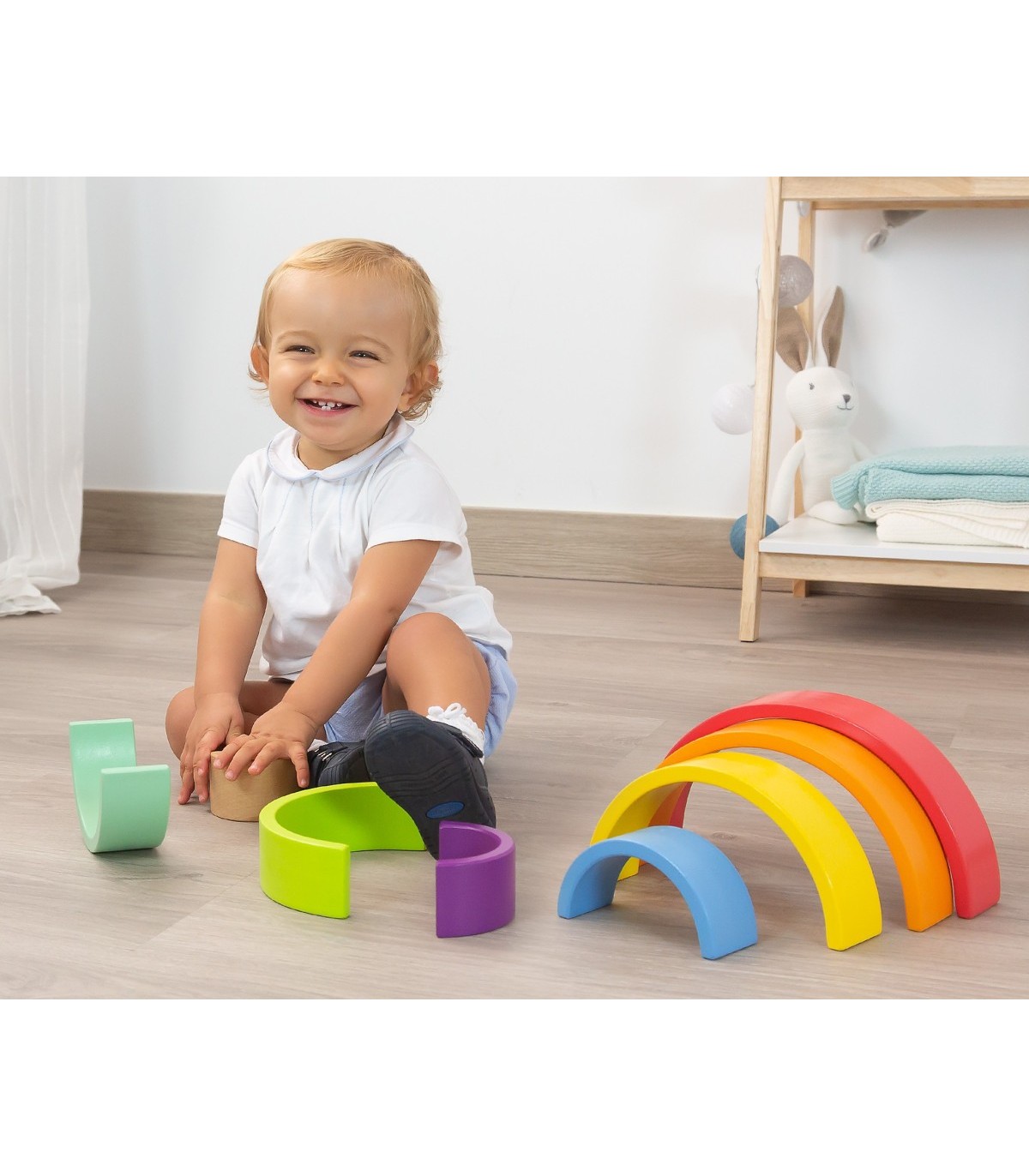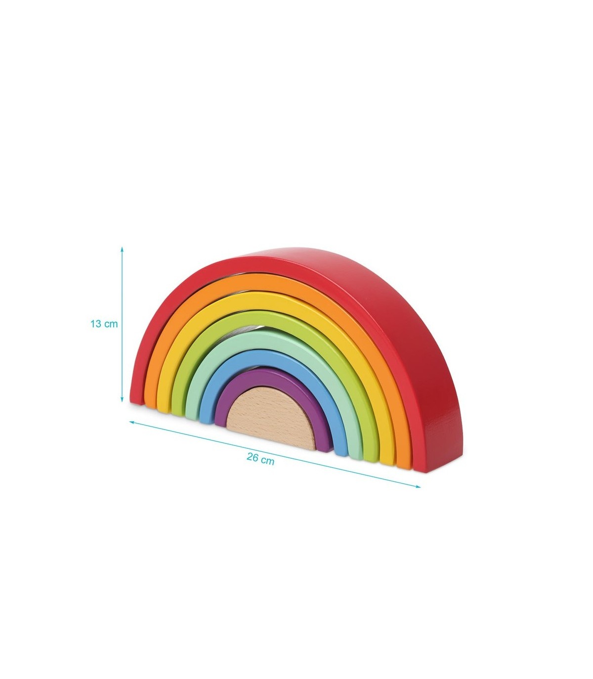 Este arcoíris puede convertirse en cualquier otra forma y ser un objeto completamente diferente. Es un juguete de madera compuesto de un número de arcos de madera de distintos tamaños y colores que permiten elaborar construcciones o trabajar el equilibrio. Mejora la motricidad fina y gruesa, la lógica y el sentido espacial mediante la creación de figuras.