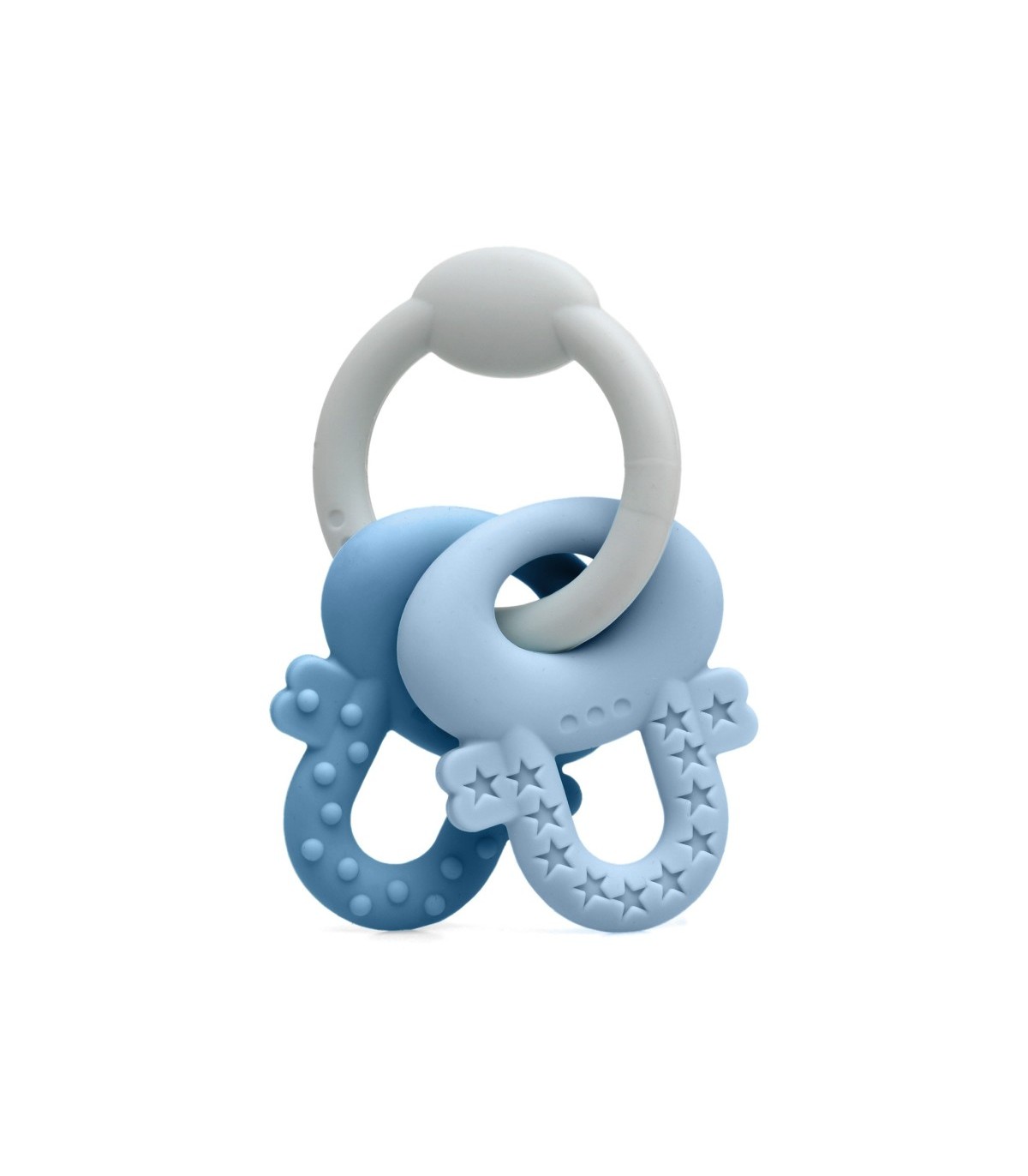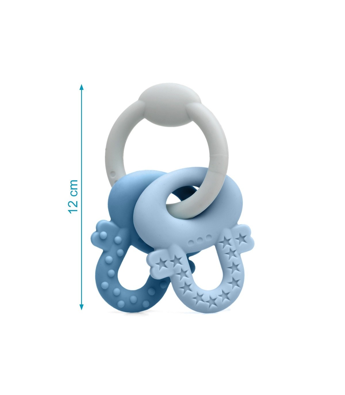 Este es un mordedor muy especial e innovador. Un llavero de silicona hecho para que tu peque muerda sin parar y que pueda sentirse aliviado por sus molestias en las encías. Sus diferentes texturas hacen masajee y estimule las encías de tu bebé para que esté más relajado. Es fácil de coger y lo podrá manejar como más le guste. Está hecho para sus manitas.