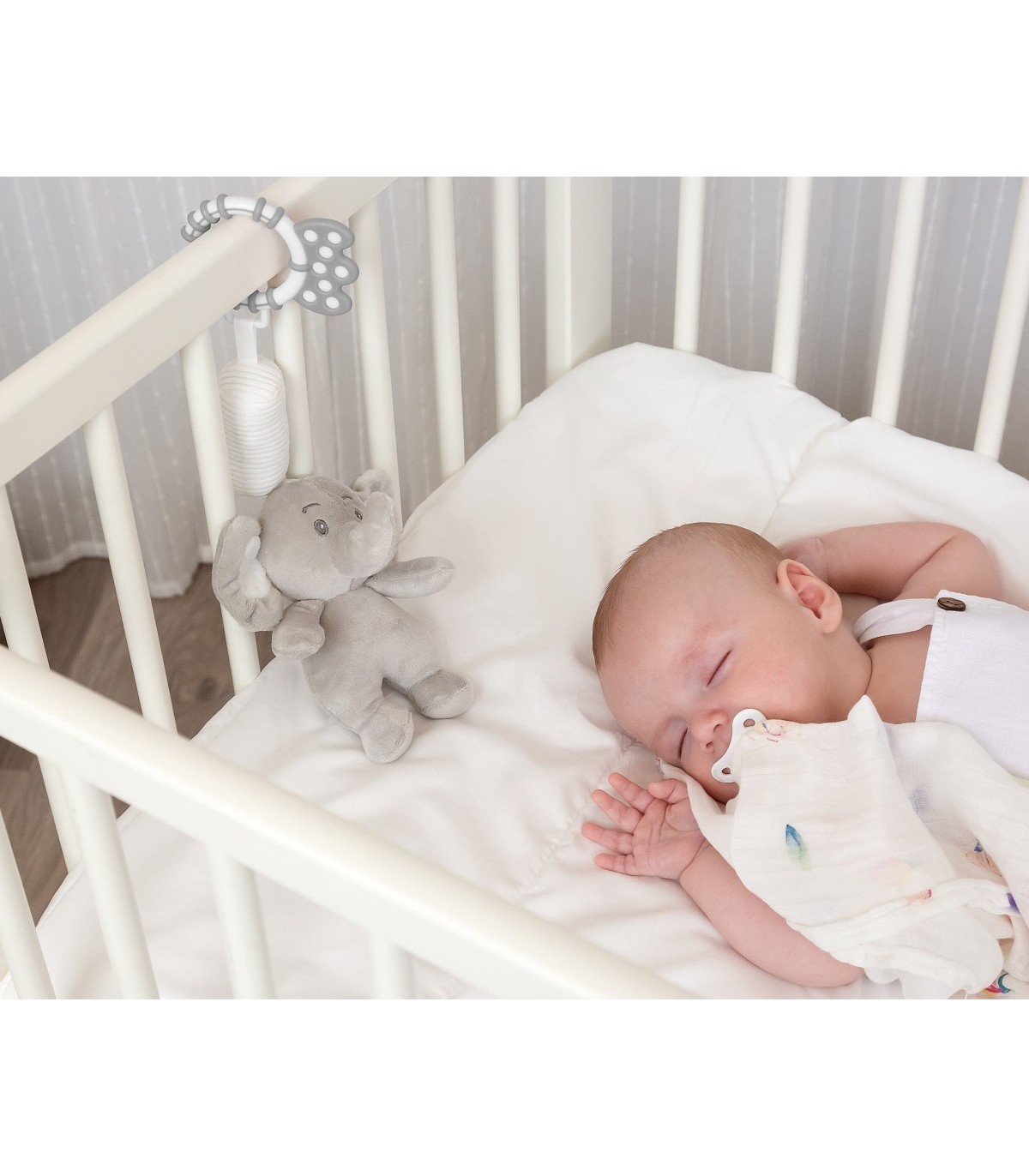 Se puede colgar en los bordes de la cuna, de la capota de cochecitos y silletas, o incluso en el coche para entretener los trayectos. Además la misma anilla para colgar, sirve de mordedor gracias a su forma, textura y material suave.