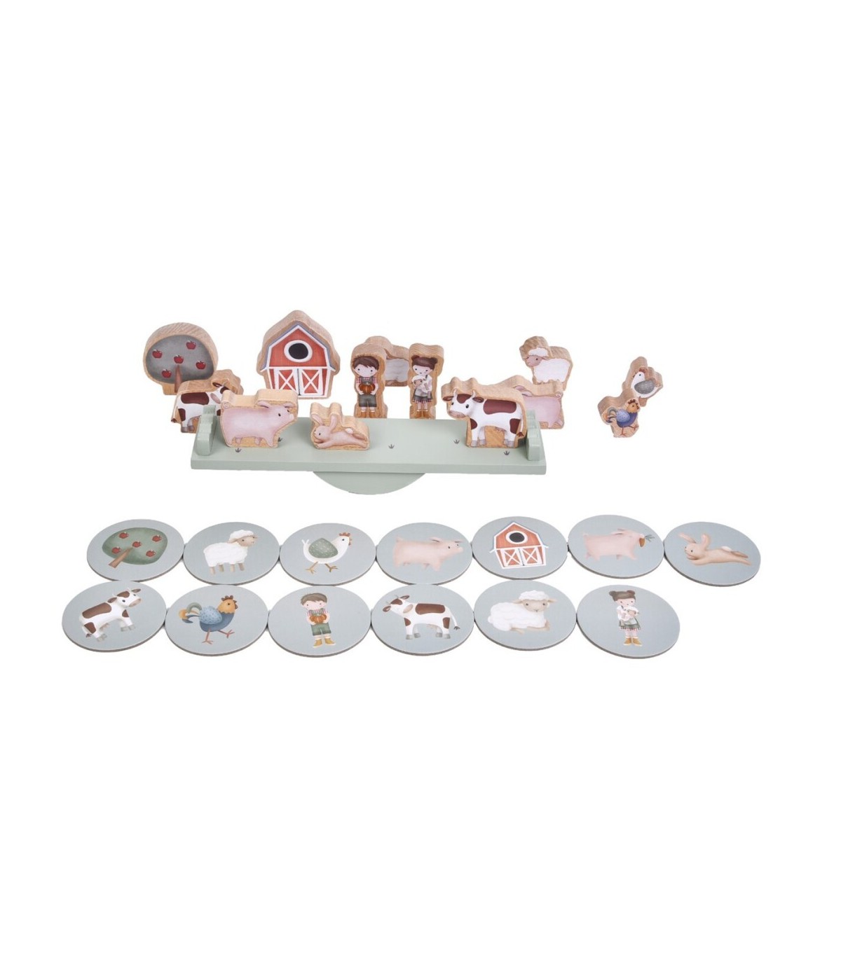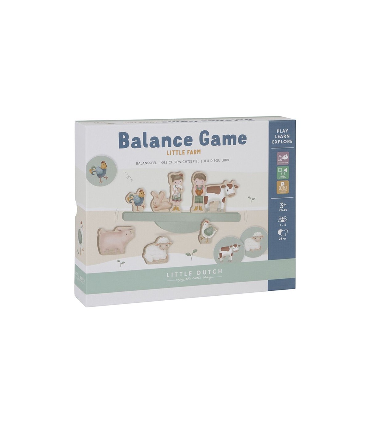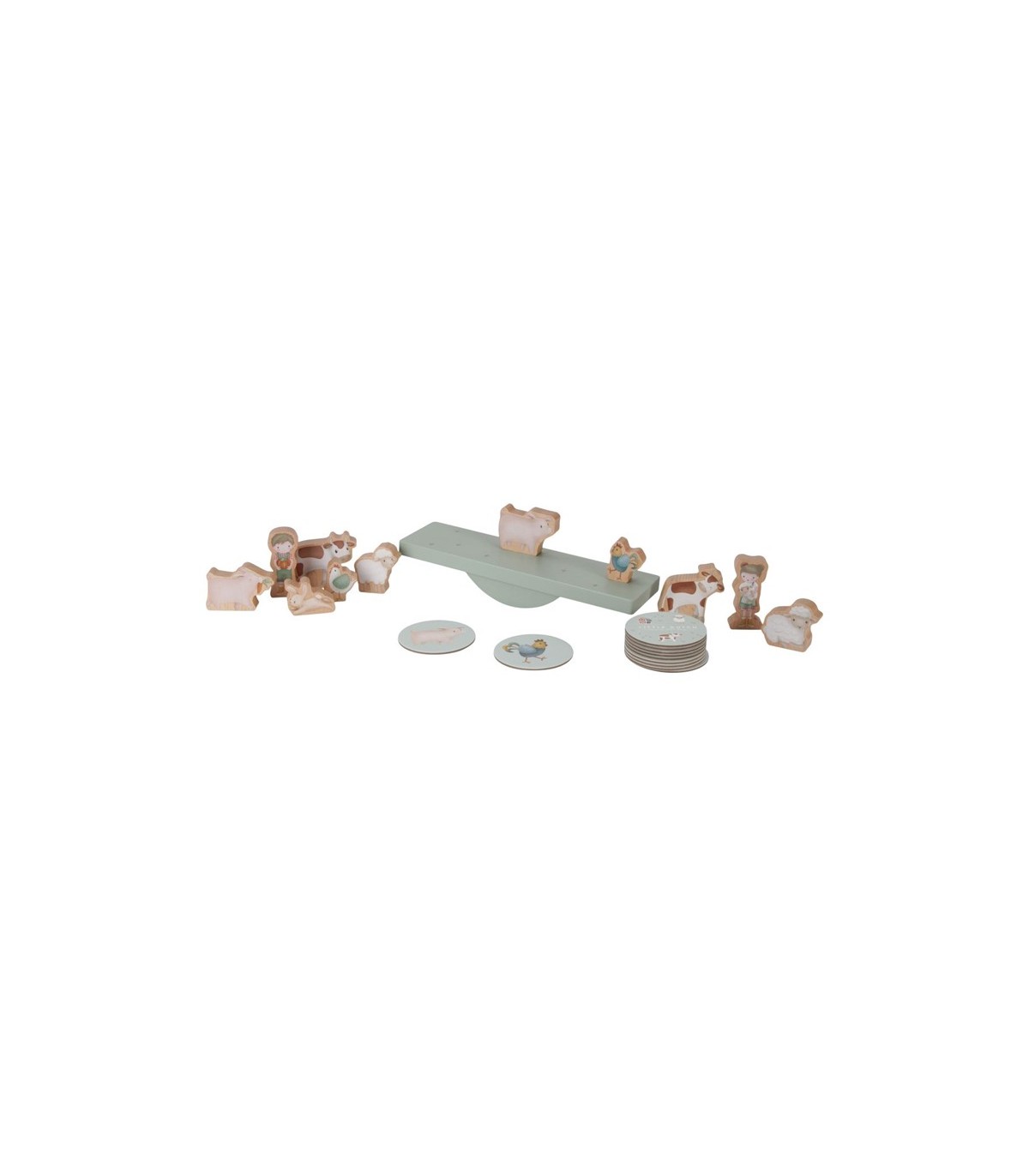 ¿Cuántas figuras puedes equilibrar? Da la vuelta a una carta y coloca la figura que coincida con tu carta en el prado. ¡Tenga cuidado de no balancear demasiado la balanza, o las figuras se caerán! Este juego de equilibrio es divertido para jugar solo, pero también con toda la familia. El equilibrio mejora la coordinación mano-ojo y las habilidades motoras finas de su hijo. El juego incluye 13 cartas redondas, 1 balanza, varios animales, Jim y Rosa, un árbol y una granja.