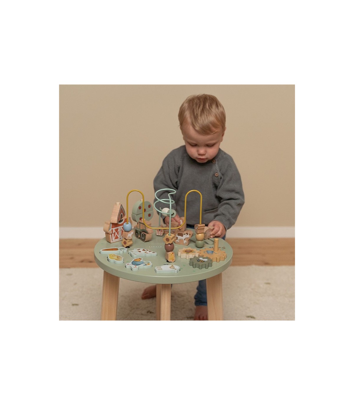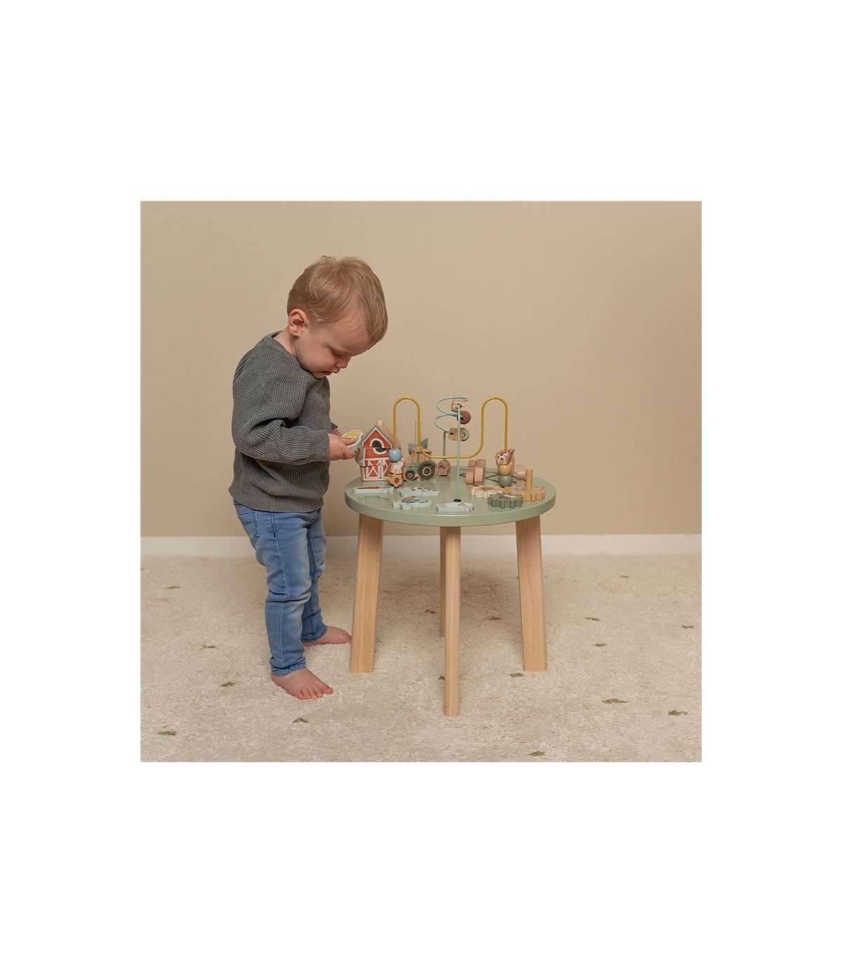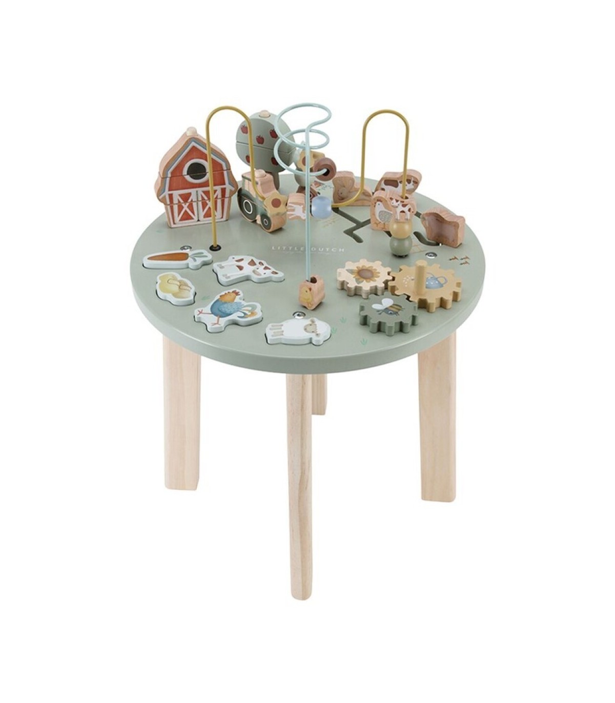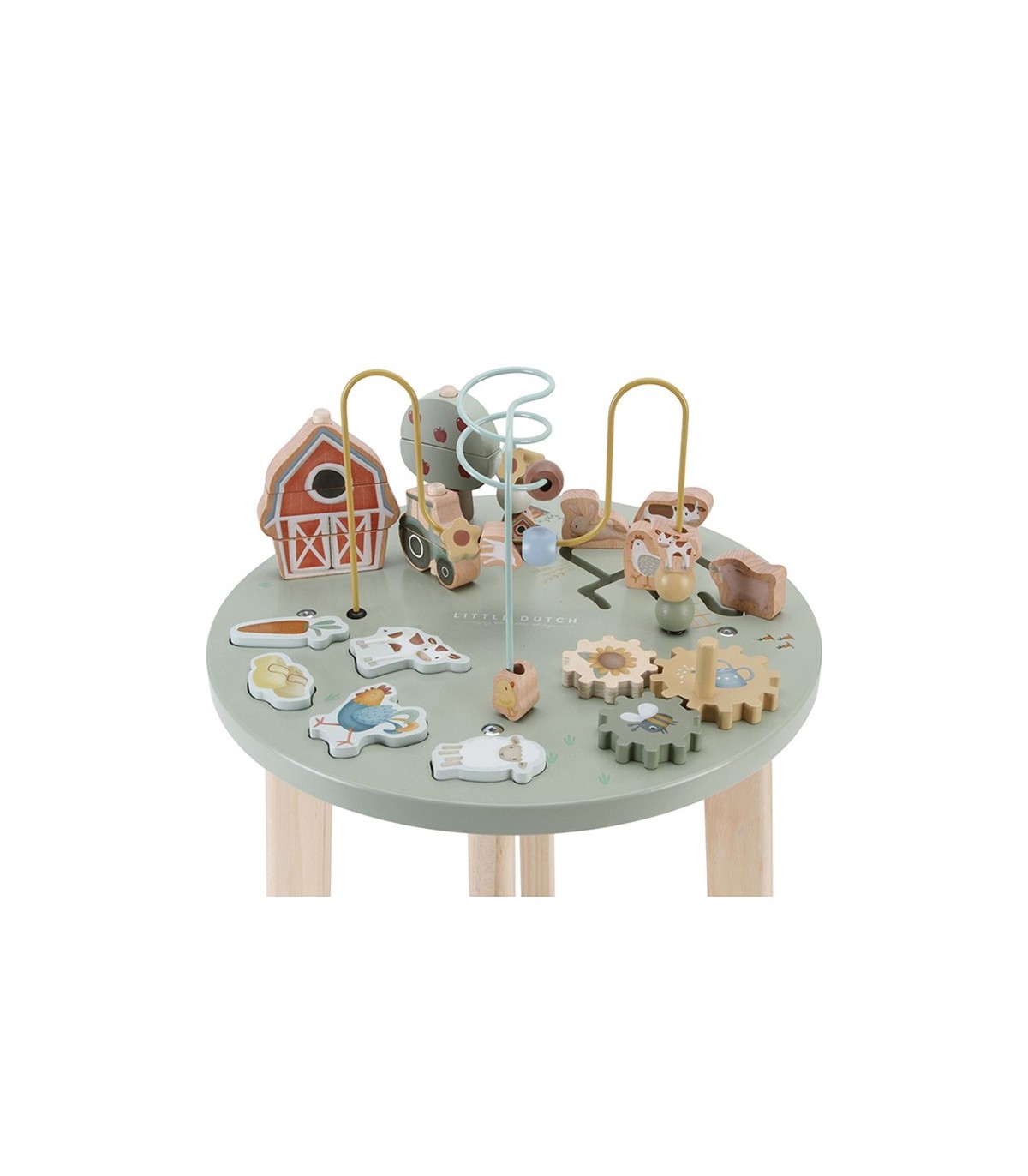 ¡Levántate y juega! Descubre todos las actividades que esta mesa tiene para ofrecer. Mueve las cuentas de un lado de la espiral hacia el otro o construye la granja. Resuelve el puzle, gira los engranajes y mueve la ovejita, la vaca y la gallina. Esta mesa de actividades de madera desafía a tu pequeño de muchas maneras. Hay 5 actividades por descubrir, cada una de ellas apoya el desarrollo de la motricidad fina. Gracias a su diseño seguro y equilibrado, la mesa de actividades también fomenta que se mantenga de pie. ¡Y mantenerse despierto! Porque todas esas funciones de juego mantendrán tu niño pequeño ocupado por un tiempo.