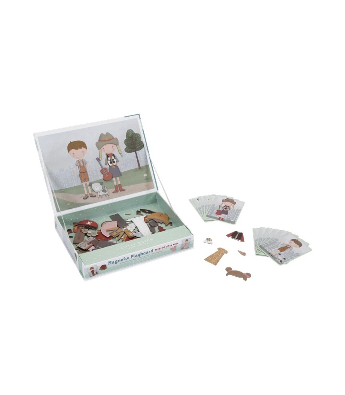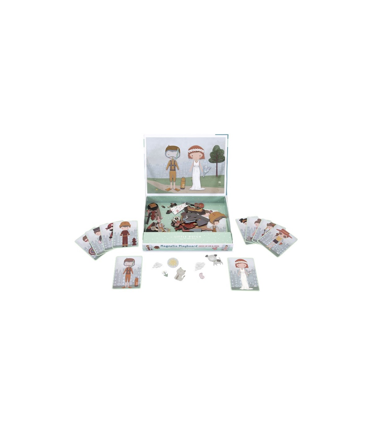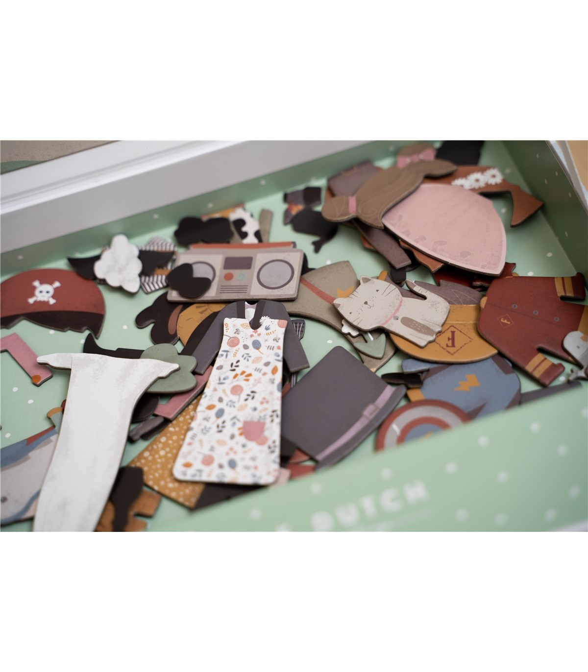 Descripción ¡Juega a disfrazarte con Jim & Rosa! Con este puzle magnético puedes copiar los atuendos de las cartas en el tablero con piezas magnéticas. O usar tu propia fantasía. Hay un sinfín de combinaciones que garantizan mucha diversión mientras fomentan el vocabulario y la coordinación. Para jugar en casa, pero también de viaje.Incluye 80 imanes pequeños, 6 tarjetas para Rosa y 6 para Jim. La caja está hecha de cartón resistente para un fácil almacenamiento de todos los artículos y la tapa magnética funciona como tablero de juego .