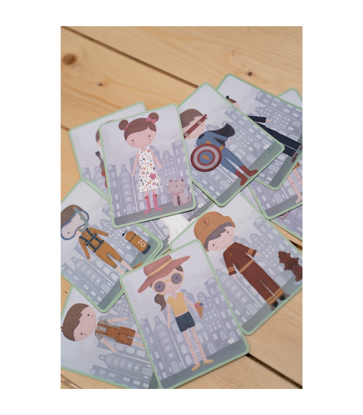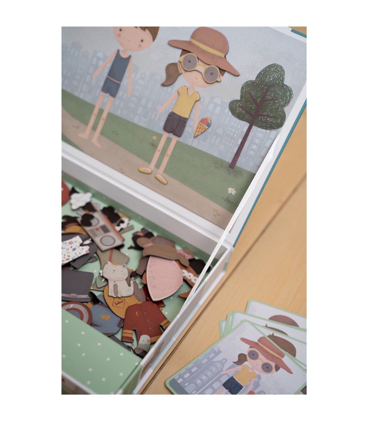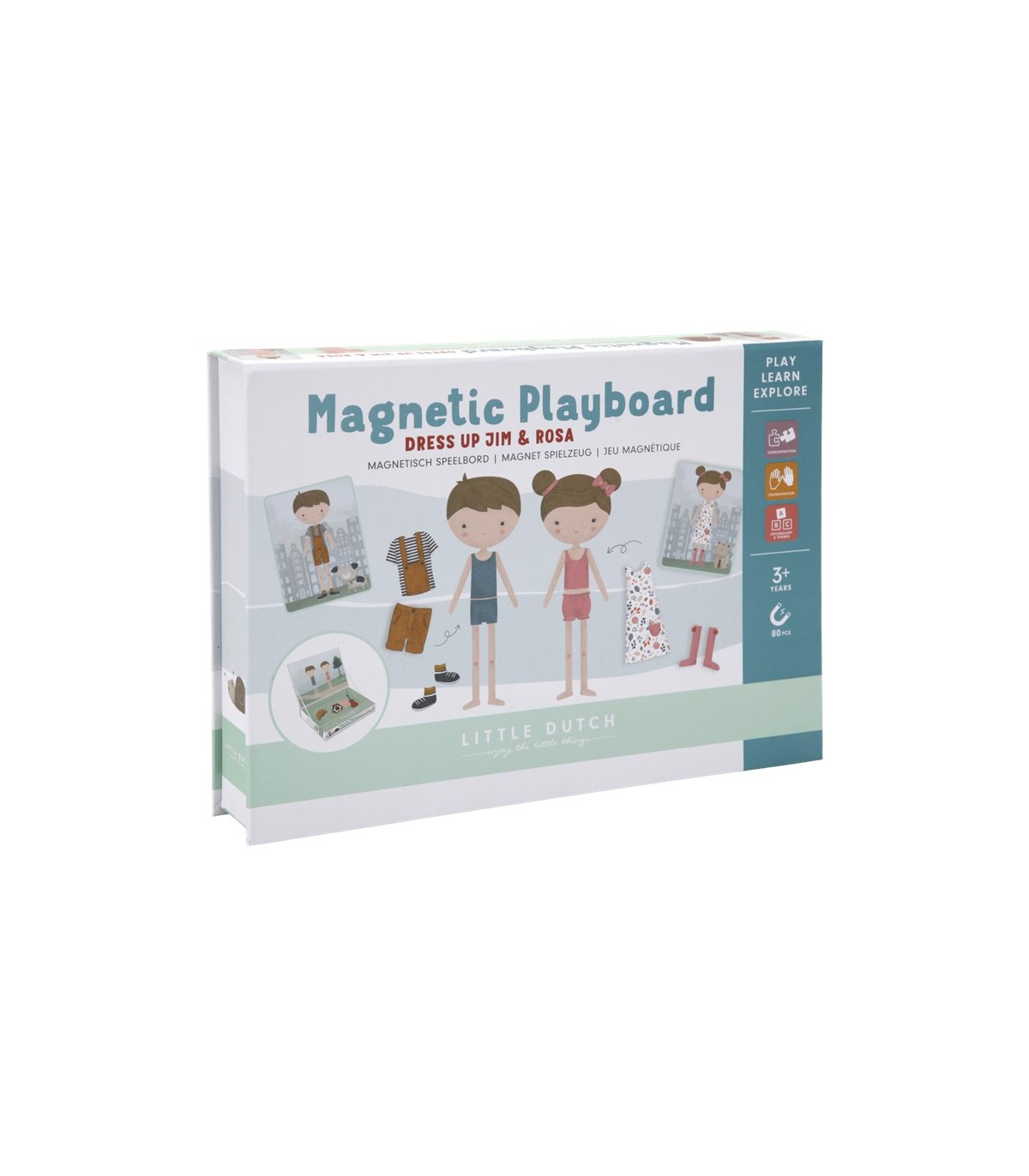 Descripción ¡Juega a disfrazarte con Jim & Rosa! Con este puzle magnético puedes copiar los atuendos de las cartas en el tablero con piezas magnéticas. O usar tu propia fantasía. Hay un sinfín de combinaciones que garantizan mucha diversión mientras fomentan el vocabulario y la coordinación. Para jugar en casa, pero también de viaje.Incluye 80 imanes pequeños, 6 tarjetas para Rosa y 6 para Jim. La caja está hecha de cartón resistente para un fácil almacenamiento de todos los artículos y la tapa magnética funciona como tablero de juego .