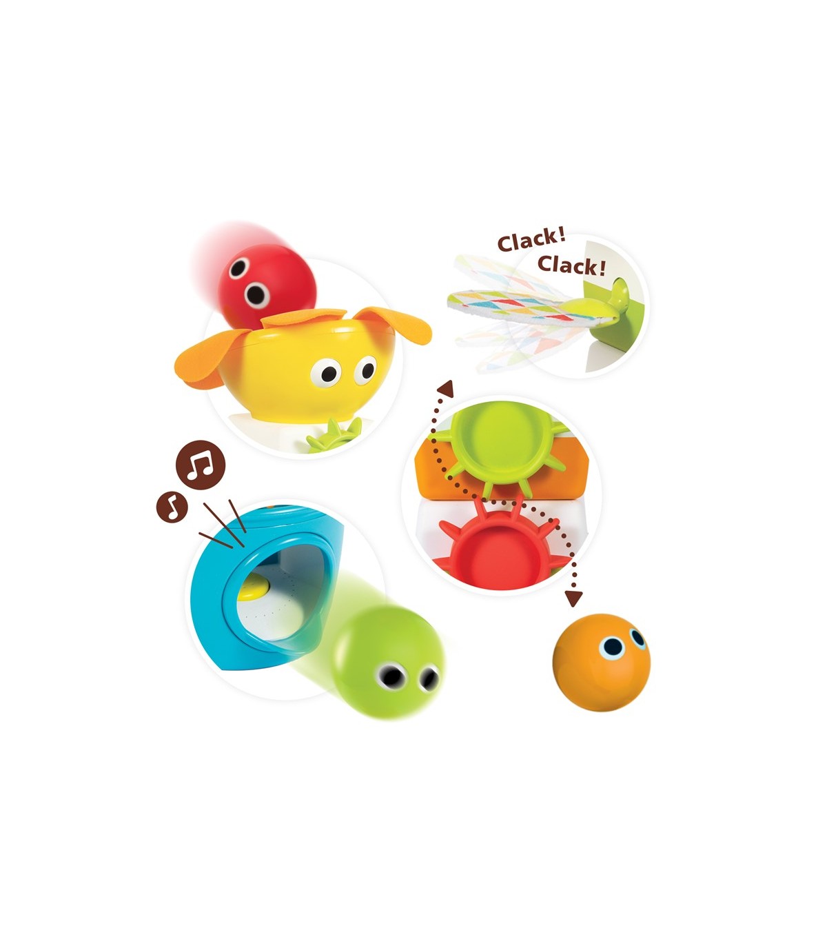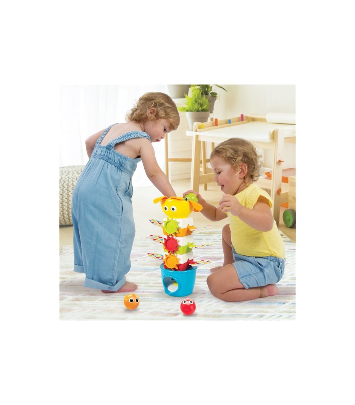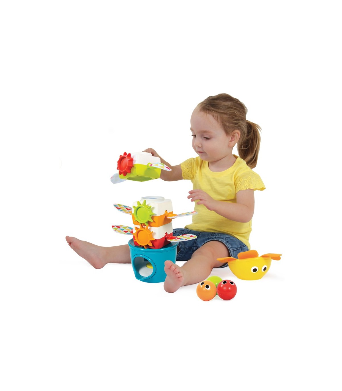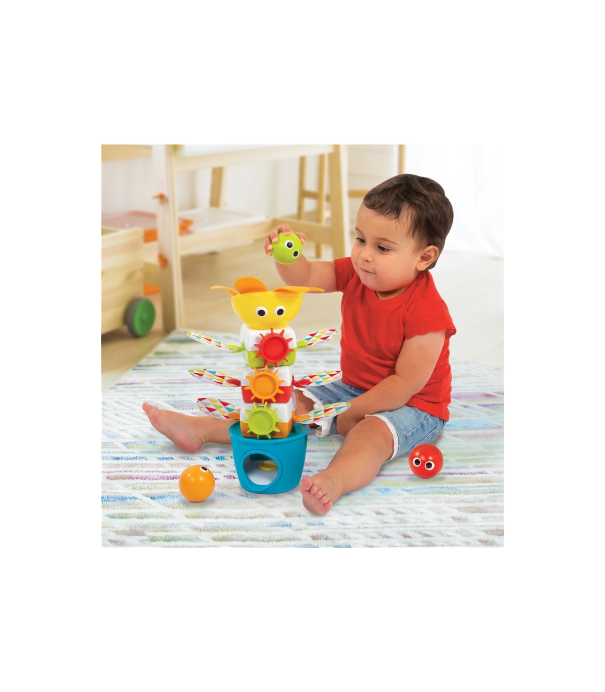Descripción Increíble e interesante juego lleno de diversión.Se pueden apilar hasta 5 bloques de colores y después lanzar las tres bolas por el centro. Se oyen divertidos sonidos cuando las bolas chocan contra el fondo. Las suaves alas se mueven cuando las bolas pasan por ellas.Cada bloque de apilar tiene una actividad diferente con clicks y vibraciones, diseñado para llamar la atención del bebé a explorar y perfeccionar sus habilidades motoras. El bloque superior con aspecto de flor contiene pétalos suaves al tacto.Pilas no incluidas.