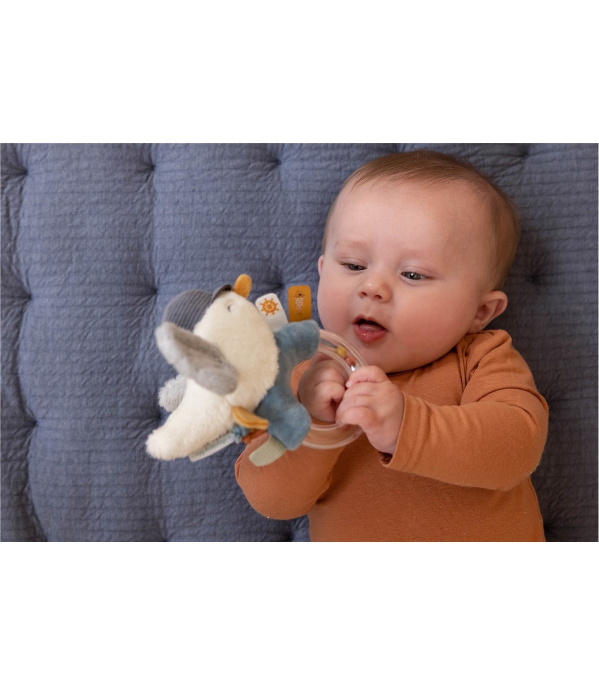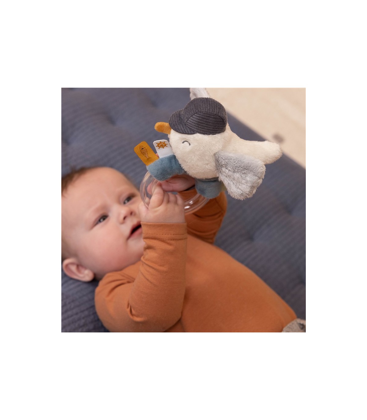 Descripción De la costa a la cama. Este sonajero fácil de agarrar con forma de una gaviota lo convierte en un atractivo primerjuguete. Diseñado para mantener ocupado a su bebé, ofrece varios detalles de entretenimiento, que van desde etiquetas ilustradas hasta coloridos pequeños nudos. Las alas de la gaviota hacen un crujido.