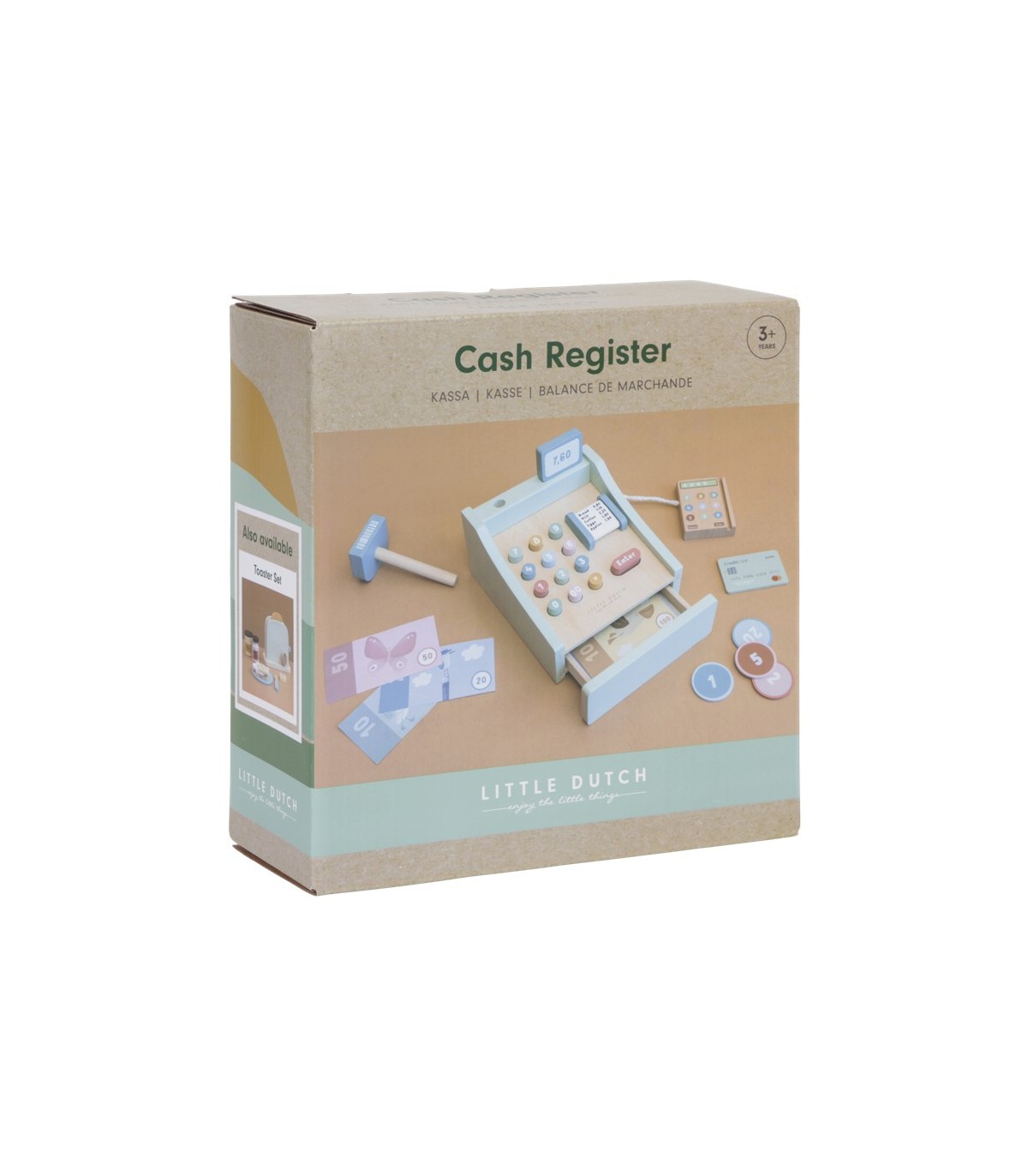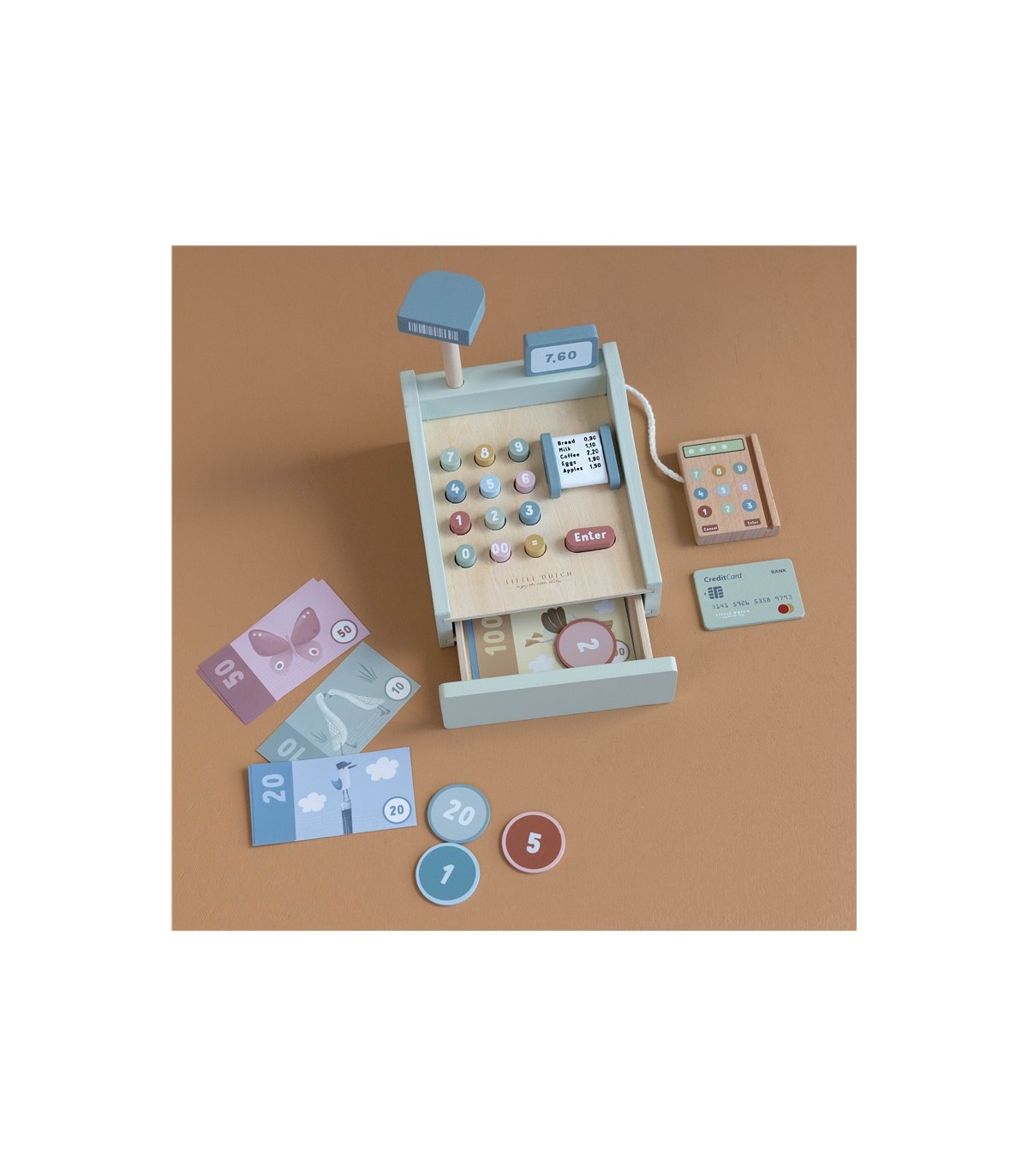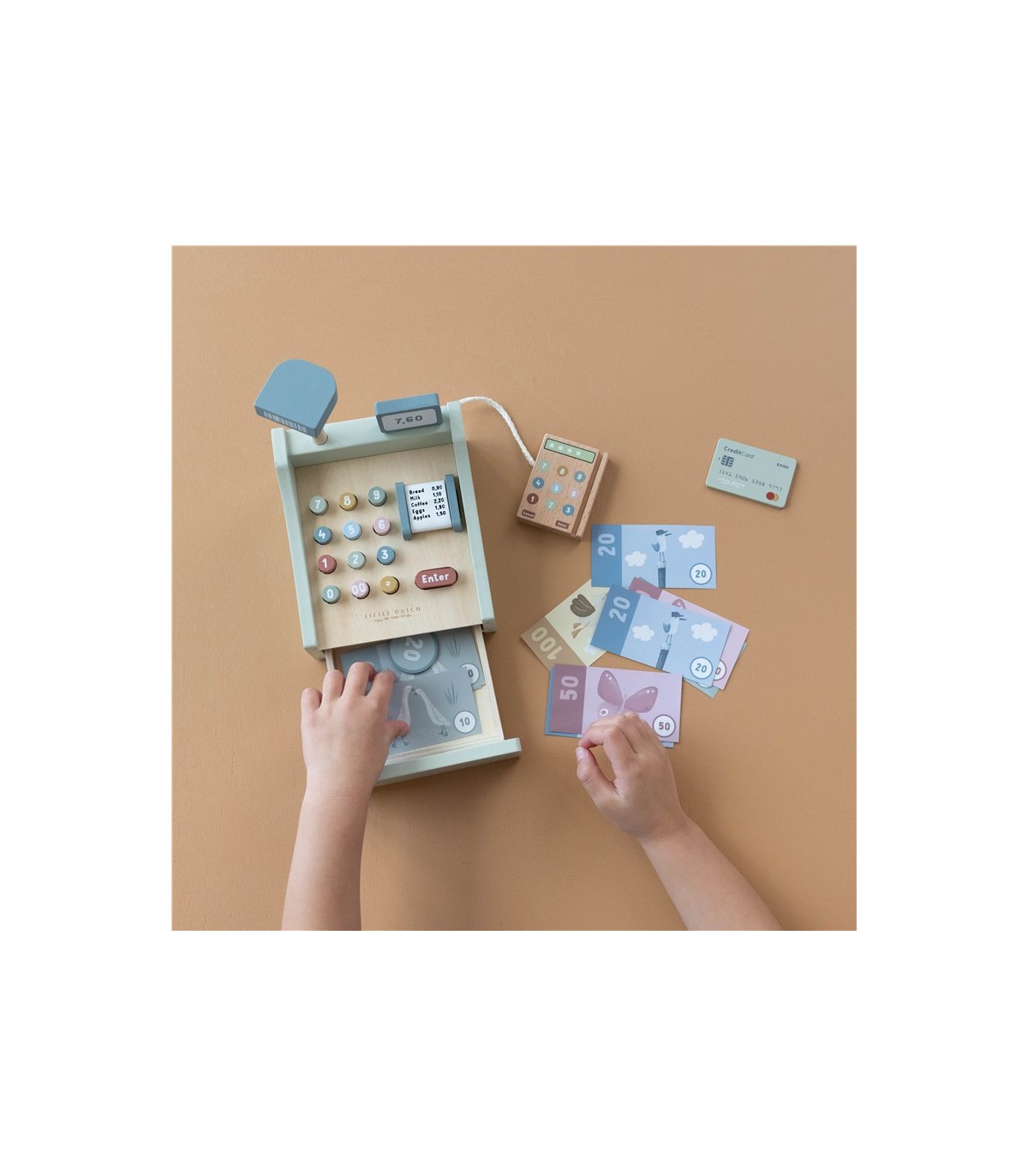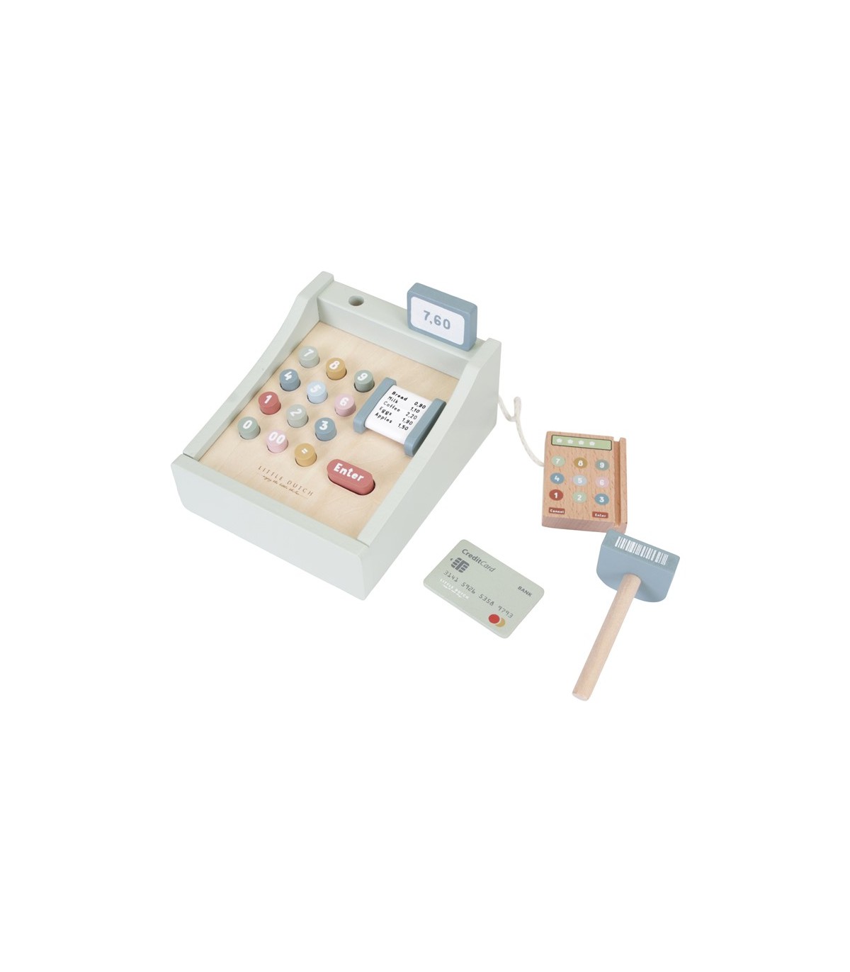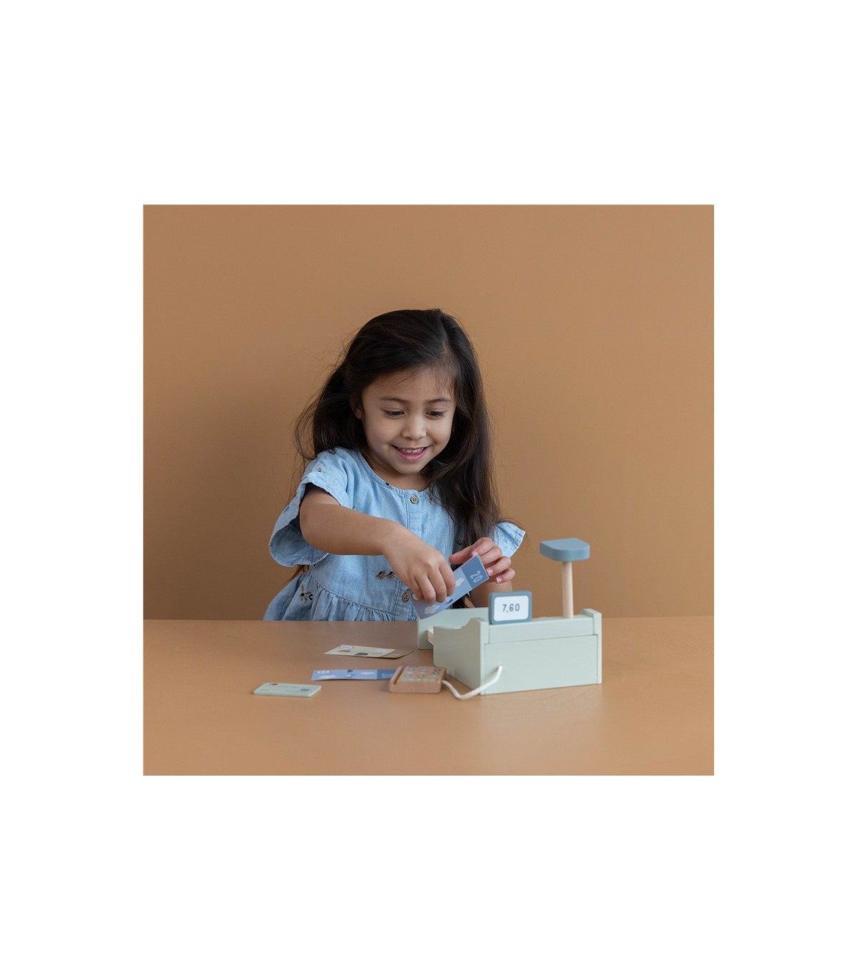 Descripción ¡Vamos a jugar a comprar! Imagínate teniendo tu propia pequeña tienda. Escanea los productos y presiona los botoncitos para mostrar el total. ¿Quieres pagar en efectivo o con tarjeta? Esta caja registradora de madera viene con el terminal para pagar con tarjeta y con el cajón para guardar las monedas, los billetes y los tickets. Todo lo que necesitas para jugar a las tiendas con papá, mamá, amigos o muñeca favorita. La caja registradora de juguete no es solo genial para el juego simbólico además te ayudará a desarrollar las habilidades matemáticas, motoras y sociales.