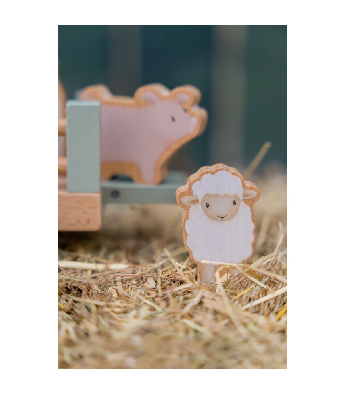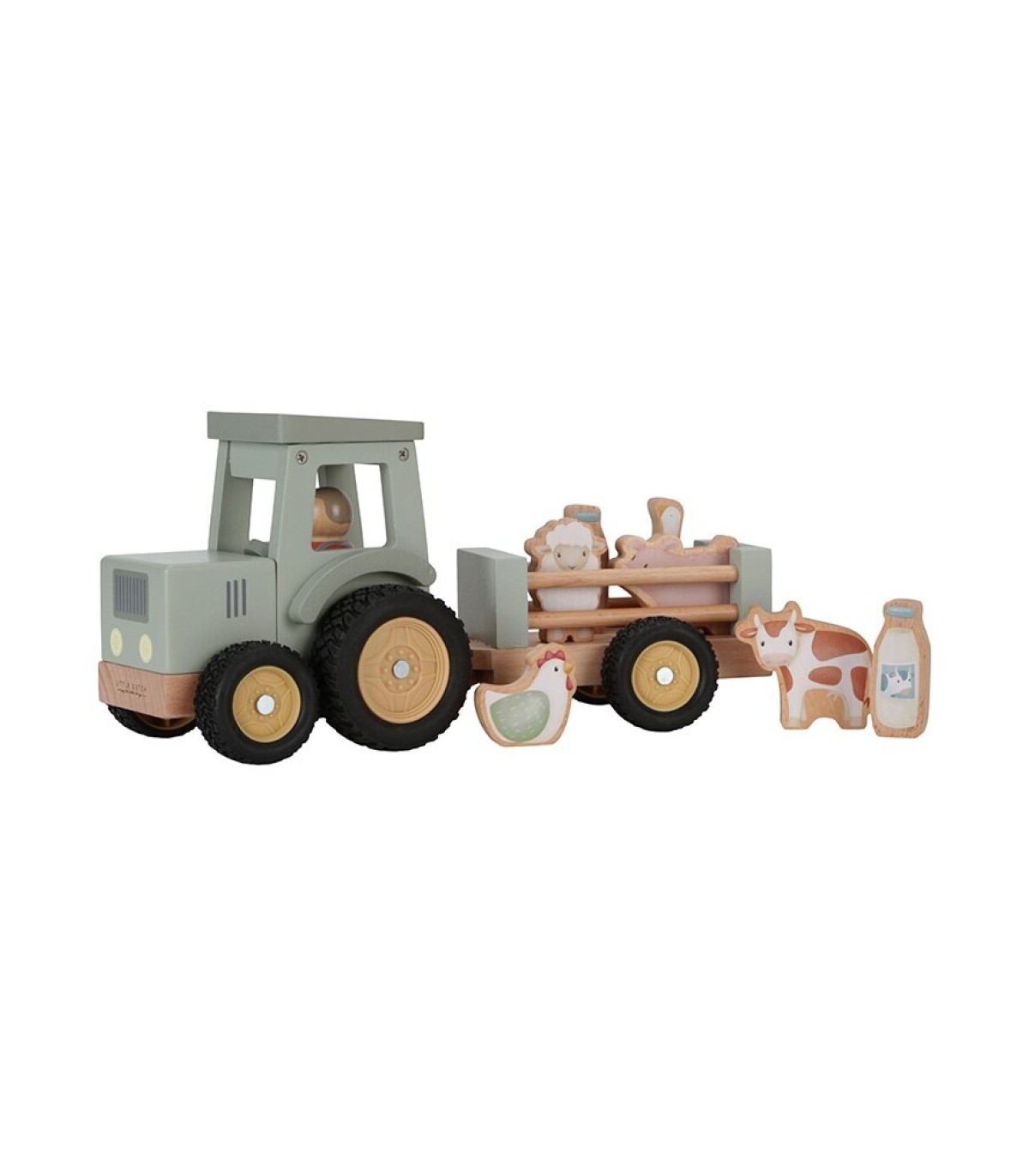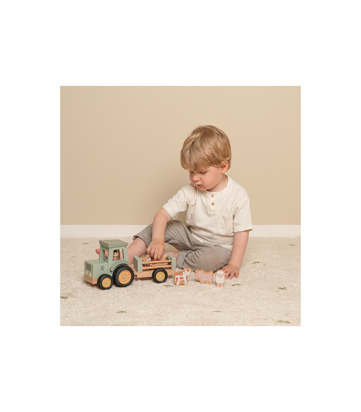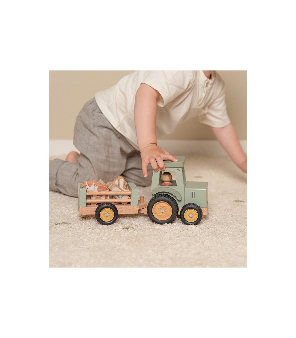 Descripción ¡Vroom vroom, aquí viene el tractor con todos los animales! Juguete súper divertido para estimular la imaginación de tu pequeño. Además de los animales, también encontrarás dos botellas de leche en el remolque. Lleva todo a la granja y tu tarea estará completa. Todo está hecho de madera, por lo que puede durar mucho tiempo.