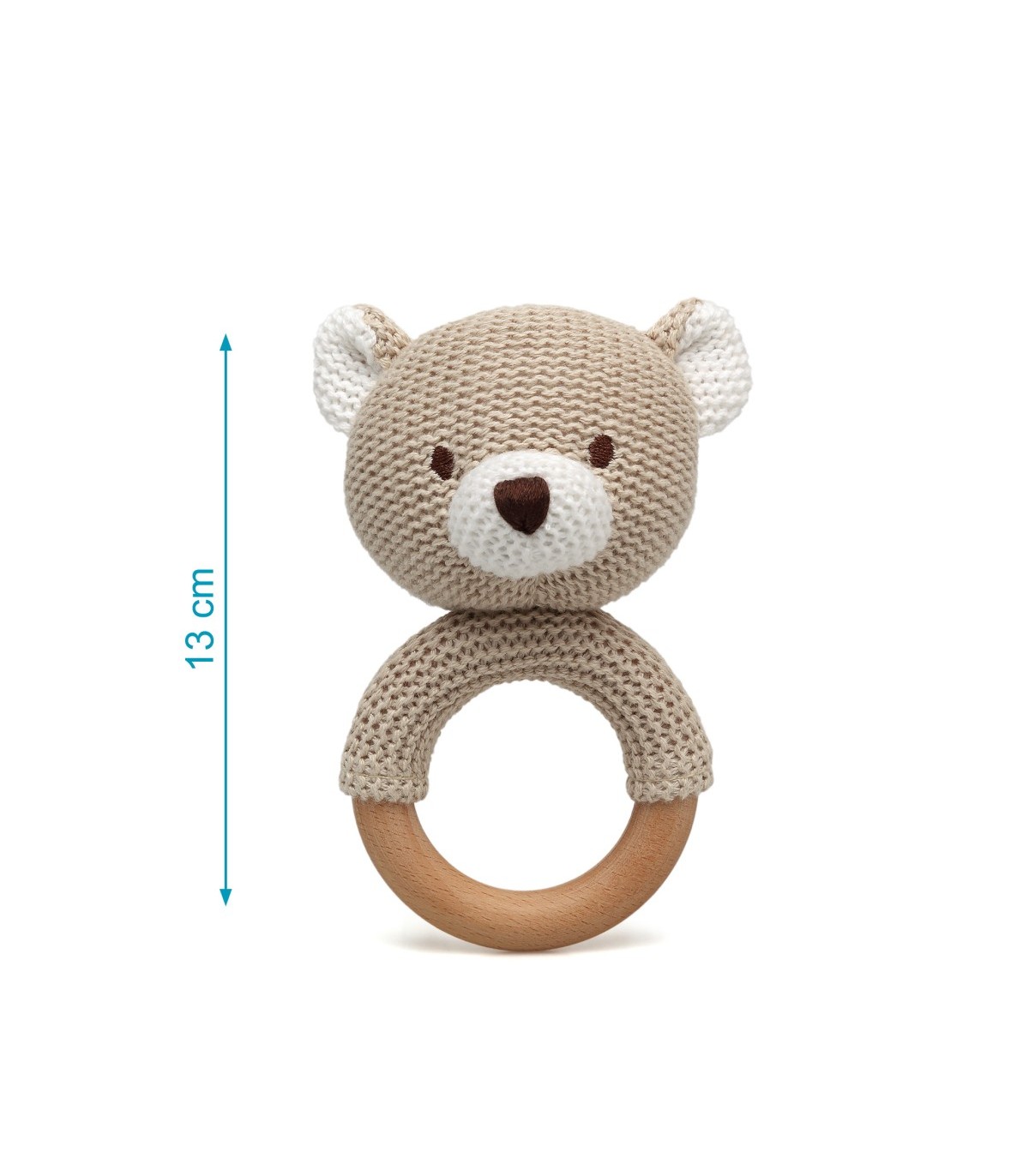 En este caso, se trata de un mordedor de madera de haya con forma de osito beige.