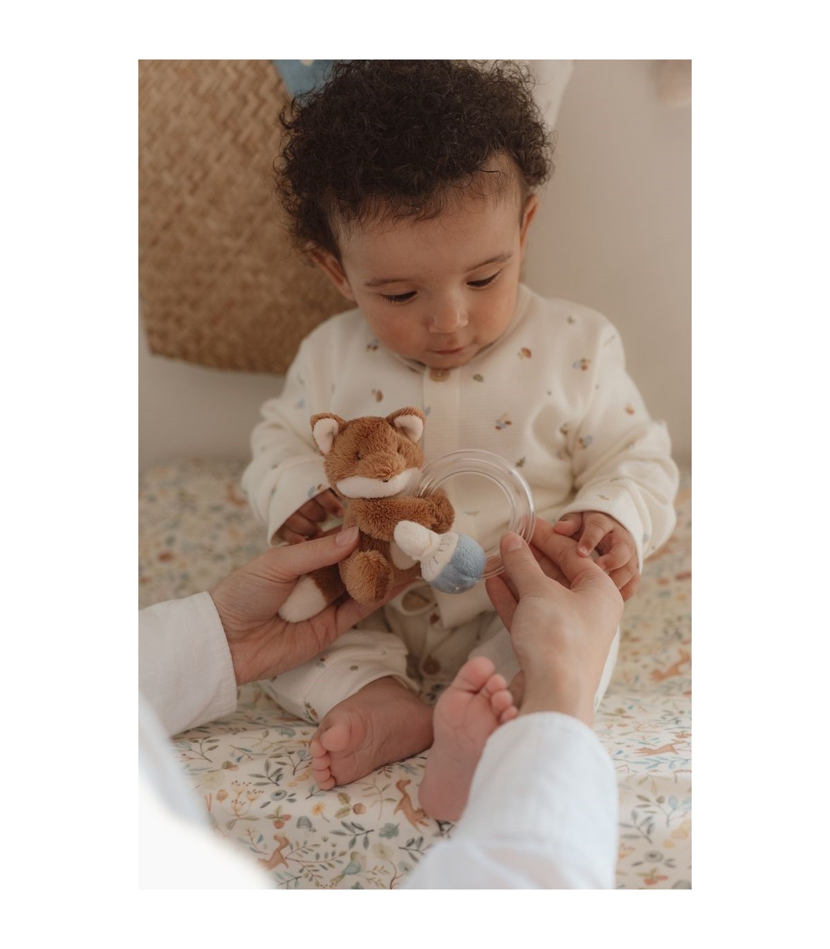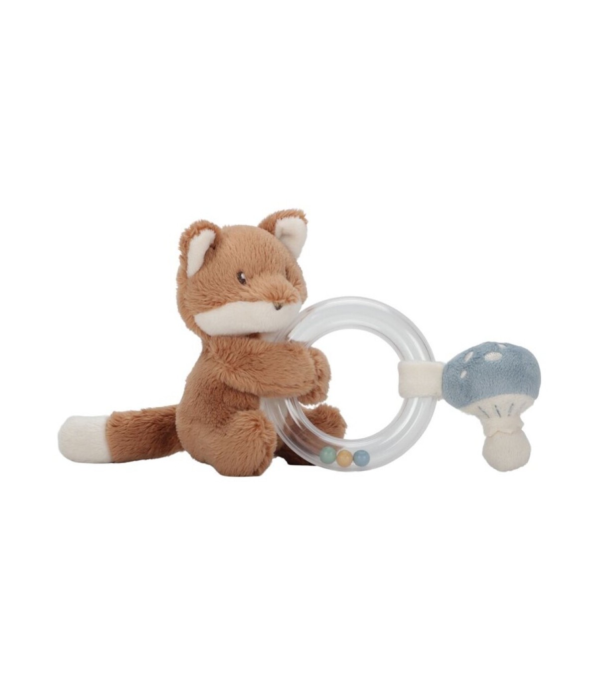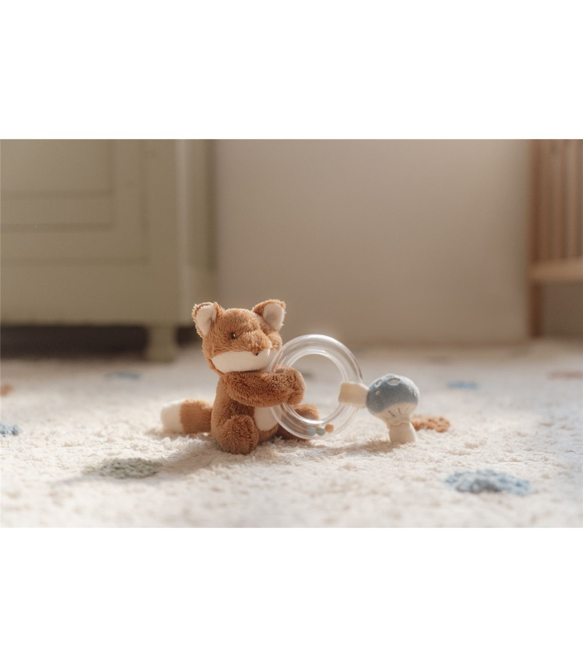 ¡Agarra, gira y sacude! El adorable zorro con su suave pelaje y su pequeña cola te invita a jugar y a poner en movimiento este sonajero. También ha elegido un pequeño hongo para que lo acaricies. El anillo transparente contiene 3 pequeñas cuentas de colores que empiezan a sonar cuando tu bebé juega con este divertido juguete. El sonajero no solo despierta la curiosidad y los sentidos de tu bebé, sino que también mejora la coordinación mano-ojo.
