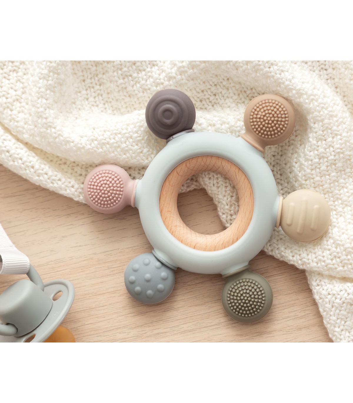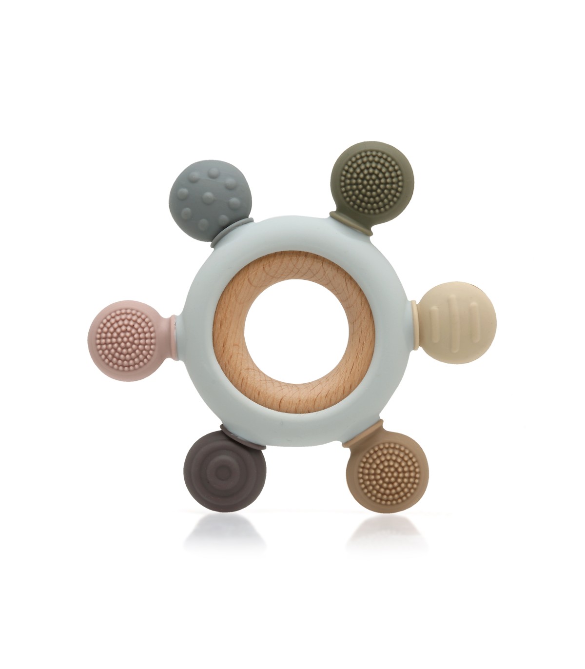 Para aliviar estos síntomas, debemos dar al bebé algo para morder. Para ello contamos con una completa colección de mordedores en silicona y madera de haya, muy fáciles de sujetar, con diferentes colores y texturas para masajear las encías, y mejorar los síntomas de la dentición de tu bebé. Nuestro mordedor es un juguete perfecto para que juegue y pueda aliviar esas molestias de la dentición del bebé. Tiene forma redonda con salientes redondeados para que lo coja con facilidad con una o dos manos y pueda jugar con él además de morderlo. Estimula sus sentidos de la vista y el tacto gracias a sus distintas texturas. Sus bordes están hechos de suave silicona para que lo pueda morder tanto como quiera. Está fabricado en suave silicona de alta calidad, ofreciendo las ventajas de este material: no absorben olores ni sabores y su forma y textura se mantienen inalteradas con el uso y el contacto con otras sustancias. Puedes soltar la silicona de la madera para una mayor higiene de los materiales por separado. Está recomendado para niños de +3 meses.