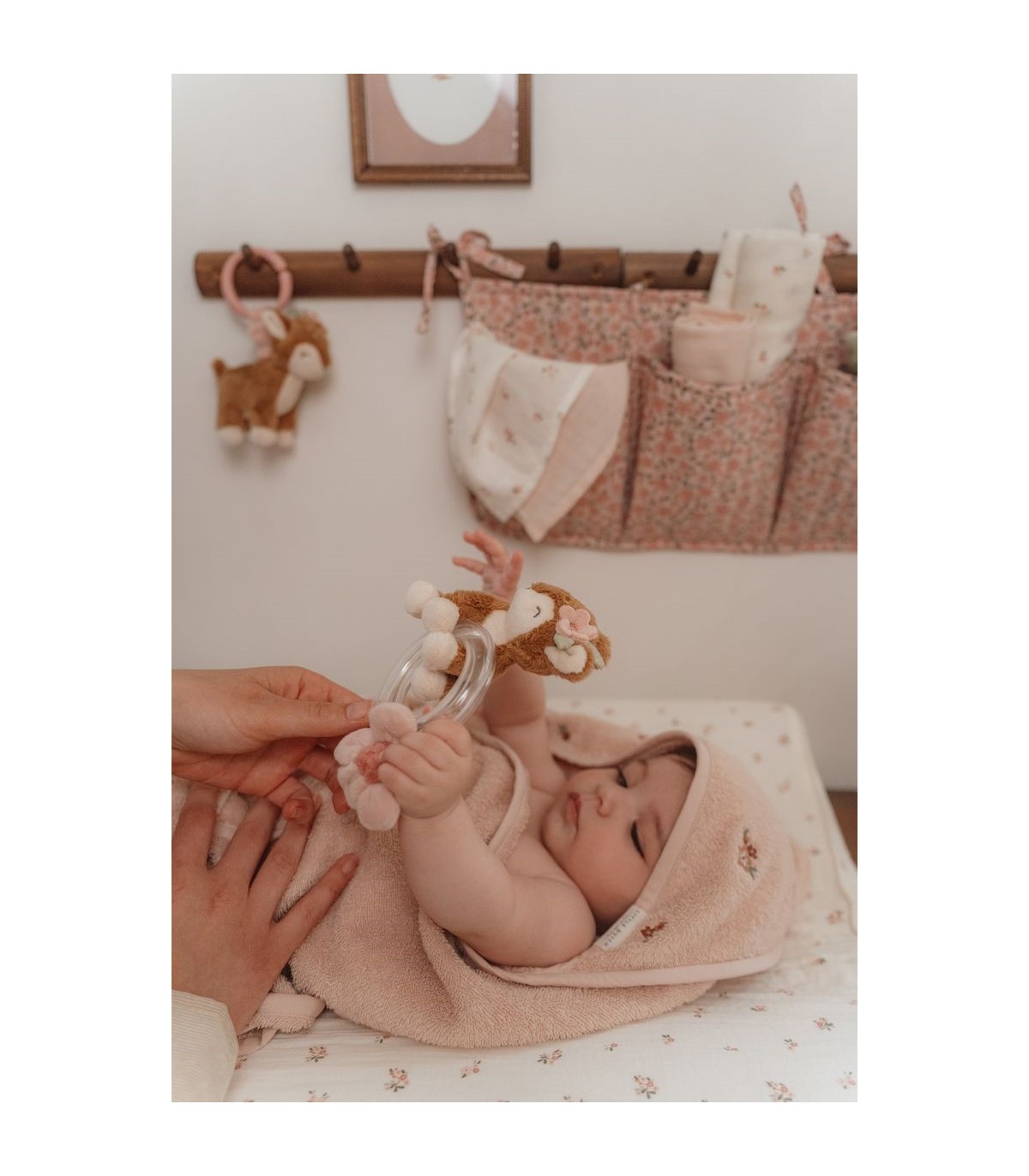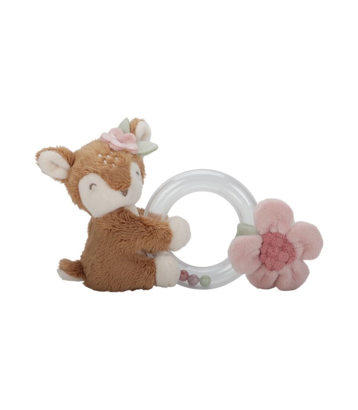 ¡Agarra, gira y sacude! El adorable ciervo con su suave pelaje te invita a jugar y a poner en movimiento este sonajero. También ha escogido una pequeña flor para que la abraces. El anillo transparente contiene 3 pequeñas cuentas de colores que empiezan a sonar cuando tu bebé juega con este divertido juguete. El sonajero no solo despierta la curiosidad y los sentidos de tu bebé, sino que también mejora la coordinación mano-ojo.