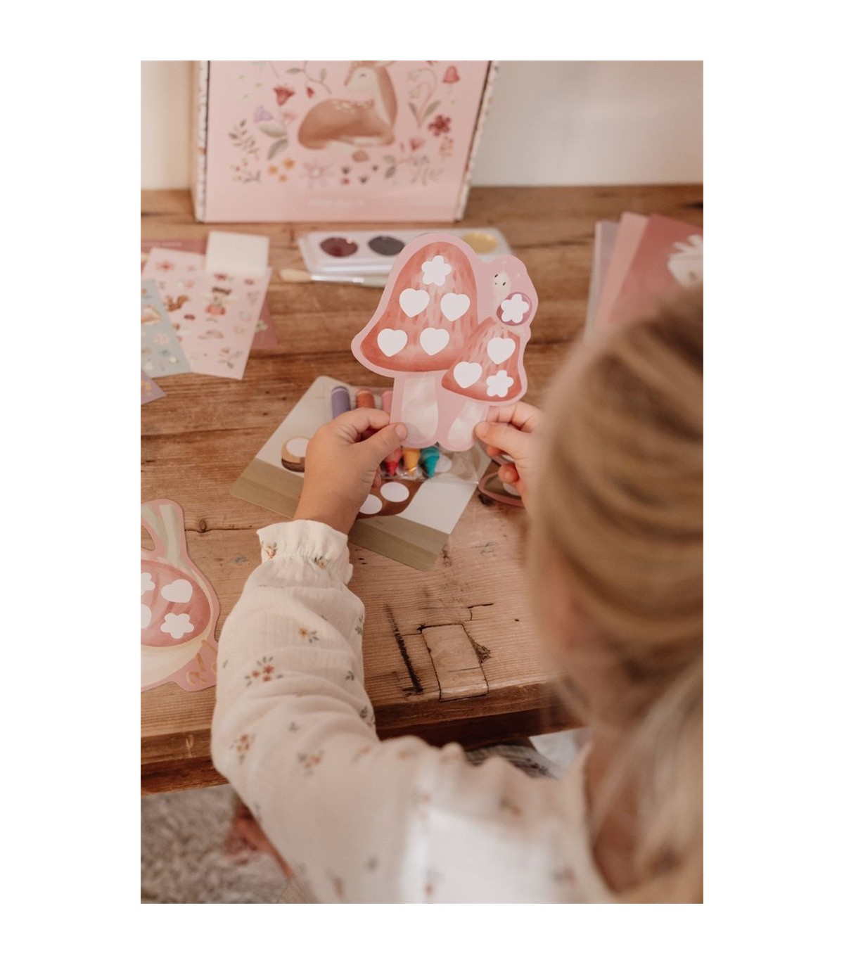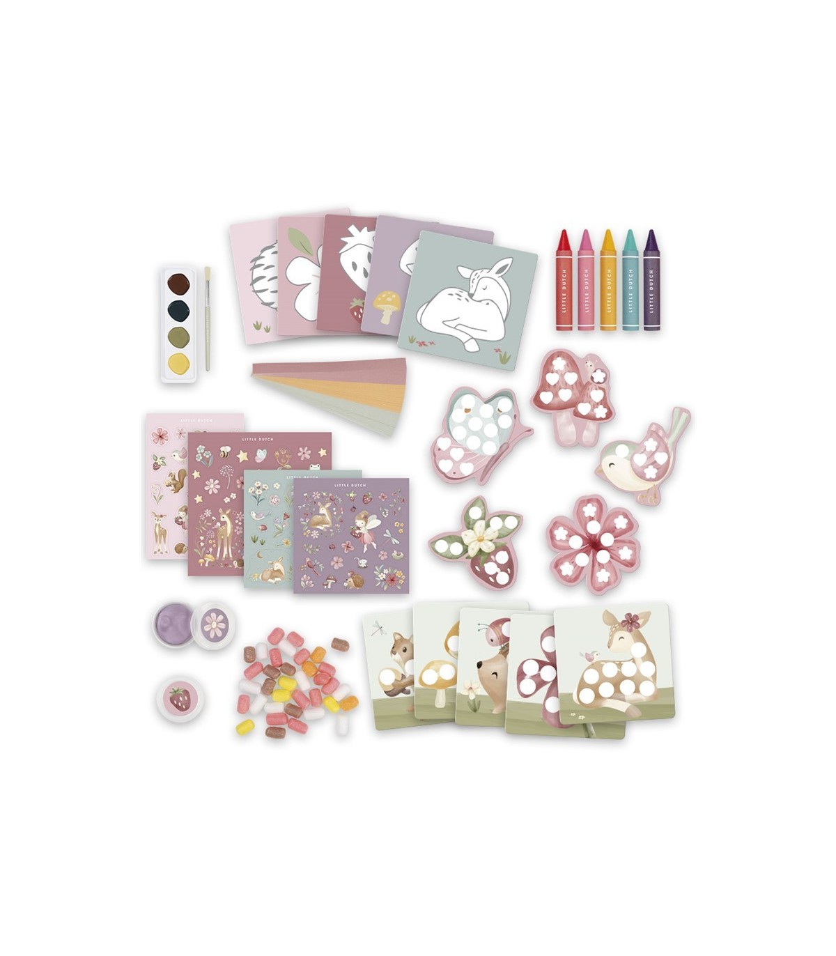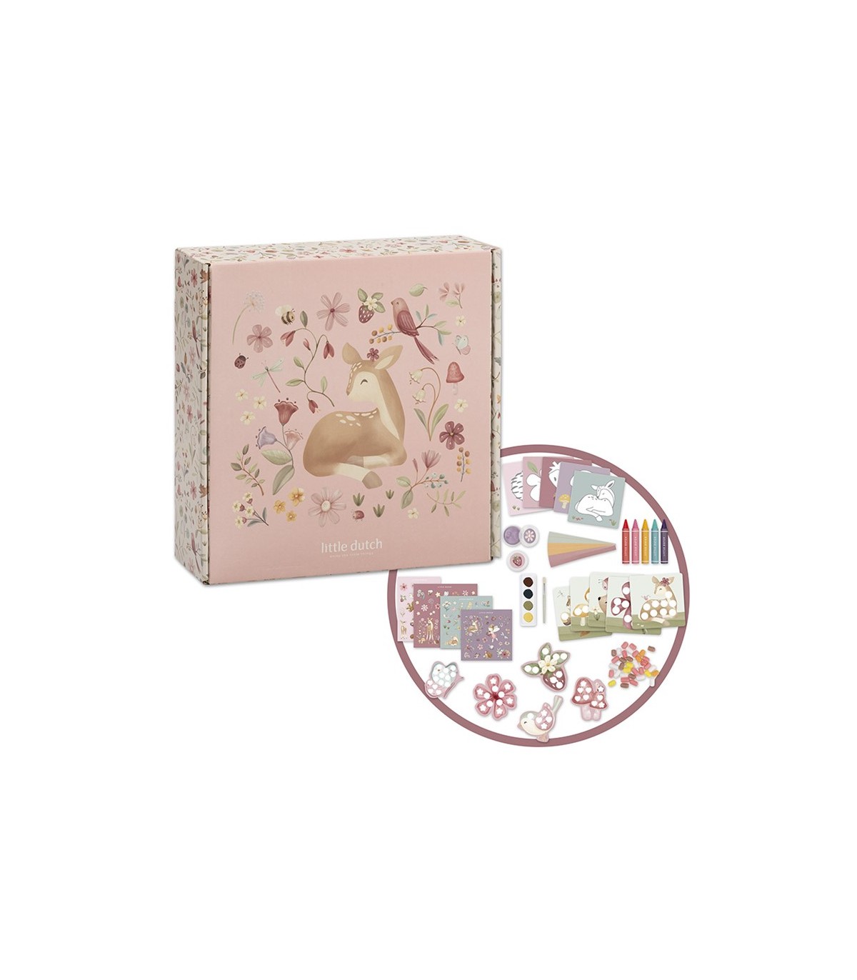 Descripción Caja de creatividad Fairy Friends con todo lo que necesitas para empezar a ser creativo inmediatamente, por ejemplo: pegatinas, papel de dibujo, ceras, pintura, arcilla expandida, sellos, pegatinas, etc.