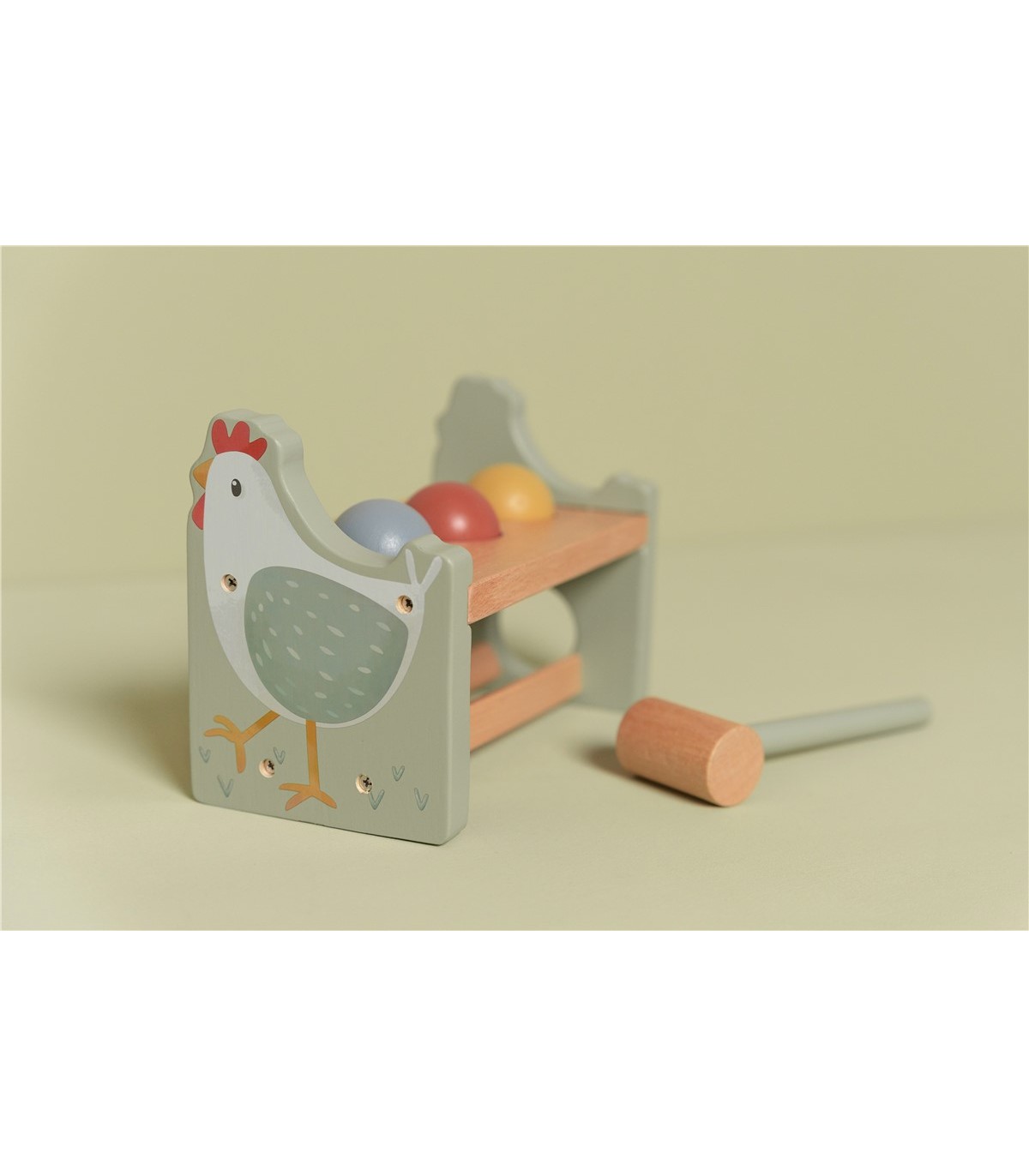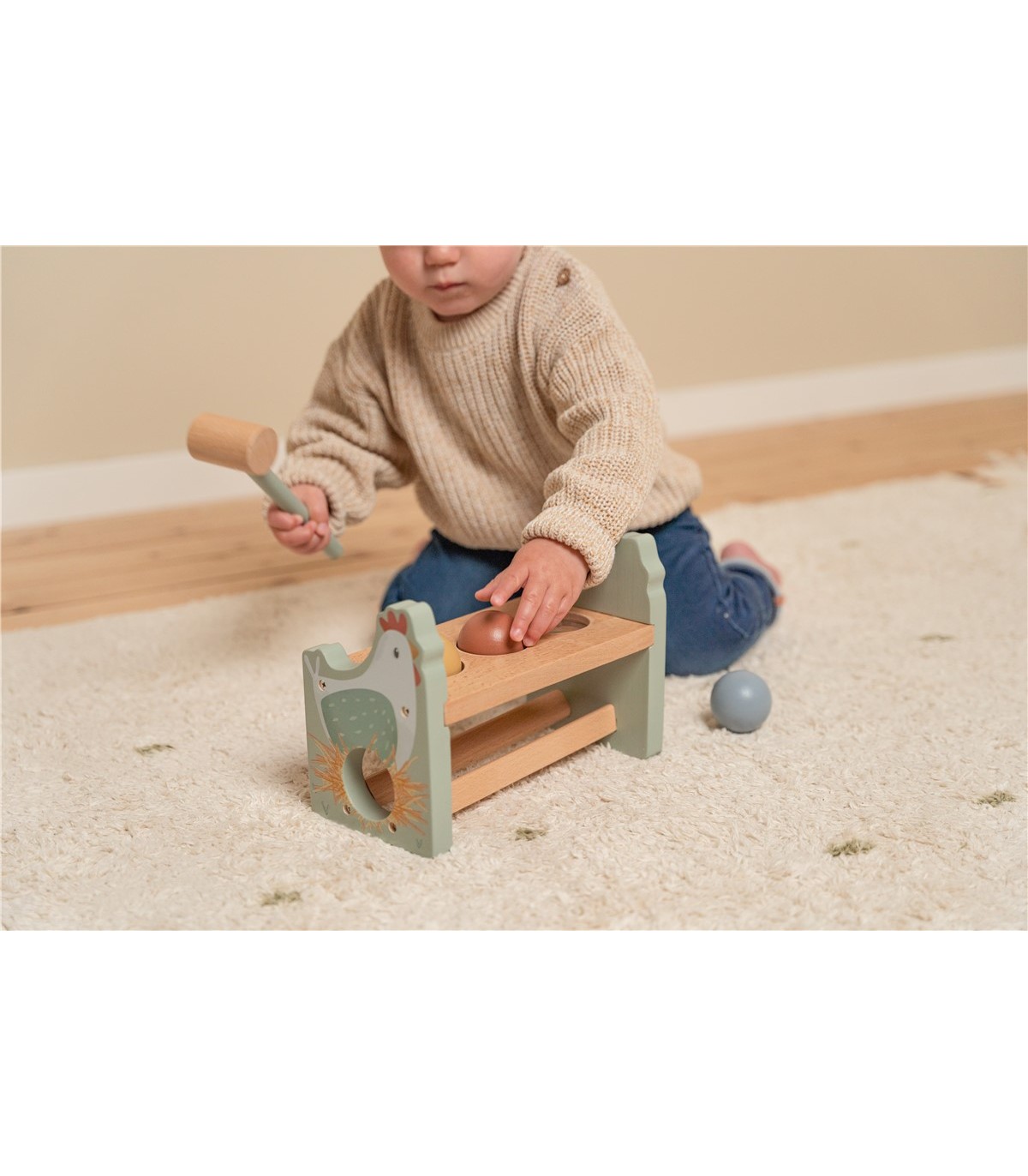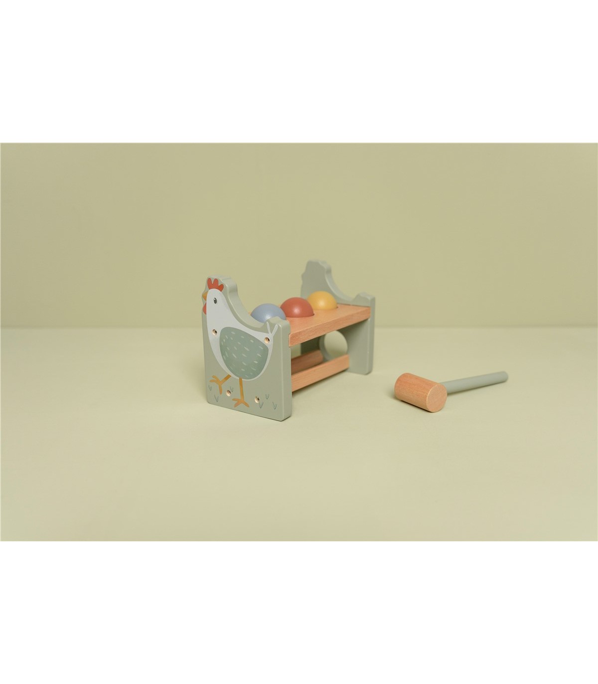 ¡Tik tik tik! Haz que la gallina ponga un huevo golpeando las 3 bolas en el banco de golpeo de madera con el martillo. Este es un buen ejercicio para las habilidades motoras de su hijo. ¿Han entrado todas las bolas? Vuelve a colocar las bolas y comience de nuevo. ¡Estarán ocupados con esto por un tiempo!