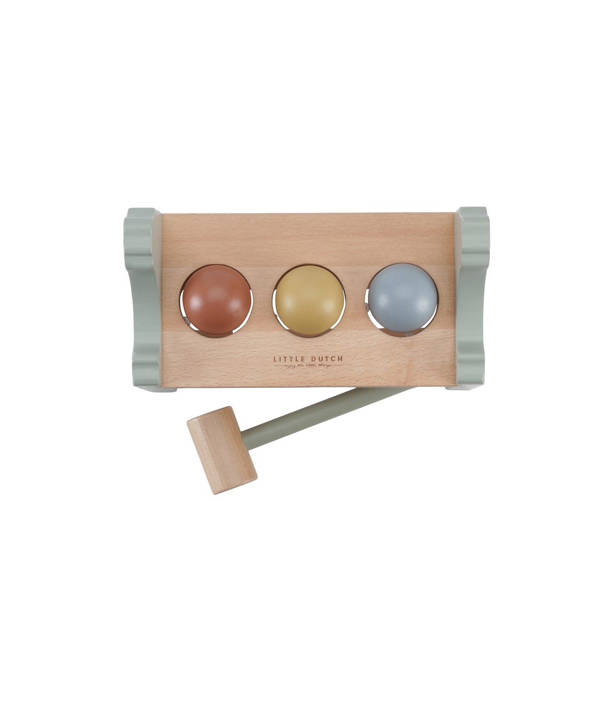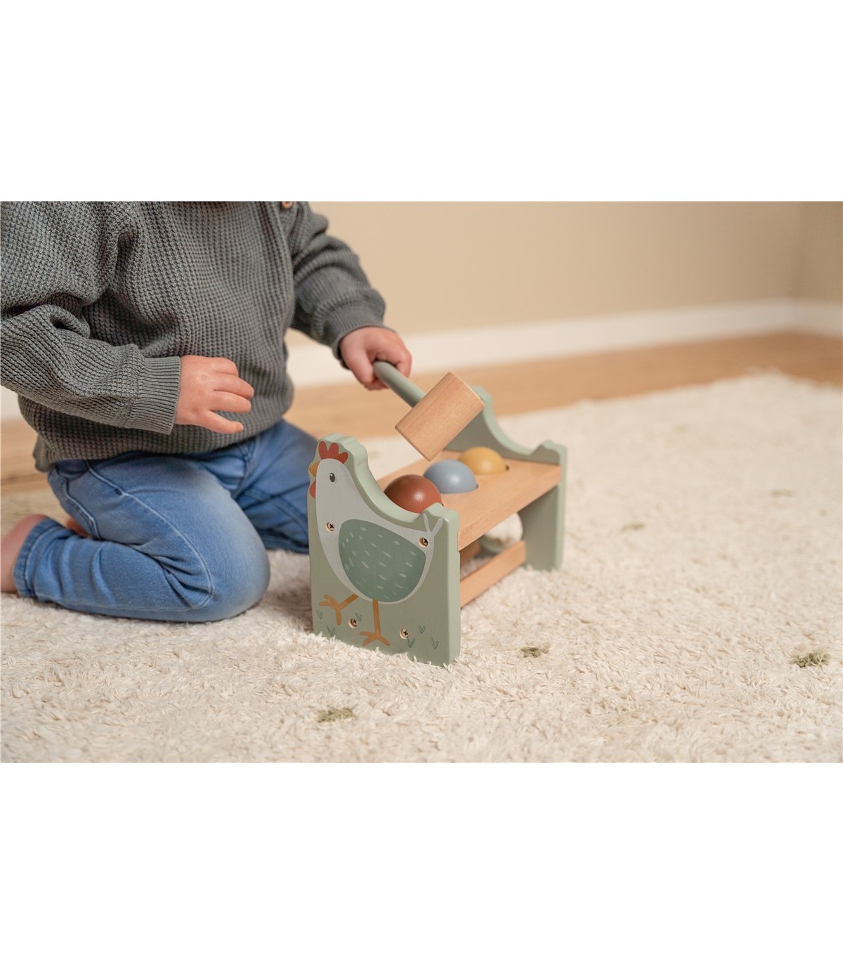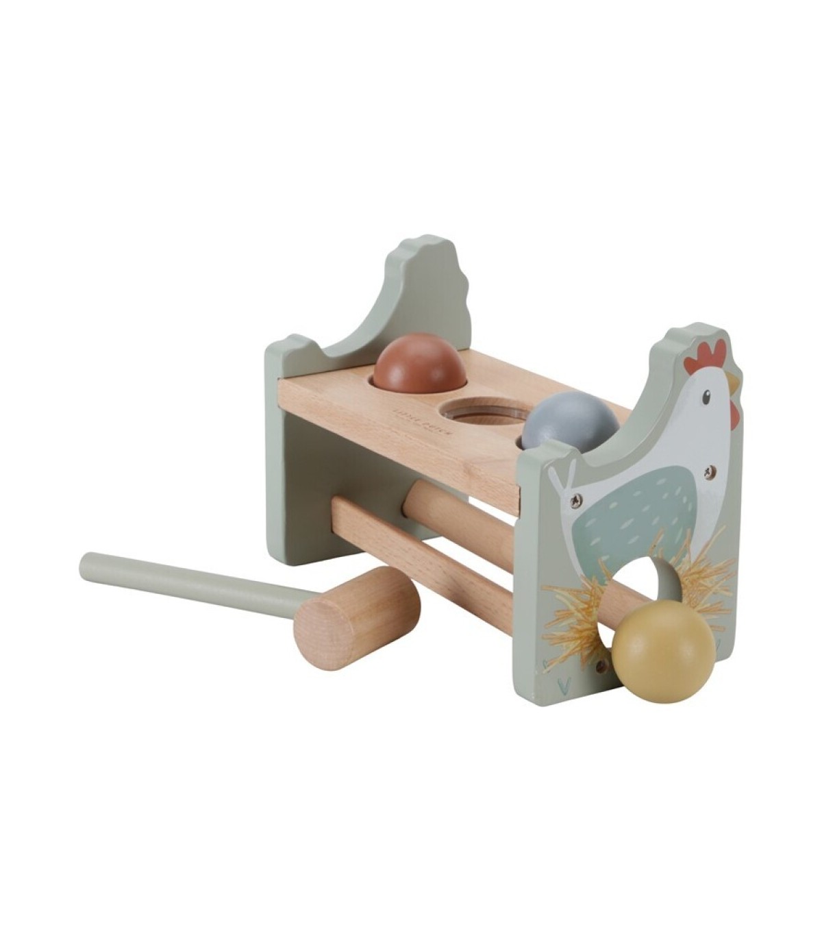 ¡Tik tik tik! Haz que la gallina ponga un huevo golpeando las 3 bolas en el banco de golpeo de madera con el martillo. Este es un buen ejercicio para las habilidades motoras de su hijo. ¿Han entrado todas las bolas? Vuelve a colocar las bolas y comience de nuevo. ¡Estarán ocupados con esto por un tiempo!