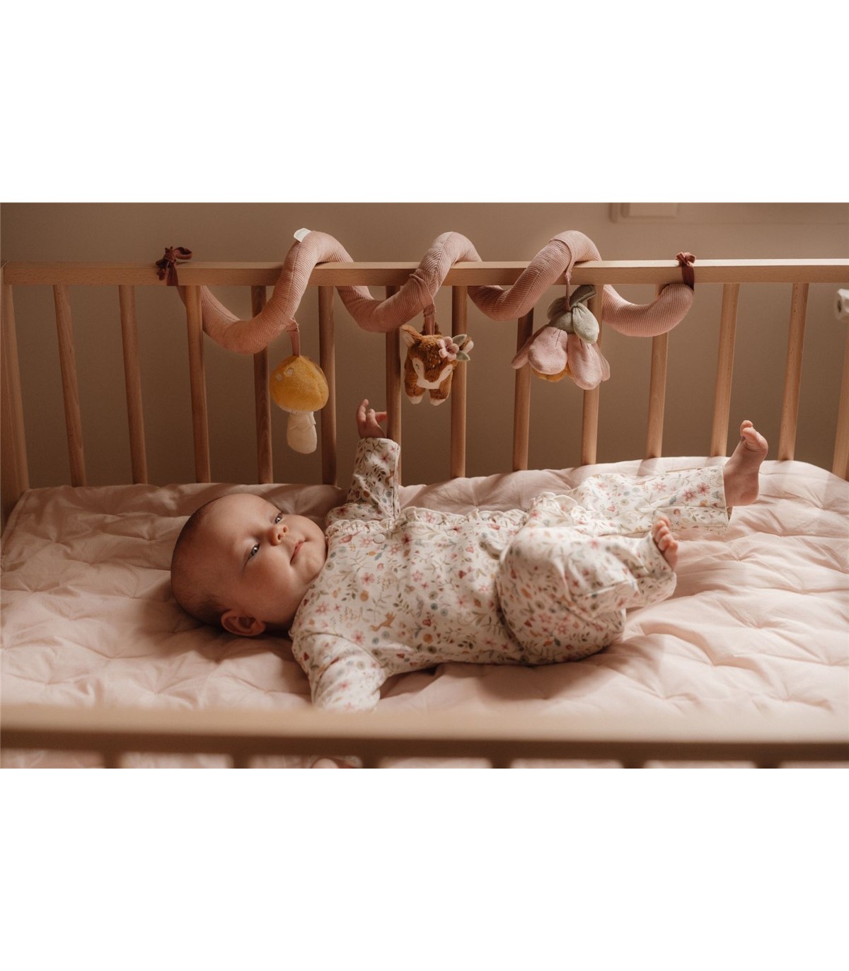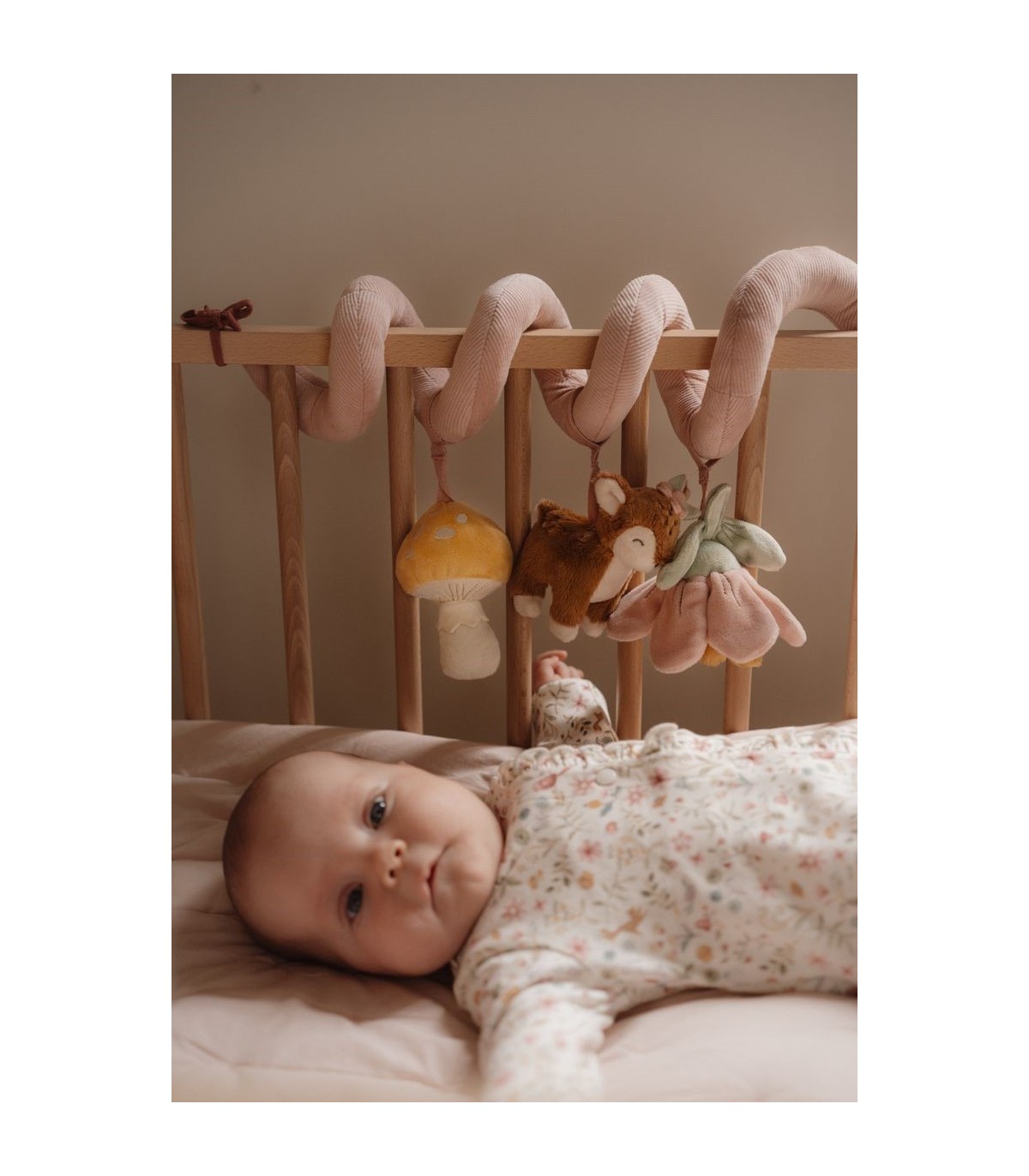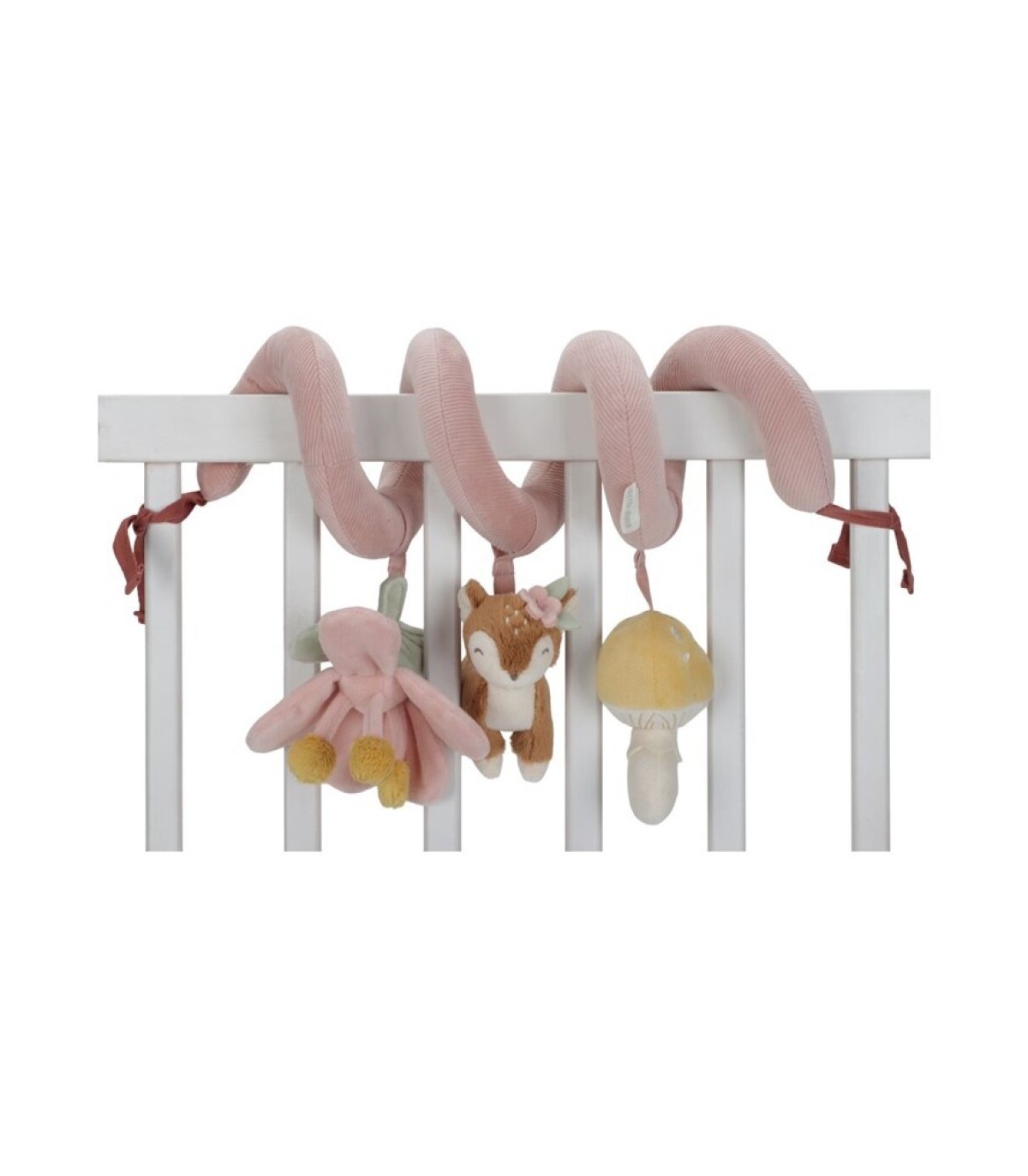 ¡Mira, siente y descubre! Esta divertida y entretenida espiral de actividades mantendrá a los bebés ocupados tanto en casa como cuando están de viaje. Fija fácilmente este práctico juguete a cualquier lugar, desde una cuna hasta un corralito. Fortalece los sentidos y estimula la coordinación mano-ojo. La espiral de actividades está hecha de pana con algodón y presenta un pequeño ciervo, un pequeño hongo y una hermosa flor. ¡ADVERTENCIA! Fija este juguete fuera del alcance del niño. Para evitar posibles lesiones por enredos, retira este juguete cuando el niño comience a intentar levantarse sobre sus manos y rodillas en posición de gateo. Requiere ensamblaje por parte de un adulto.
