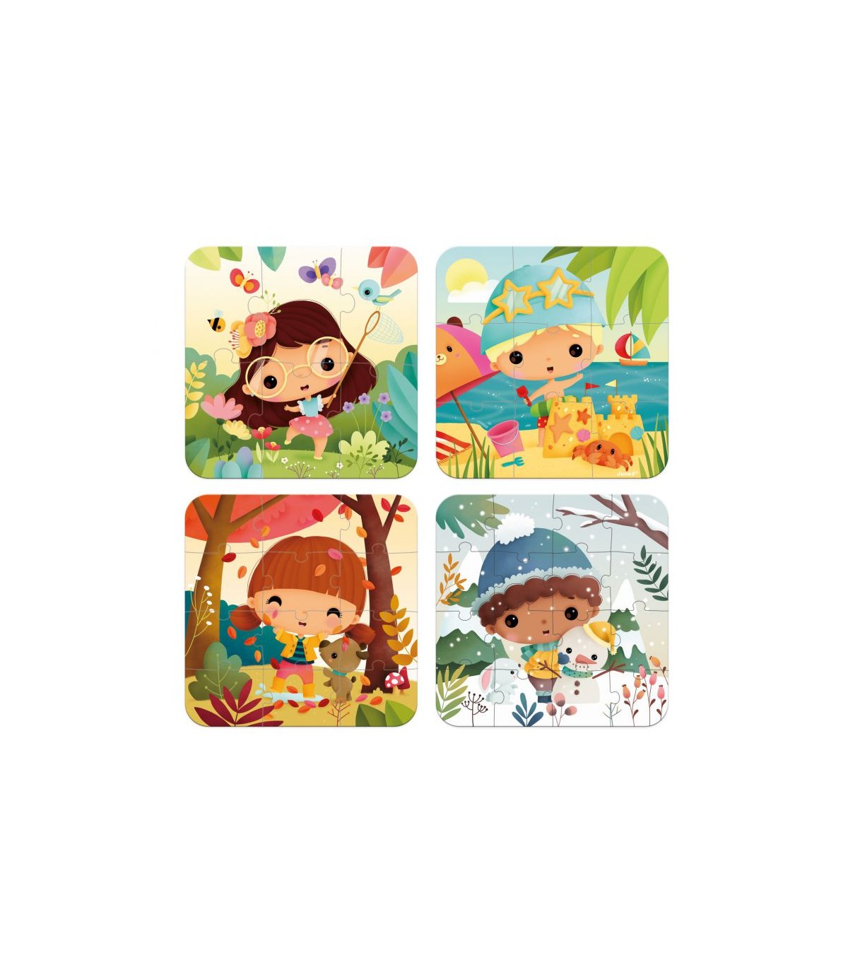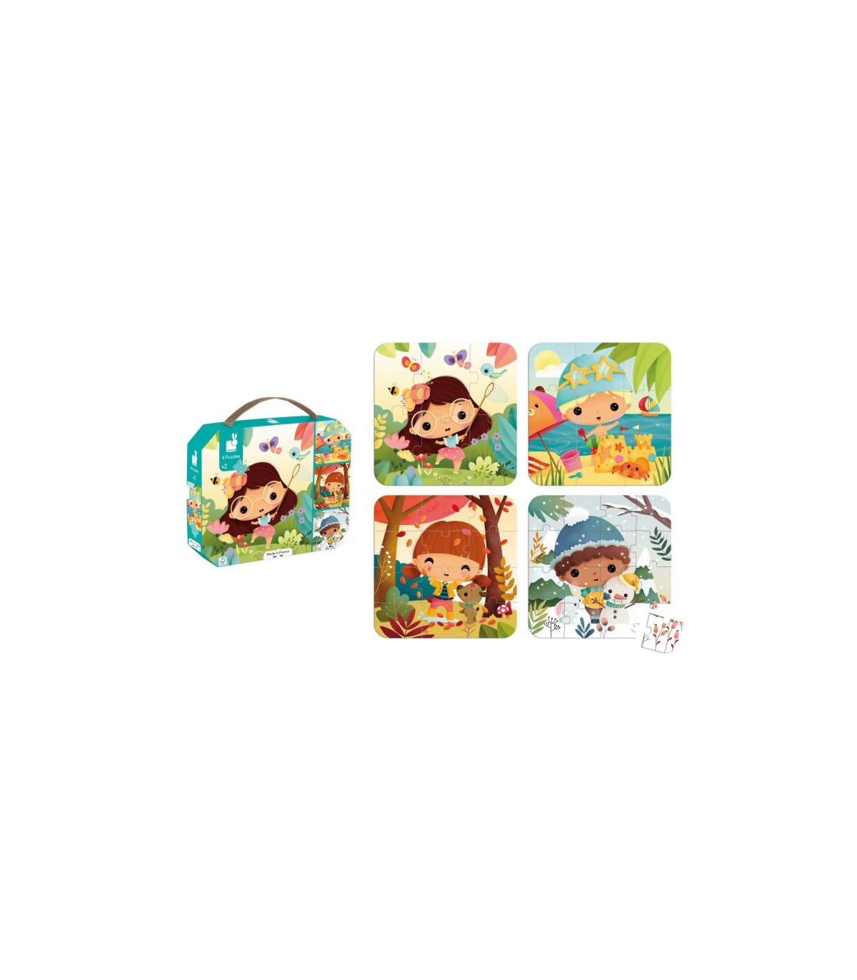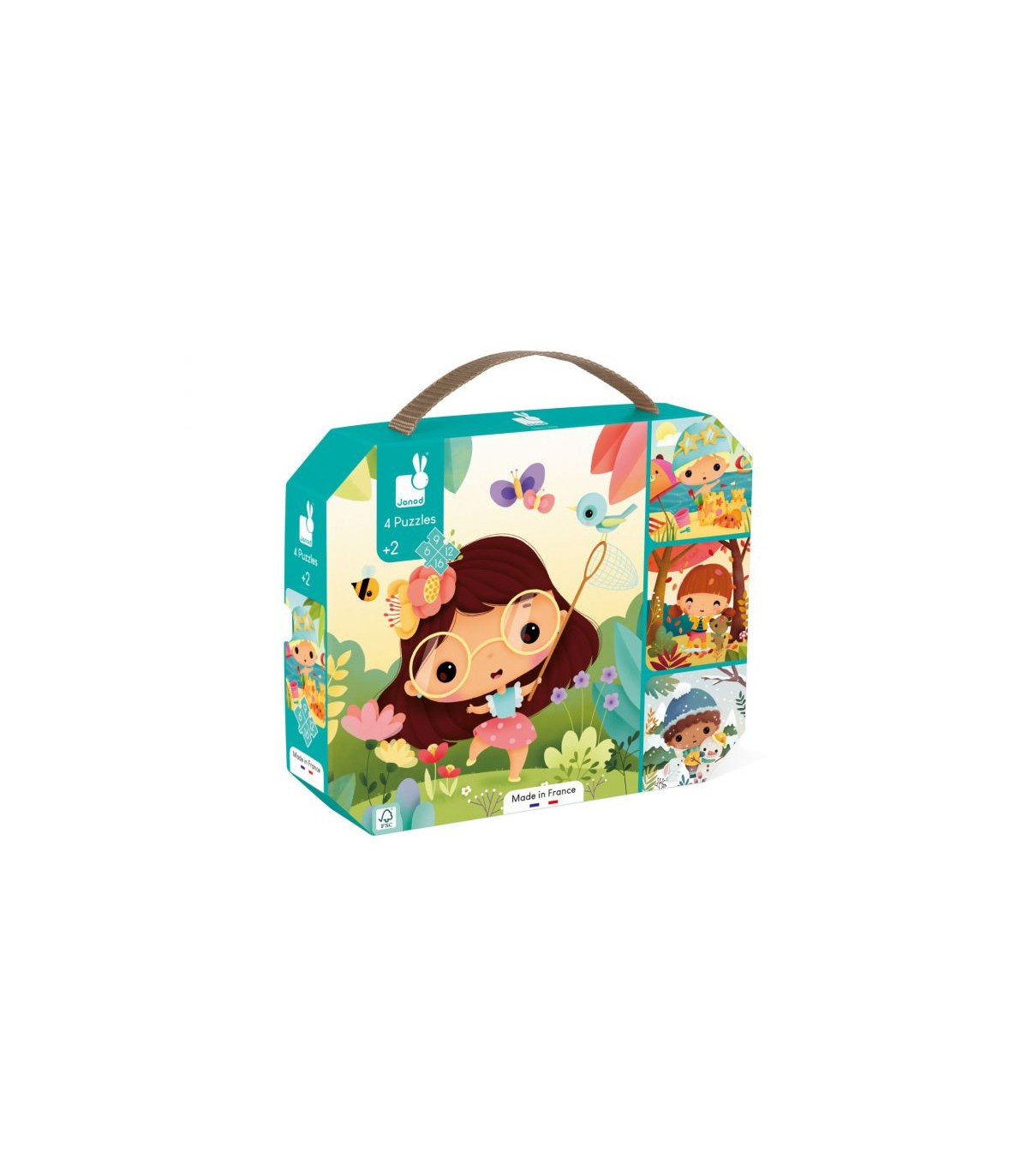 Descubre las características de cada estación con estos 4 puzles evolutivos de cartón. Compuestos por 6, 9, 12 y 16 piezas, su hijo irá progresando a su ritmo. Un color único en el dorso de cada puzle permitirá a su hijo encontrar las piezas correctas con mayor facilidad. Se transportan fácilmente gracias al bonito maletín. Estos puzles son ideales para desarrollar la paciencia y la motricidad fina. Puzles fabricados en Francia, con certificación FSCTM y a base de tintas vegetales. Puzles evolutivos para niños a partir de 2 años.
