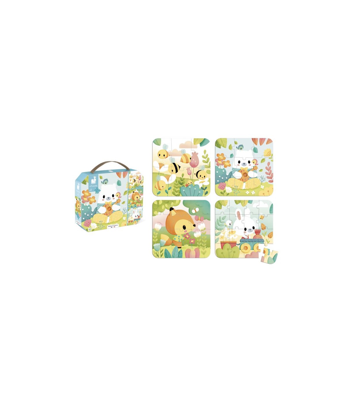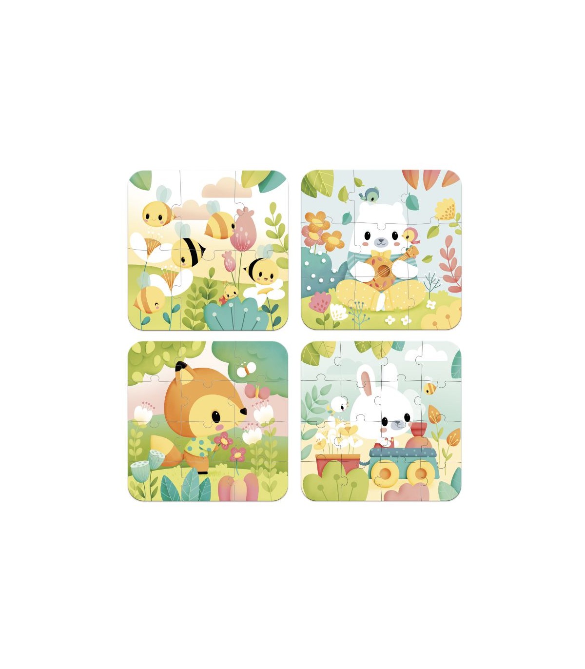 Empieza a aprender a hacer puzles con estos 4 bonitos puzles evolutivos de cartón con la temática de los animales. Compuestos por 6, 9, 12 y 16 piezas, su hijo irá progresando a su ritmo. Un color único en el dorso de cada puzle permitirá a su hijo encontrar las piezas correctas con mayor facilidad. Se transportan fácilmente gracias al bonito maletín. Estos puzles son ideales para desarrollar la paciencia y la motricidad fina. Puzles fabricados en Francia, con certificación FSCTM y a base de tintas vegetales. Puzles evolutivos para niños a partir de 2 años.