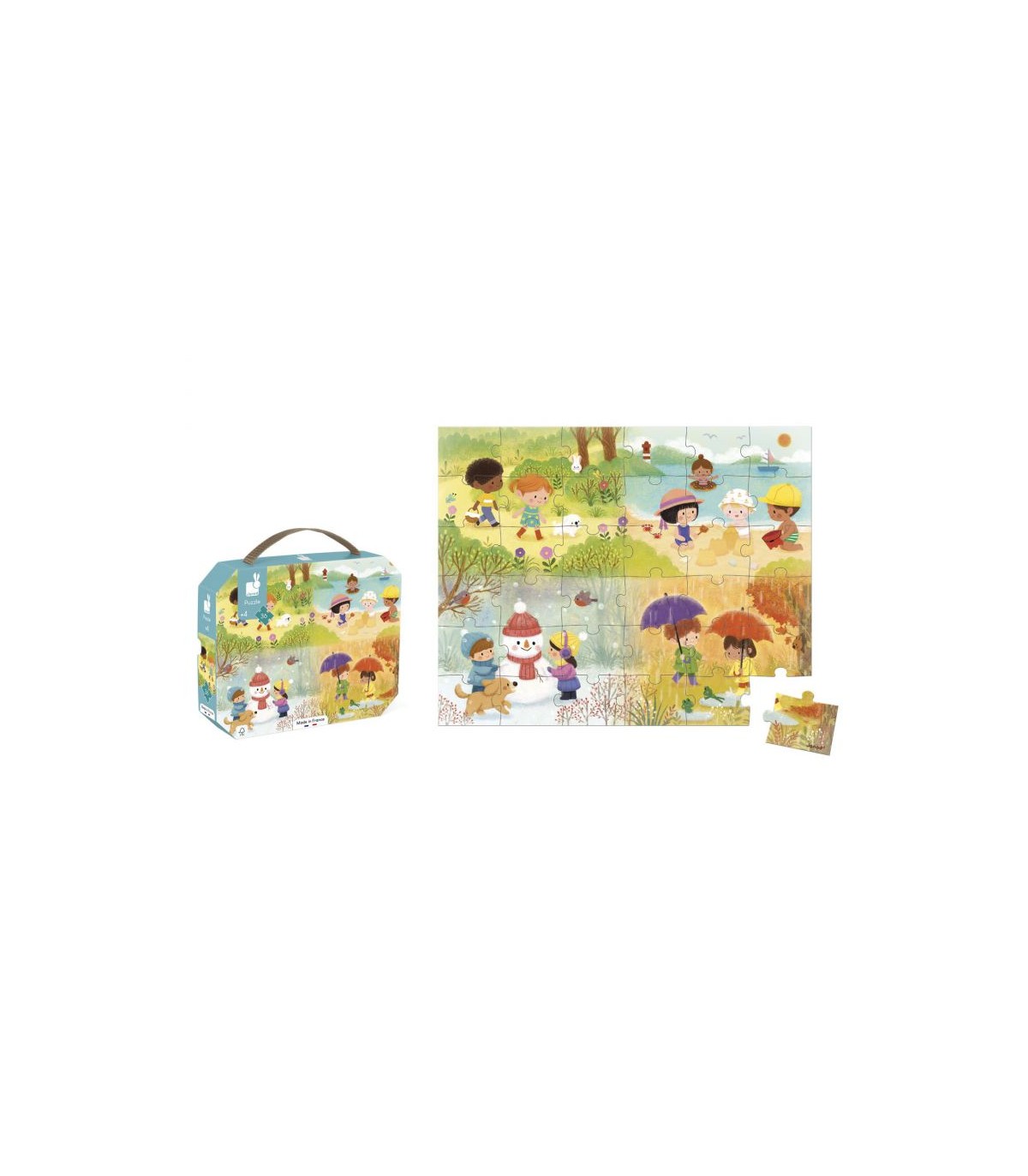¡Primavera, verano, otoño e invierno! ¡A descubrir las cuatro estaciones con este magnífico puzle de cartón de 36 piezas con un montón de detalles! El niño ejercitará la memoria y la destreza con este bonito puzle de cartón de 36 piezas. Este puzle se transporta fácilmente gracias a su bonito maletín y a su asa de tela. Contiene un póster que sirve como modelo para los principiantes. Los más avezados podrán a continuación realizar el puzle con total autonomía. Fabricado en Francia, producto FSC TM y hecho con tintas vegetales. Puzle para niños a partir de 4 años.