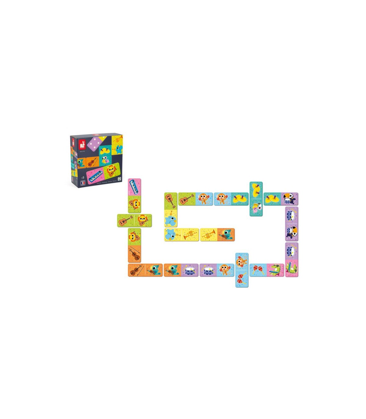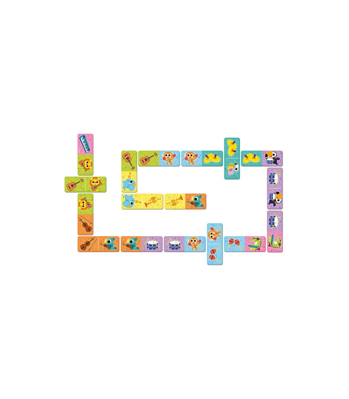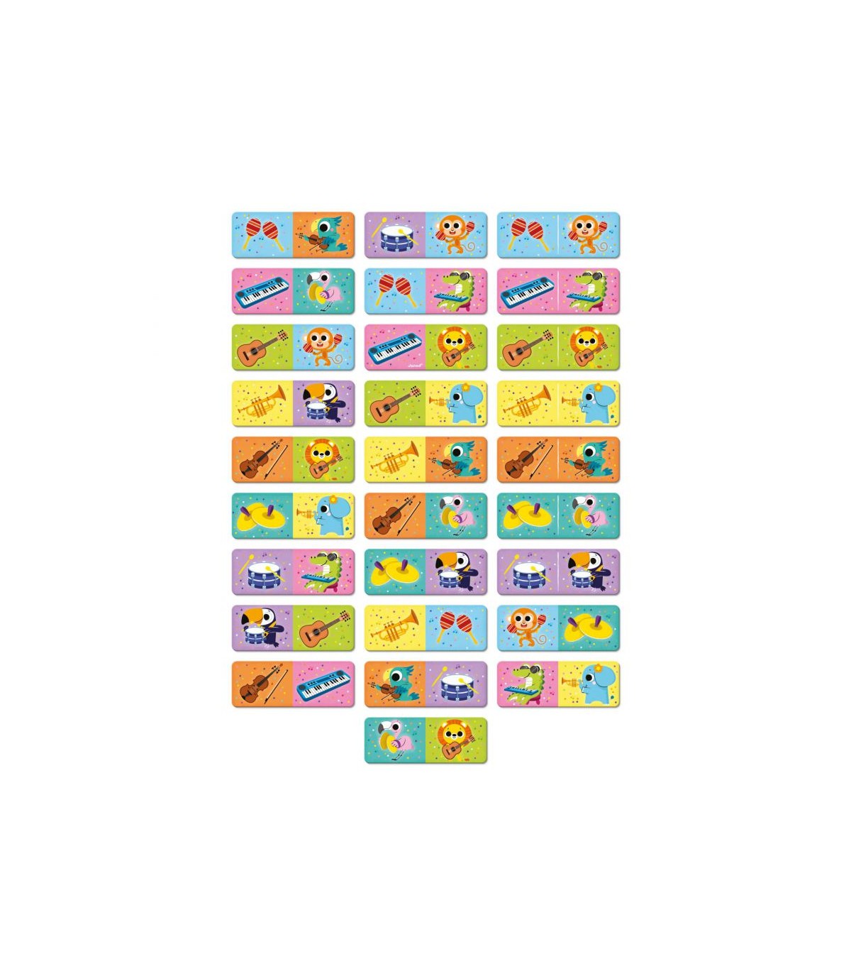 ¡Rápido, empieza a tocar la banda de música! Descubre los animales de la jungla y los instrumentos musicales. Compuesto por 28 piezas, este juego de dominó es muy divertido y educativo. Asocia un animal a otro igual o a su instrumento de música. Este juego también se juega con la constelación de un dado que figura en el reverso de las piezas. El juego del dominó es perfecto para estimular la capacidad de reflexionar. Fabricado en Francia, con certificación FSC y a base de tintas vegetales. Juego educativo para niños a partir de 3 años.