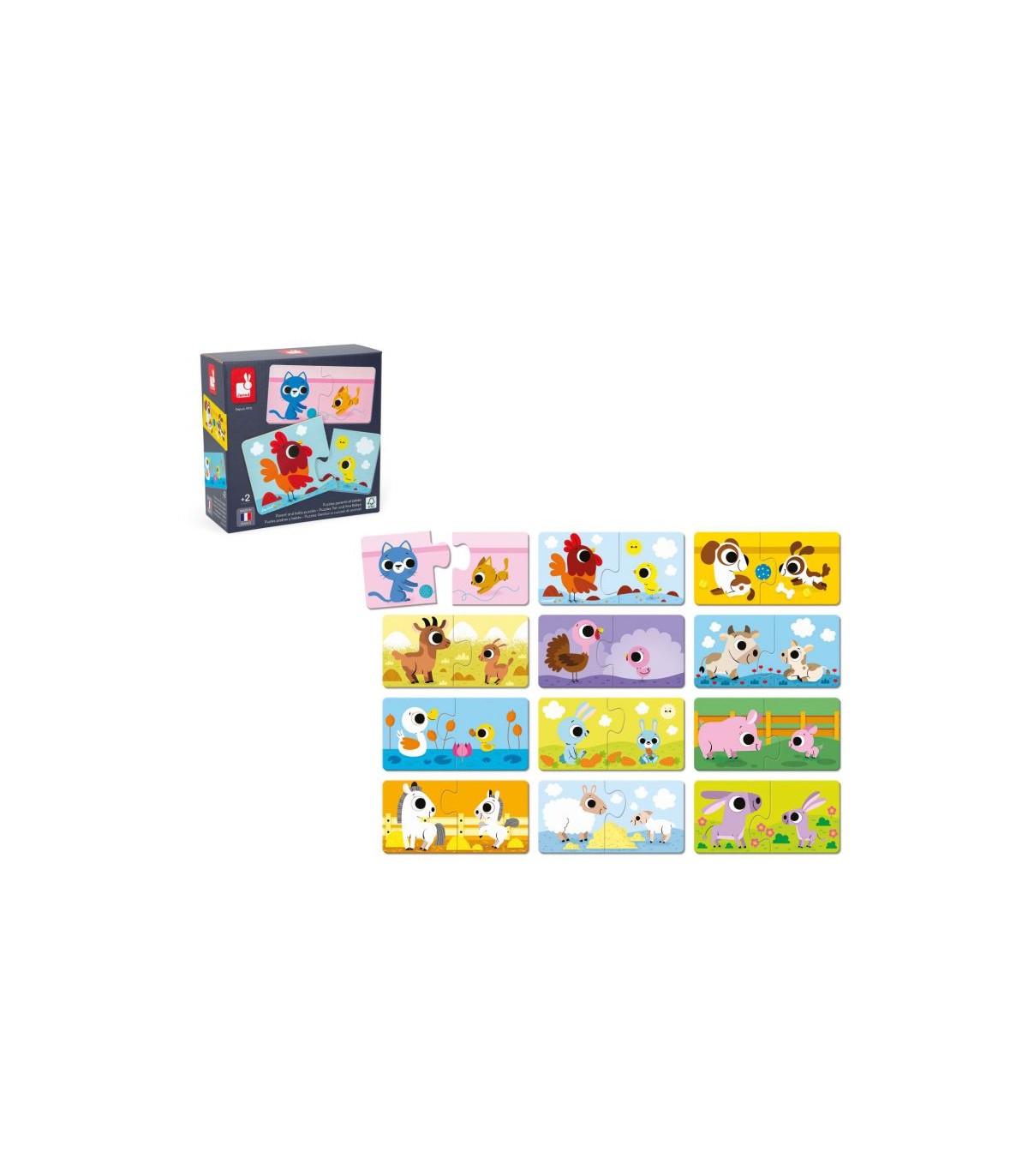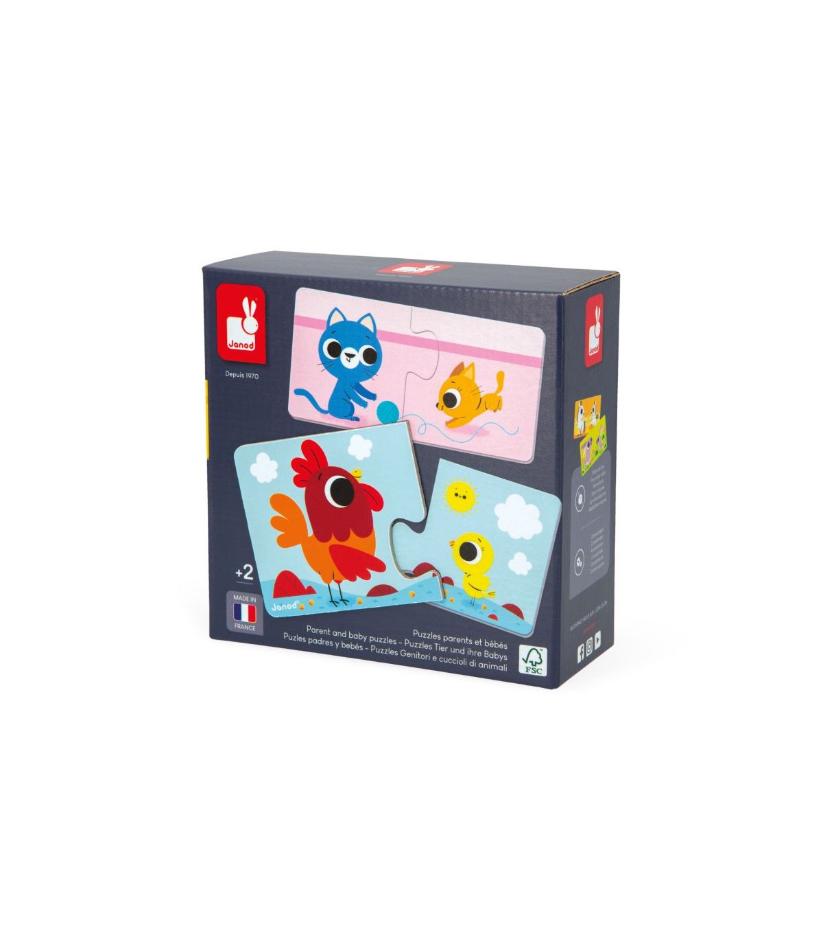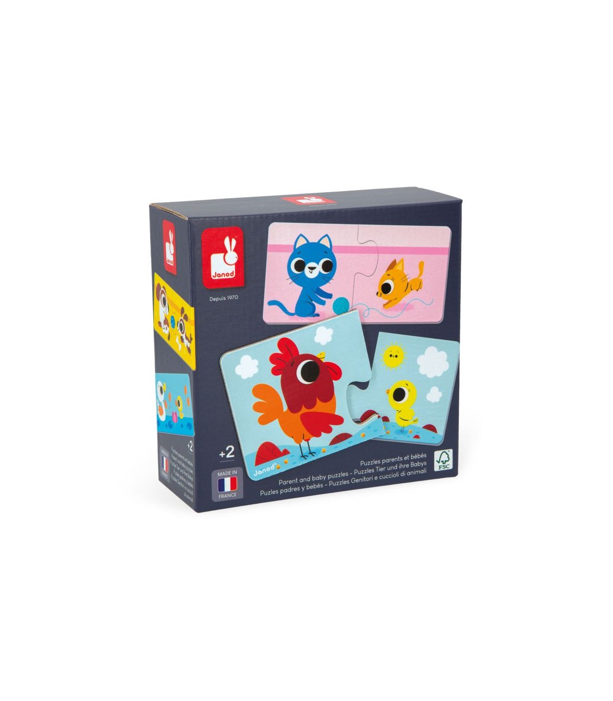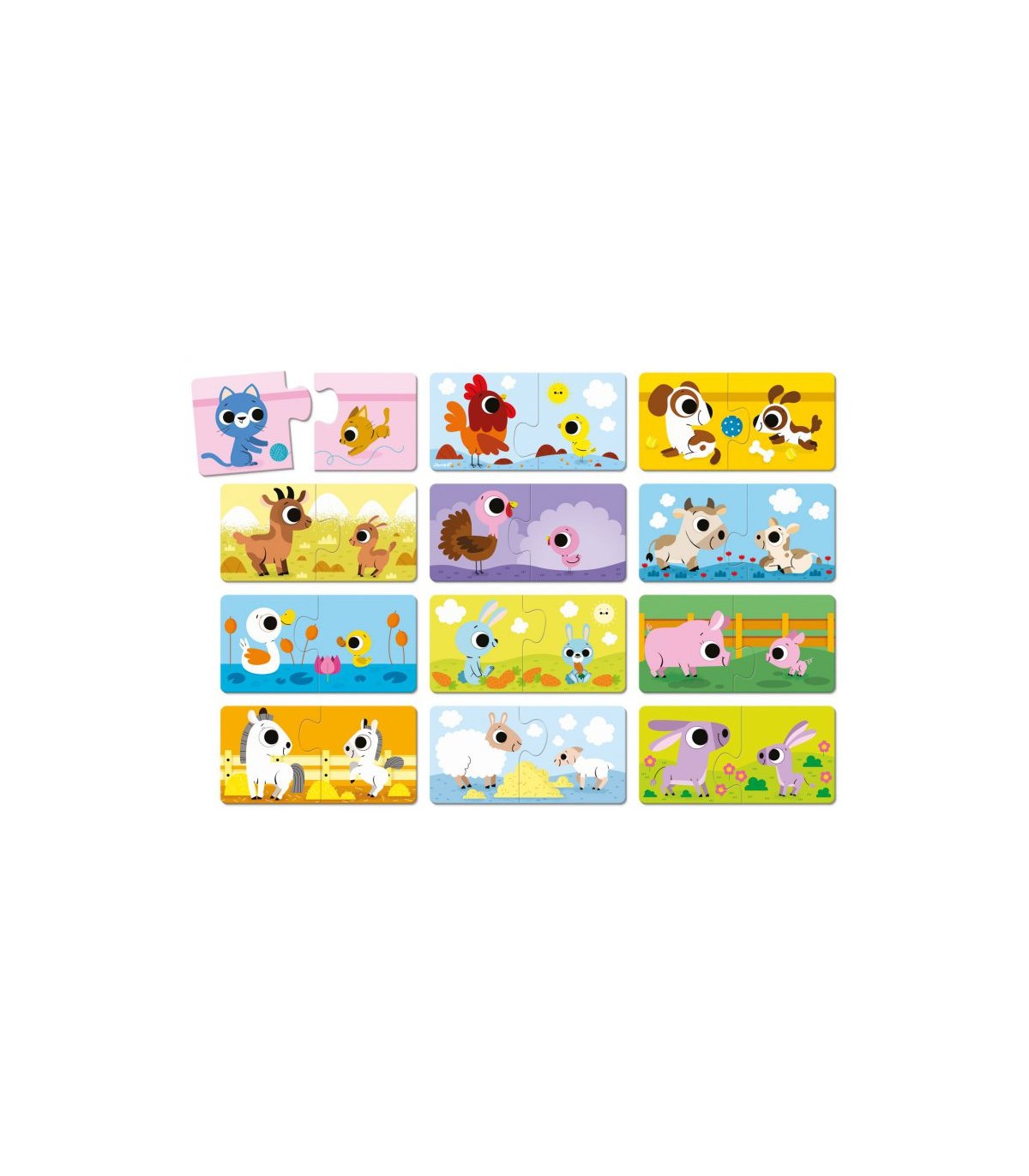 La cría de la gallina es el pollito. ¿Quién es el padre del gatito? Estos 12 puzles de 2 piezas con la temática de los animales de la granja permiten a su hijo empezar a aprender la asociación padres/bebés. Su hijo podrá enriquecer su vocabulario mientras mejora su capacidad de reflexionar. Fabricado en Francia, con certificación FSC y a base de tintas vegetales. Juego educativo para niños a partir de 2 años.