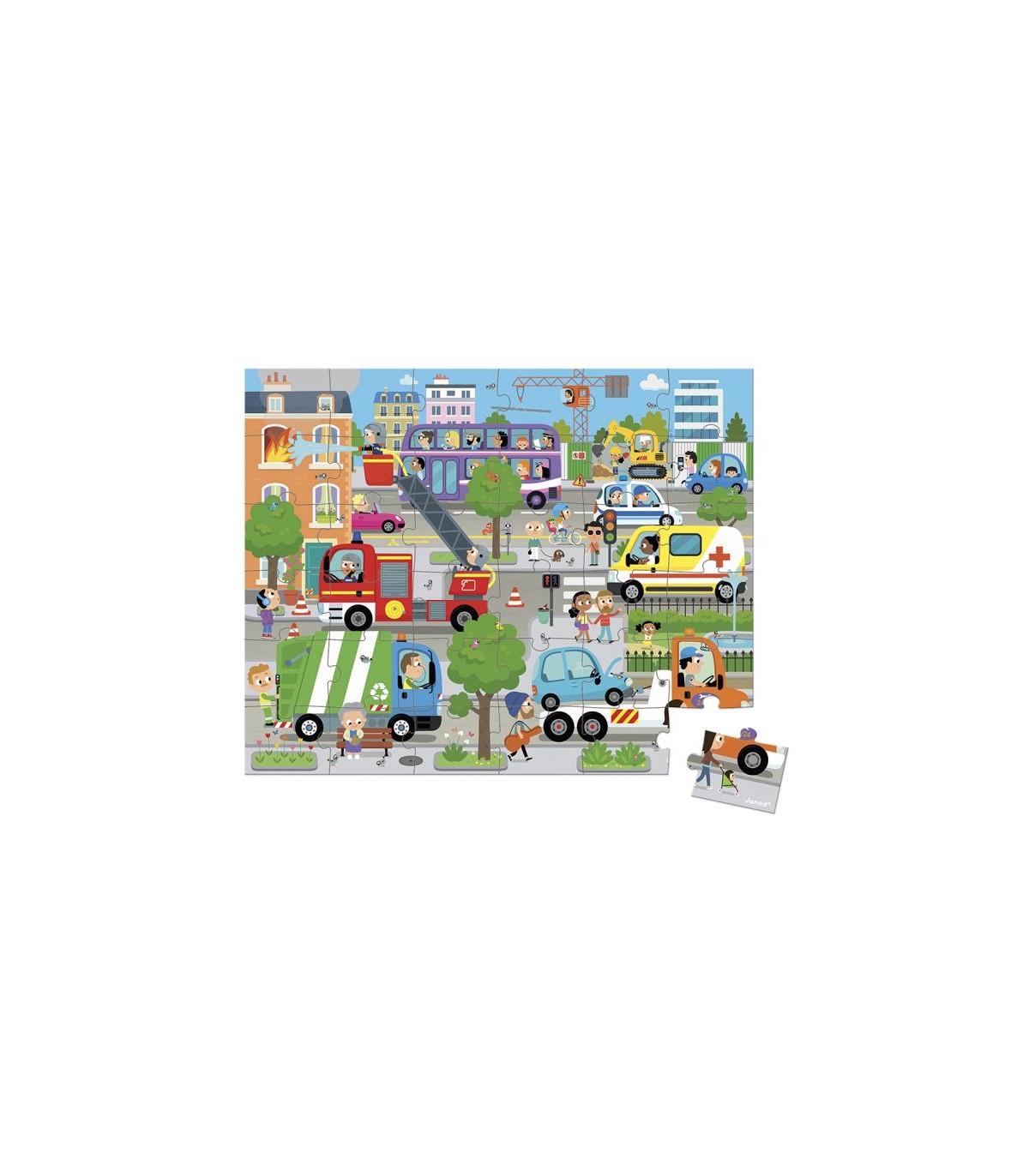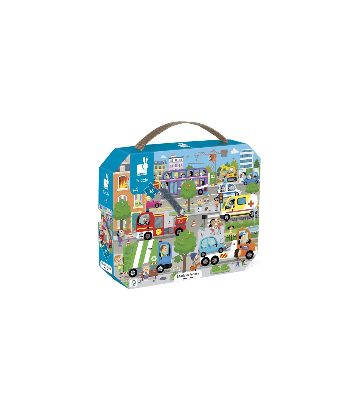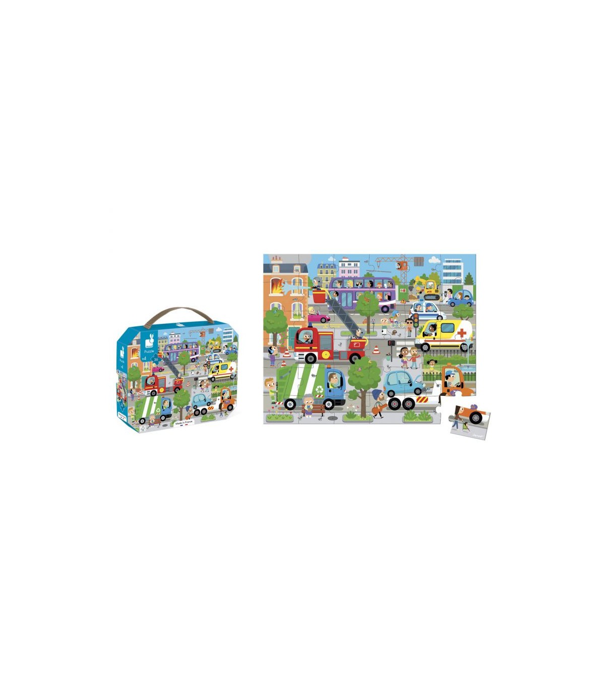 Con este puzle de cartón, su hijo(a) descubrirá la ciudad y su ambiente, a la vez que desarrolla su destreza y su concentración. Este puzle se transporta fácilmente gracias a su bonito maletín y a su asa de tela. Contiene un póster que sirve como modelo. Número de piezas: 36 Fabricado en Francia. Cartón con certificación FSC y tintas vegetales