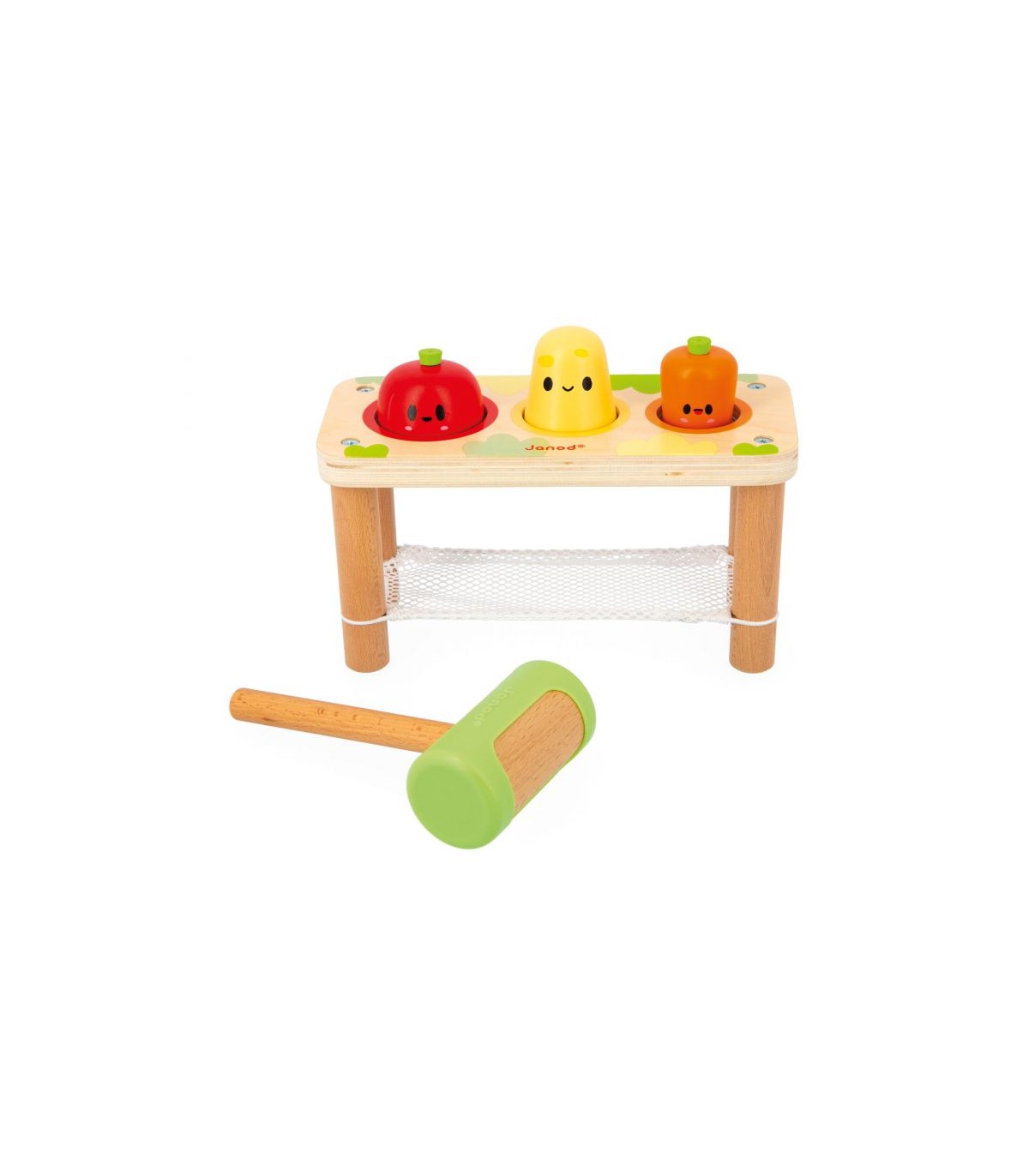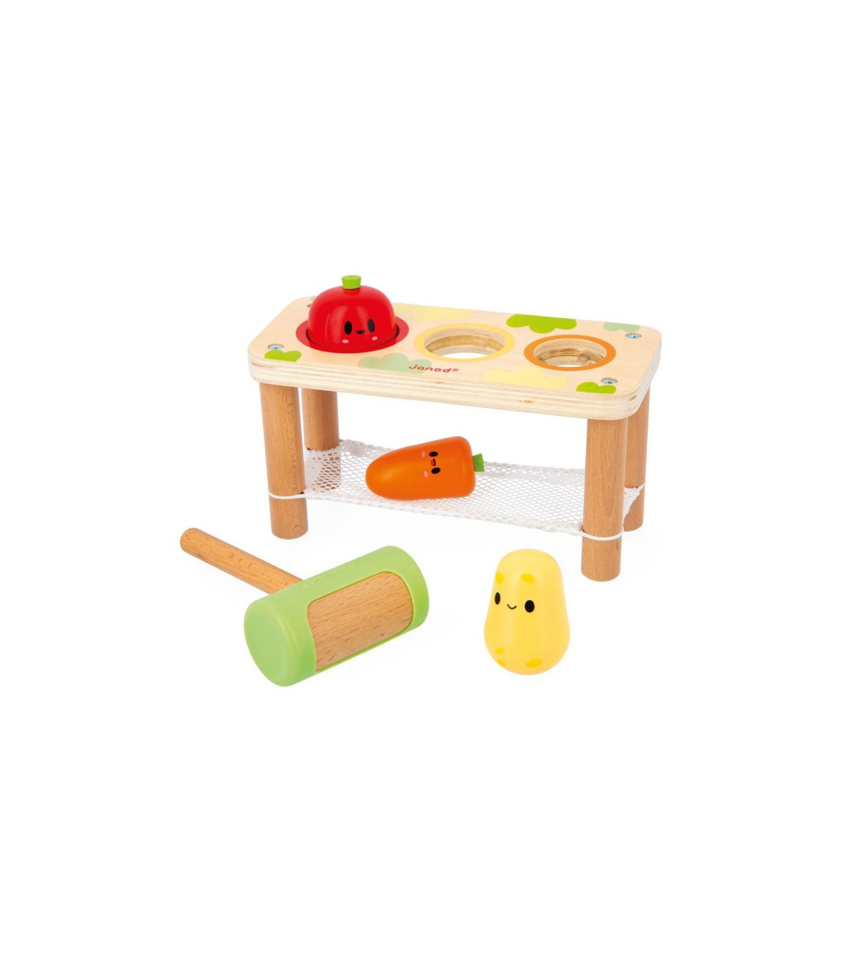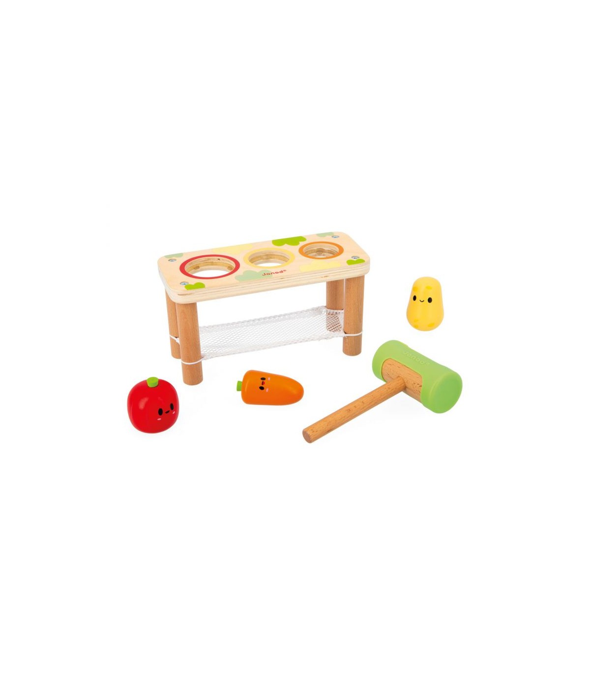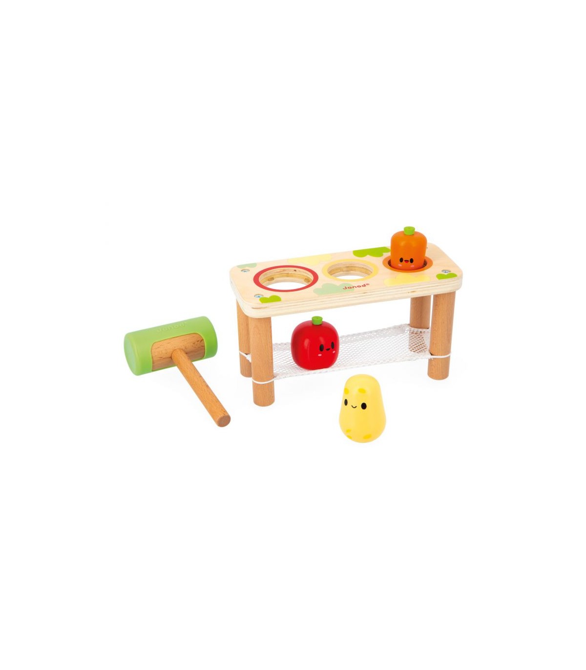 ¡Es hora de cosechar, diviértete dejando caer las verduras en su red! El juguete está compuesto por un soporte con una red, un tomate, una patata, una zanahoria y un martillo de madera. El objetivo del juego es colocar cada verdura en su lugar y luego hacer que caiga en la red golpeándola con el martillo. ¡Práctico! Gracias a su funda de silicona, el martillo limita el ruido durante el juego. Este juguete permitirá a su hijo familiarizarse con las verduras y desarrollar su destreza mientras se divierte. ¡Ideal para pasar momentos de risas y aprendizaje! Juguete de madera FSCTM. Juguetes de estimulación para niños a partir de 12 meses.