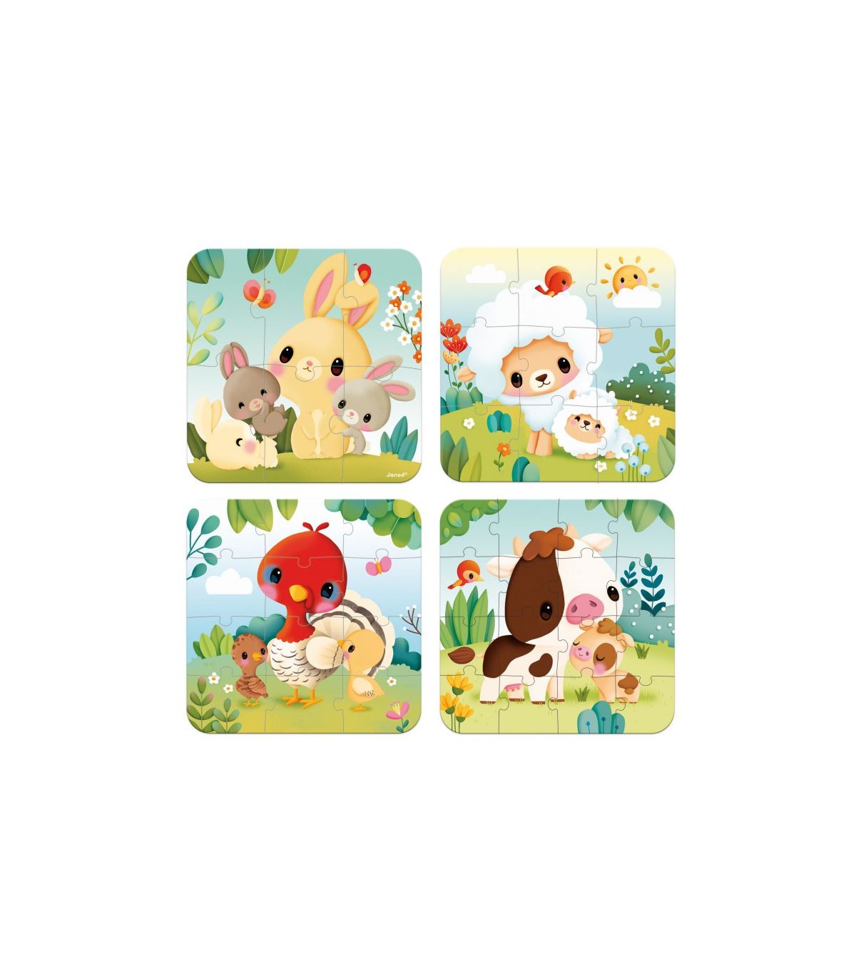¿Qué hay mejor que un paseo por el campo para observar los animales de la granja y sus crías? Con estos 4 puzles evolutivos, su hijo podrá reconstruir diferentes escenas que ilustran un conejo y sus conejitos, una oveja y su cordero, una vaca y su ternero, así como un pavo y sus pavitos. Los puzles tienen un número evolutivo de piezas para ayudar al niño en su progreso. De esta forma, puede comenzar con un puzle de 6 piezas y continuar después con un puzle de 9 piezas. Una vez que su hijo se sienta cómodo con estos dos primeros puzles, podrá continuar con los puzles de 12 y 16 piezas. ¡Práctico, la parte posterior de cada puzle es de un color diferente para ayudar al niño a encontrar las piezas correctas!