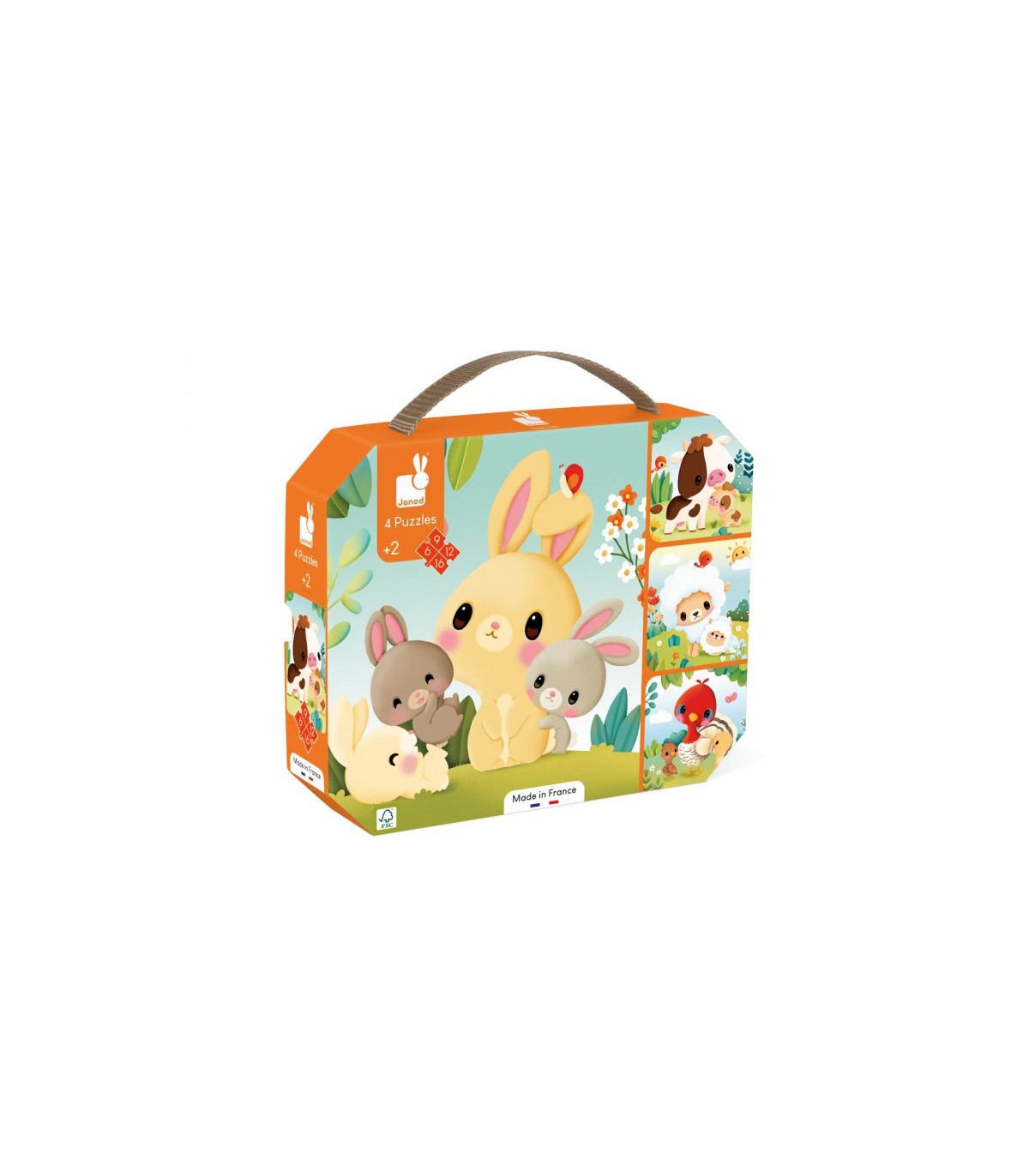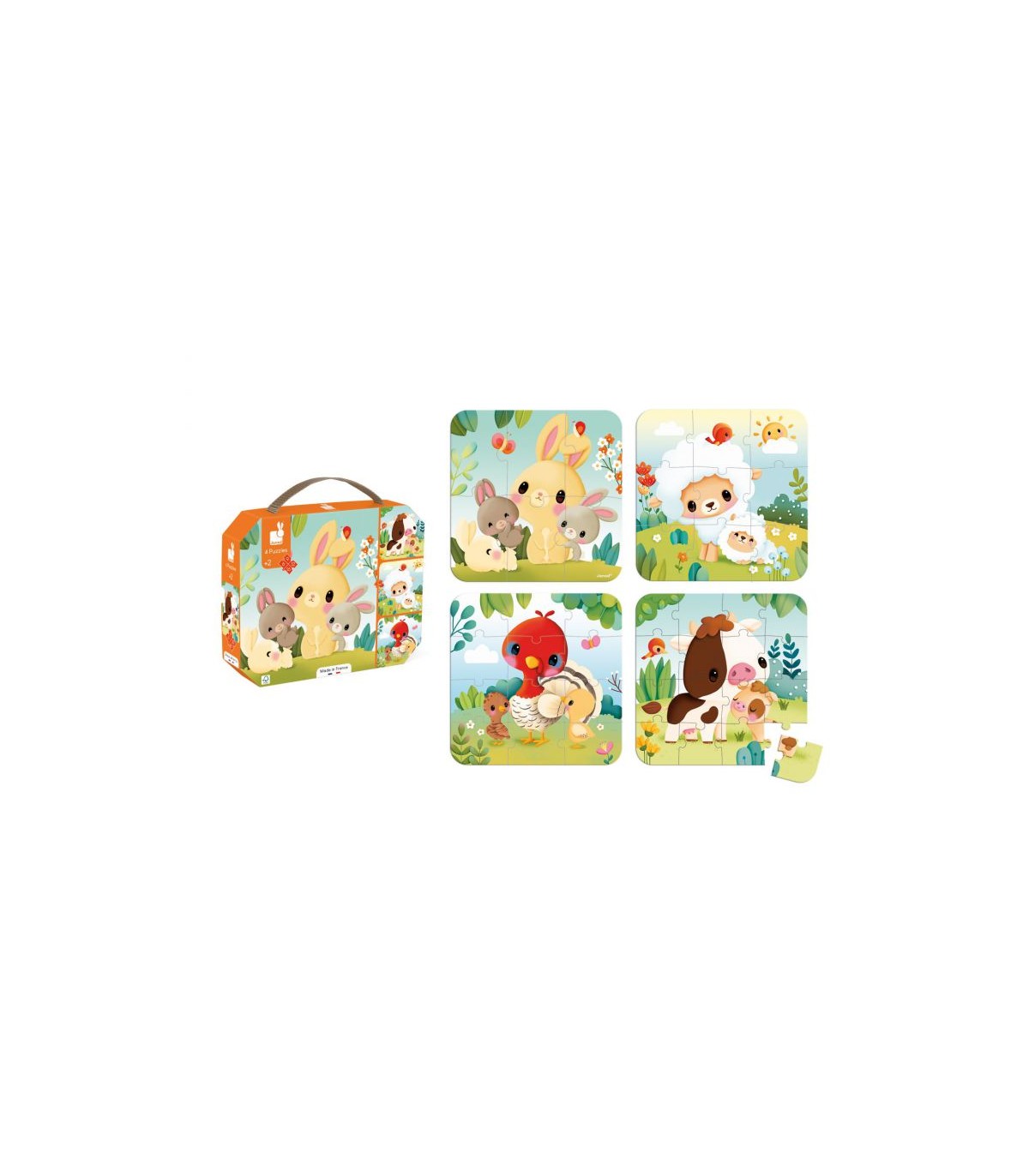 ¿Qué hay mejor que un paseo por el campo para observar los animales de la granja y sus crías? Con estos 4 puzles evolutivos, su hijo podrá reconstruir diferentes escenas que ilustran un conejo y sus conejitos, una oveja y su cordero, una vaca y su ternero, así como un pavo y sus pavitos. Los puzles tienen un número evolutivo de piezas para ayudar al niño en su progreso. De esta forma, puede comenzar con un puzle de 6 piezas y continuar después con un puzle de 9 piezas. Una vez que su hijo se sienta cómodo con estos dos primeros puzles, podrá continuar con los puzles de 12 y 16 piezas. ¡Práctico, la parte posterior de cada puzle es de un color diferente para ayudar al niño a encontrar las piezas correctas! Puzles evolutivos de 6, 9, 12 y 16 piezas fabricados en Francia, con certificación FSC y a base de tinta vegetal. Puzles de cartón para niños a partir de 2 años.
